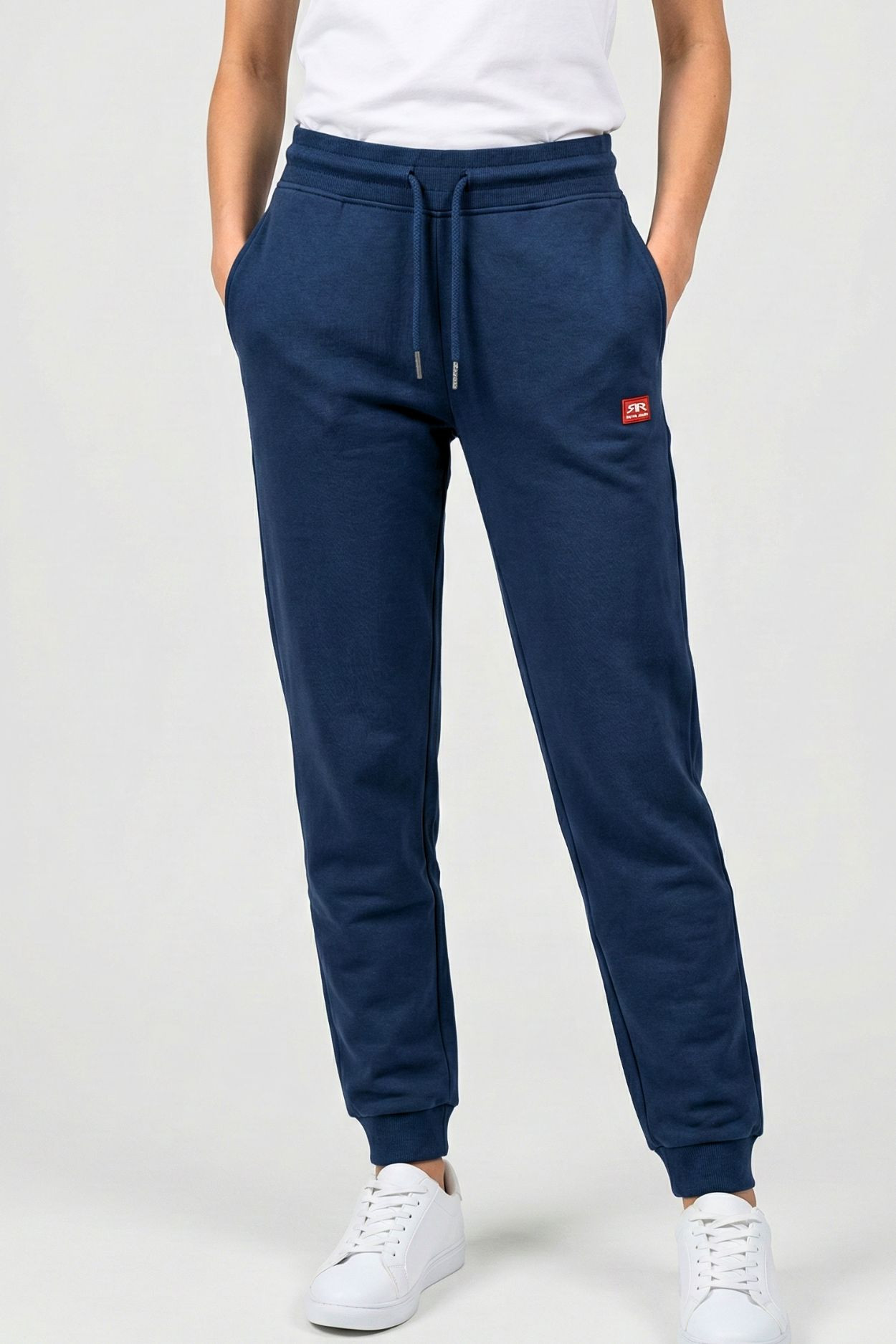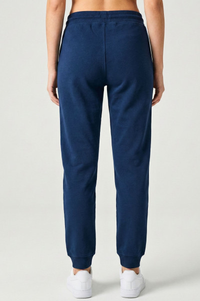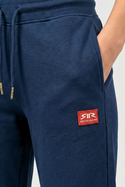 RetroJeans női jogging nadrág, sötétkék színben, gumis és megkötős derékrésszel, oldalzsebekkel, alján passzéval, zsebénél rávarrt szilikon márkajelzéssel.