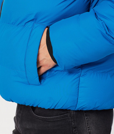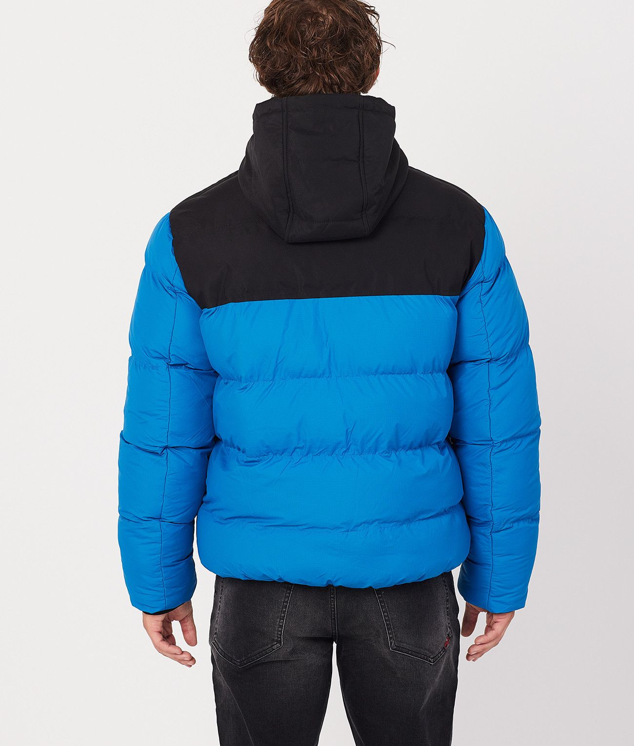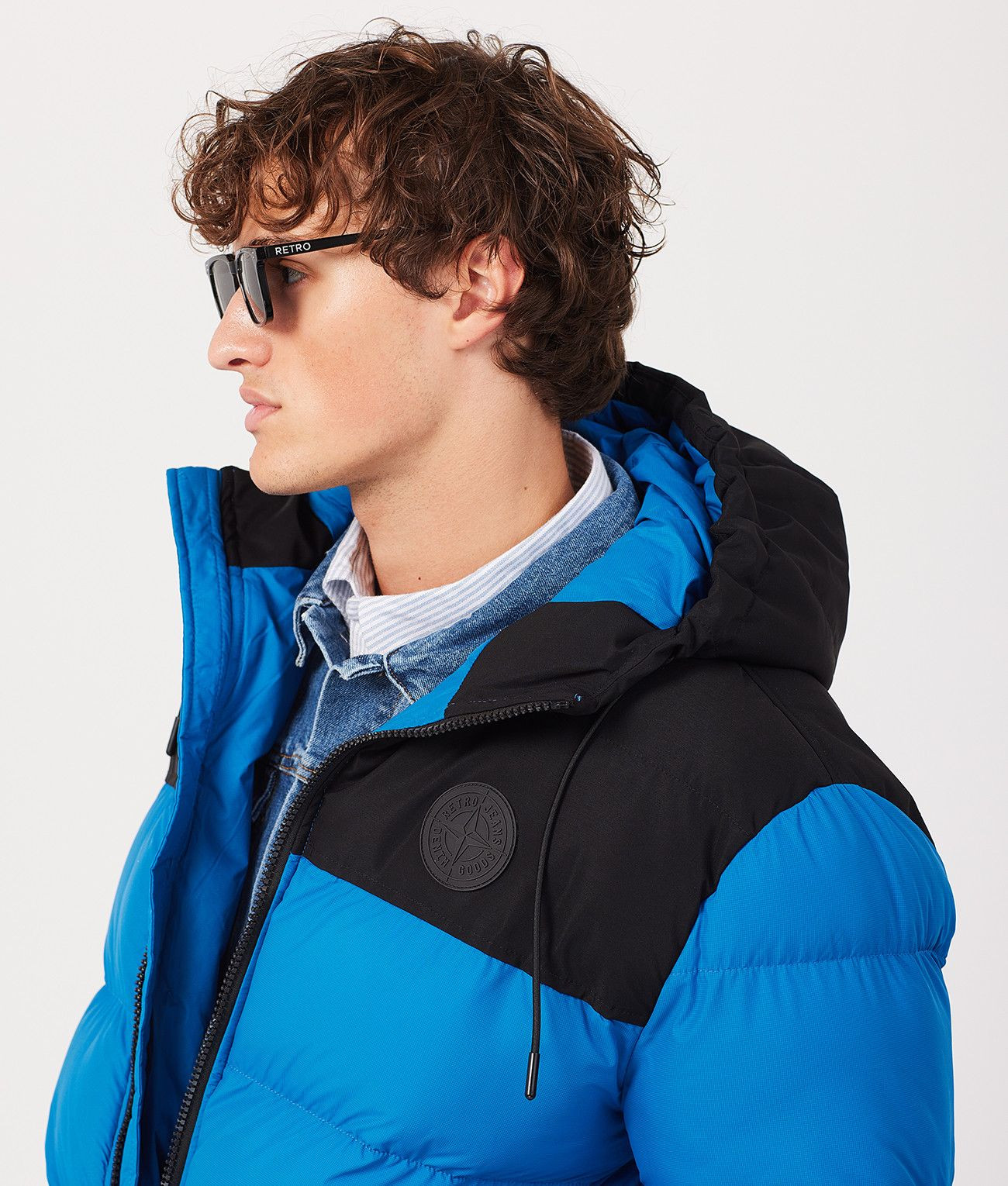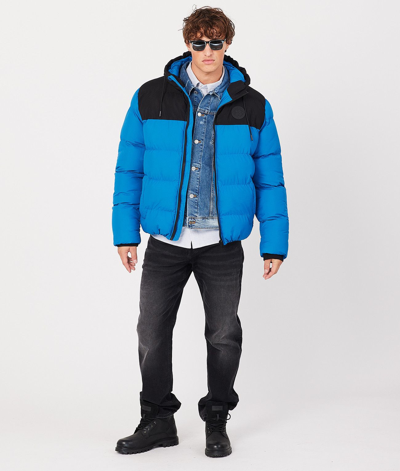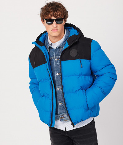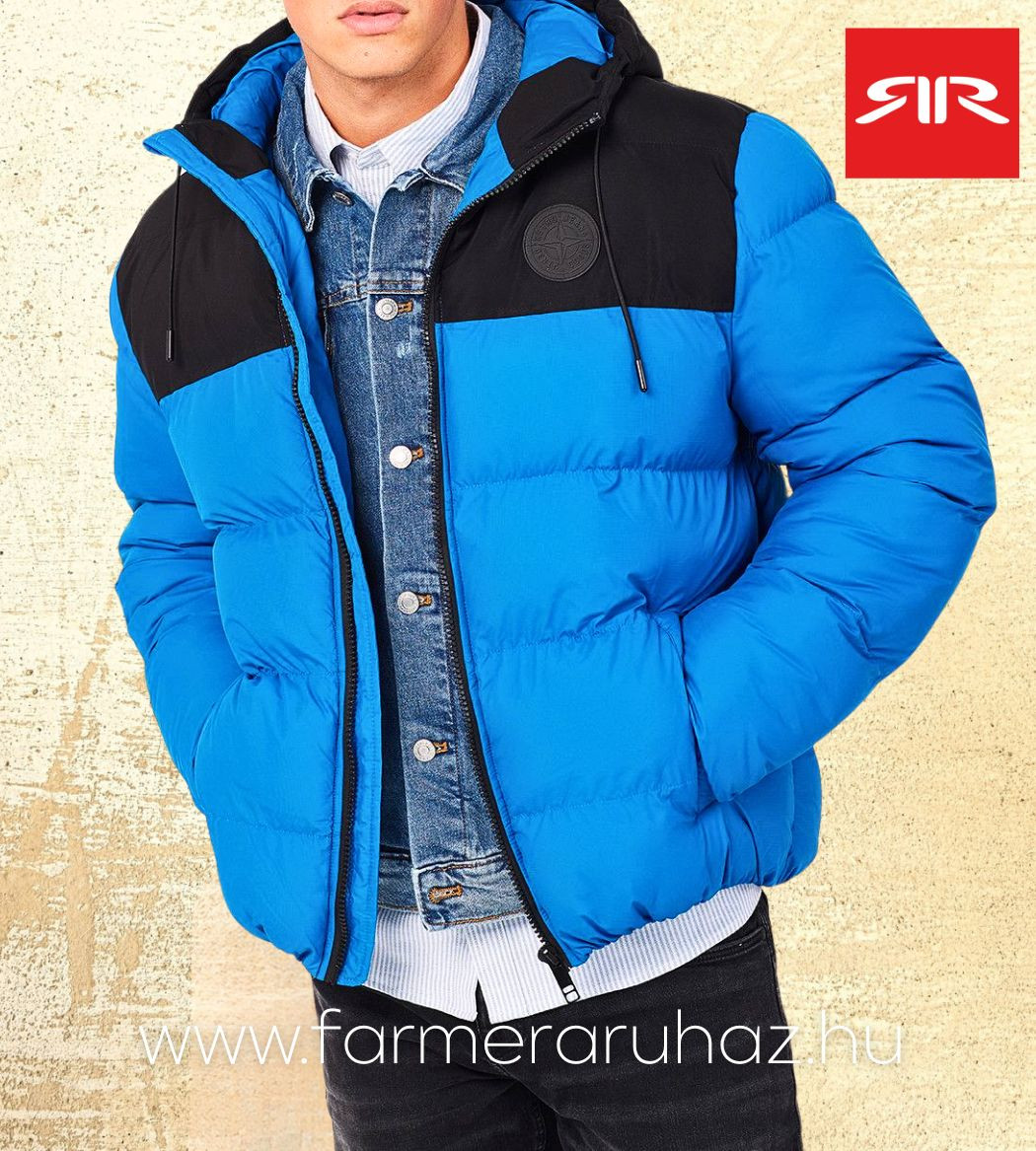 RetroJeans férfi steppelt dzseki, kék színben, kapucnival és állógallérral, gumírozott kézelővel, oldalzsebekkel, egy nagy mérető patentos záródású belső zsebbel, elején cipzáras záródással é gumírozott márkajelzéssel.