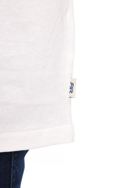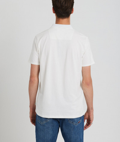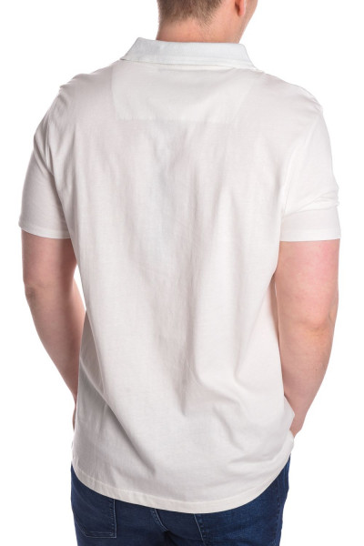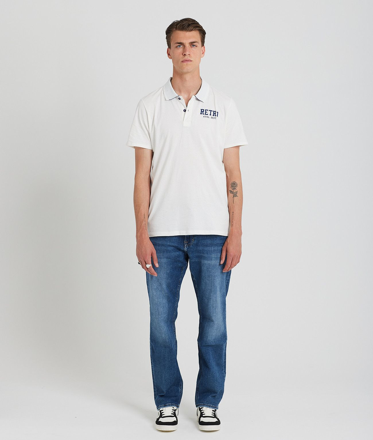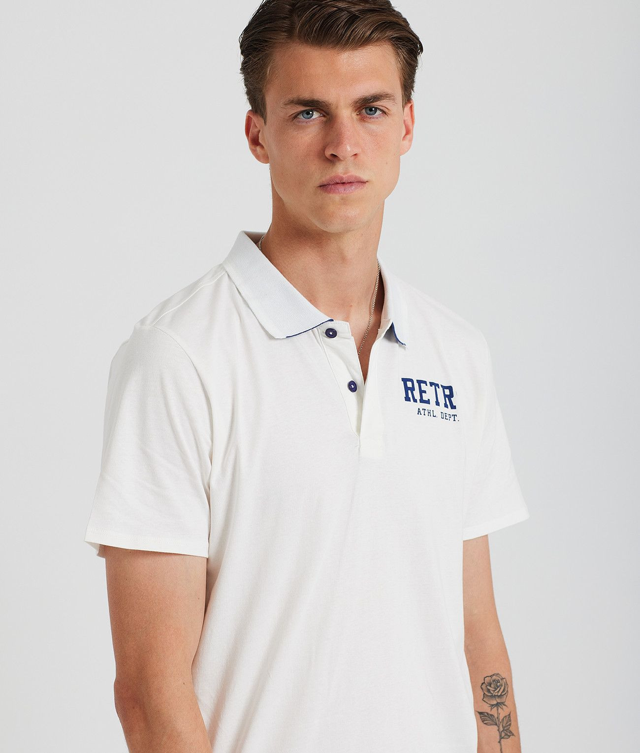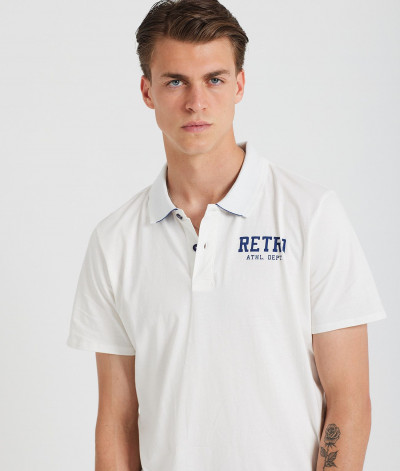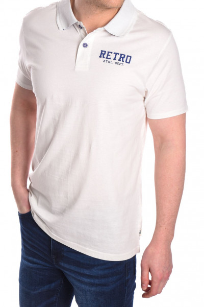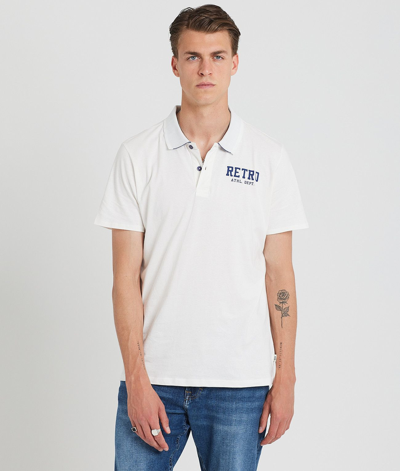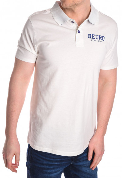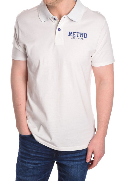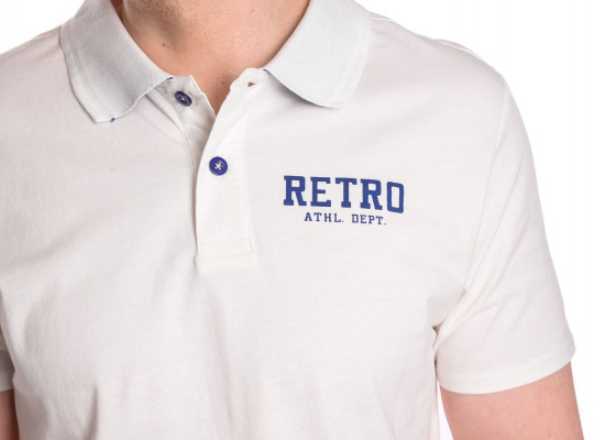 RetroJeans férfi galléros póló, törtfehér színben; bordás passzés nyakkal; gombolópánttal; oldalán rávarrt textil, mell részén kontrasztos filmnyomott felirattal és márkajelzéssel.