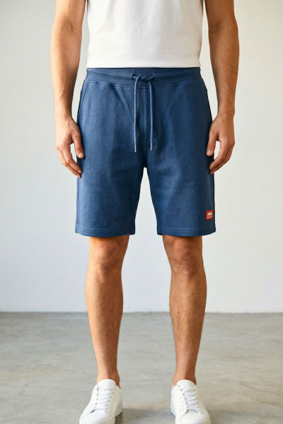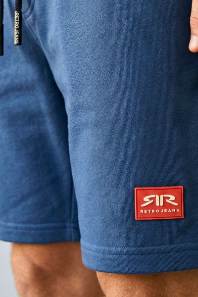 RetroJeans jogging short, sötétkék színben, gumis és megkötős derékrésszel, oldal- és farzsebbel, elején rávarrt gumírozott márkajelzéssel.