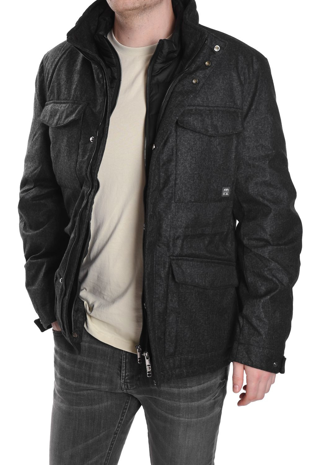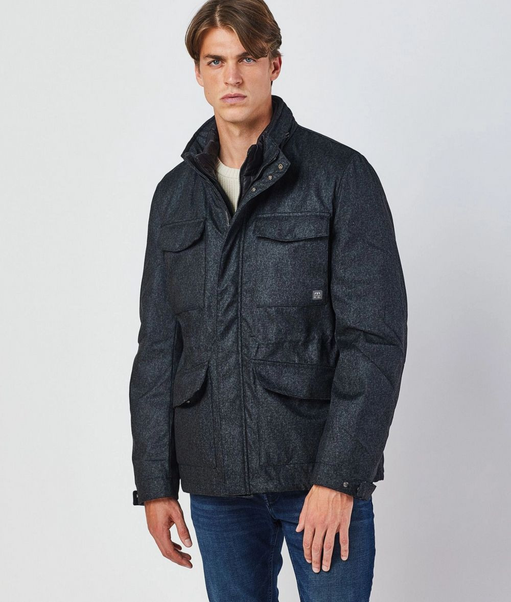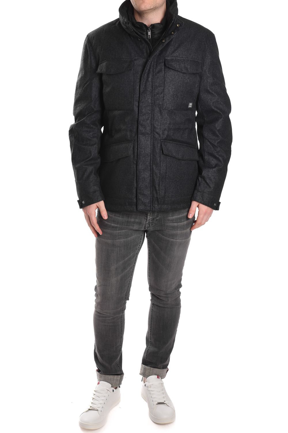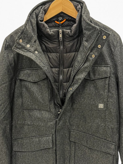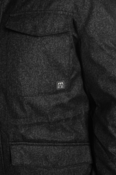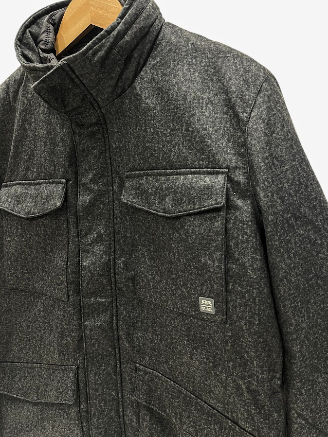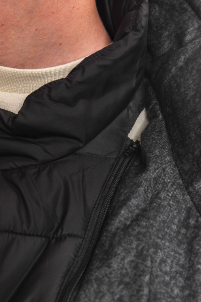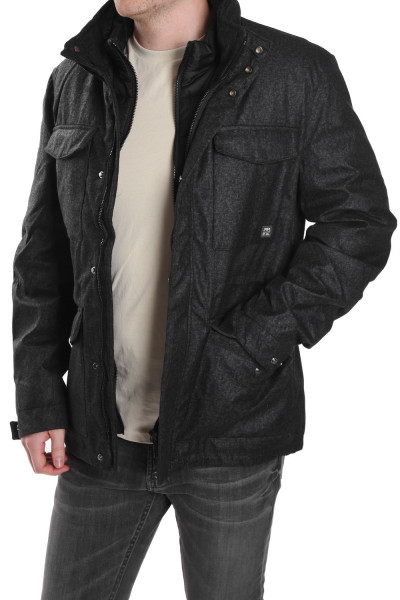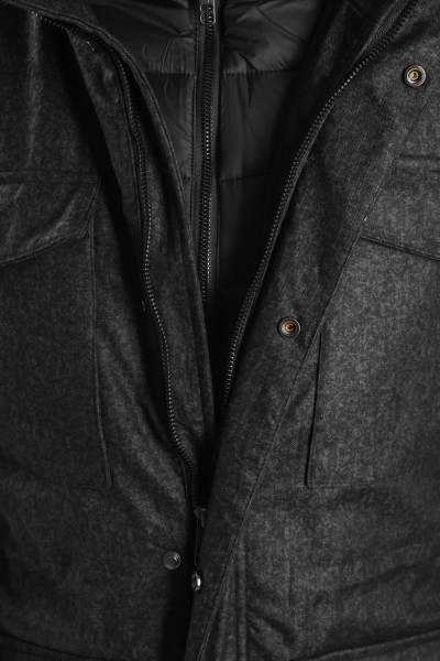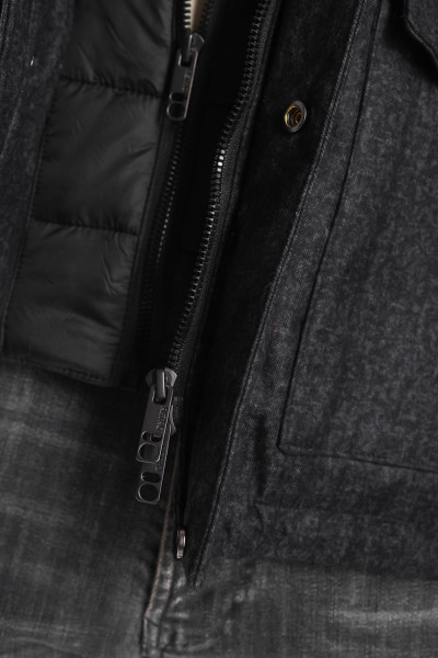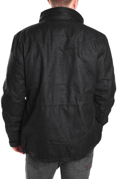 RetroJeans férfi kabát, szürke színben, galláros benne rejtett kapucnival, zipzáras és patentos záródással, mell és oldalzsebekkel rajta márkajelzéssel.