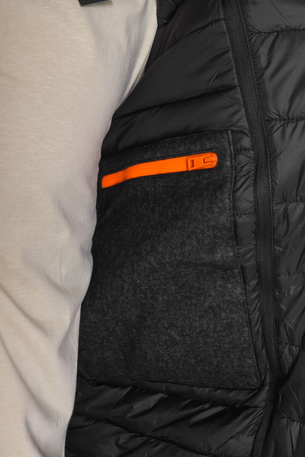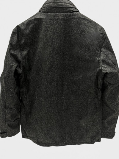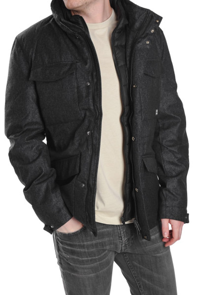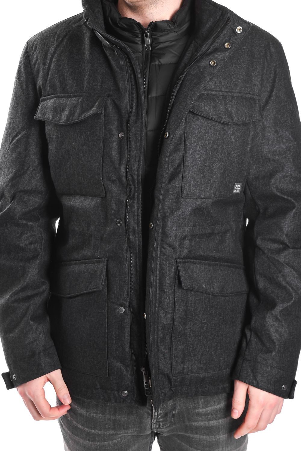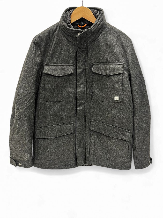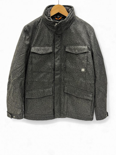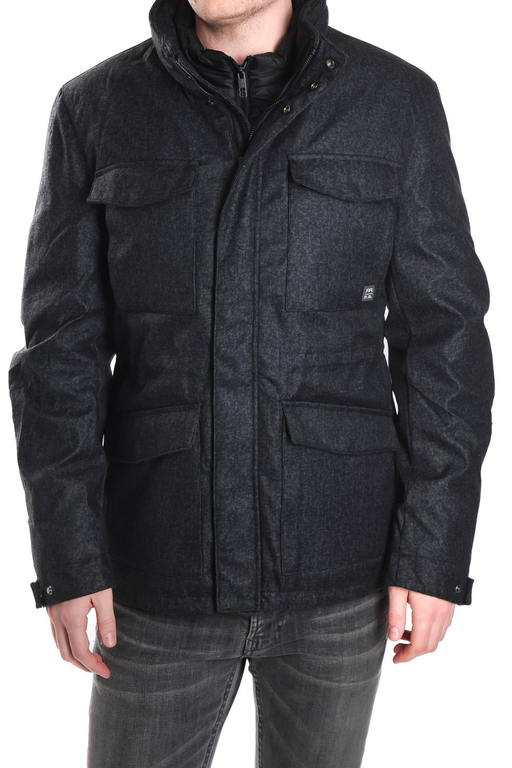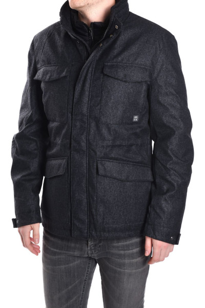 RetroJeans férfi kabát, szürke színben, galláros benne rejtett kapucnival, zipzáras és patentos záródással, mell és oldalzsebekkel rajta márkajelzéssel.