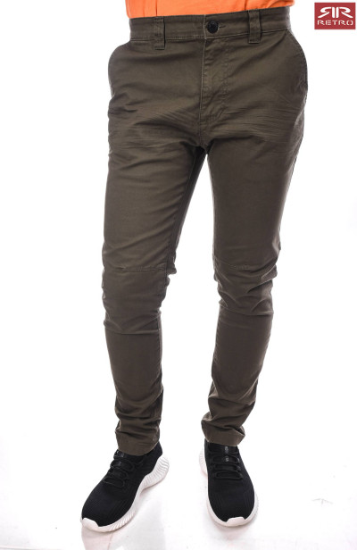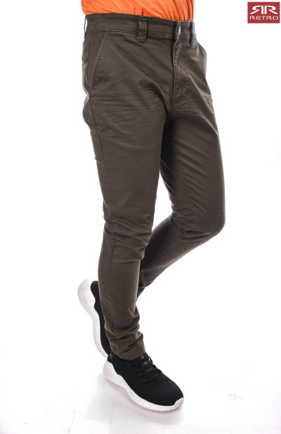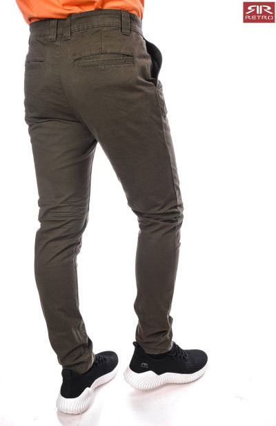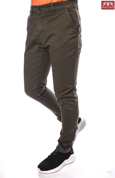 RetroJeans férfi vászon nadrág khaki színben, oldal- és farzsebes, elején gombos és cipzáros záródással, övbújtatós derékrésszel, térdénél szűkítő varrásokkal; dísztűzésekkel, farzsebén hímzett márkajelzéssel az őszi/téli RetroJeans kollekcióból.