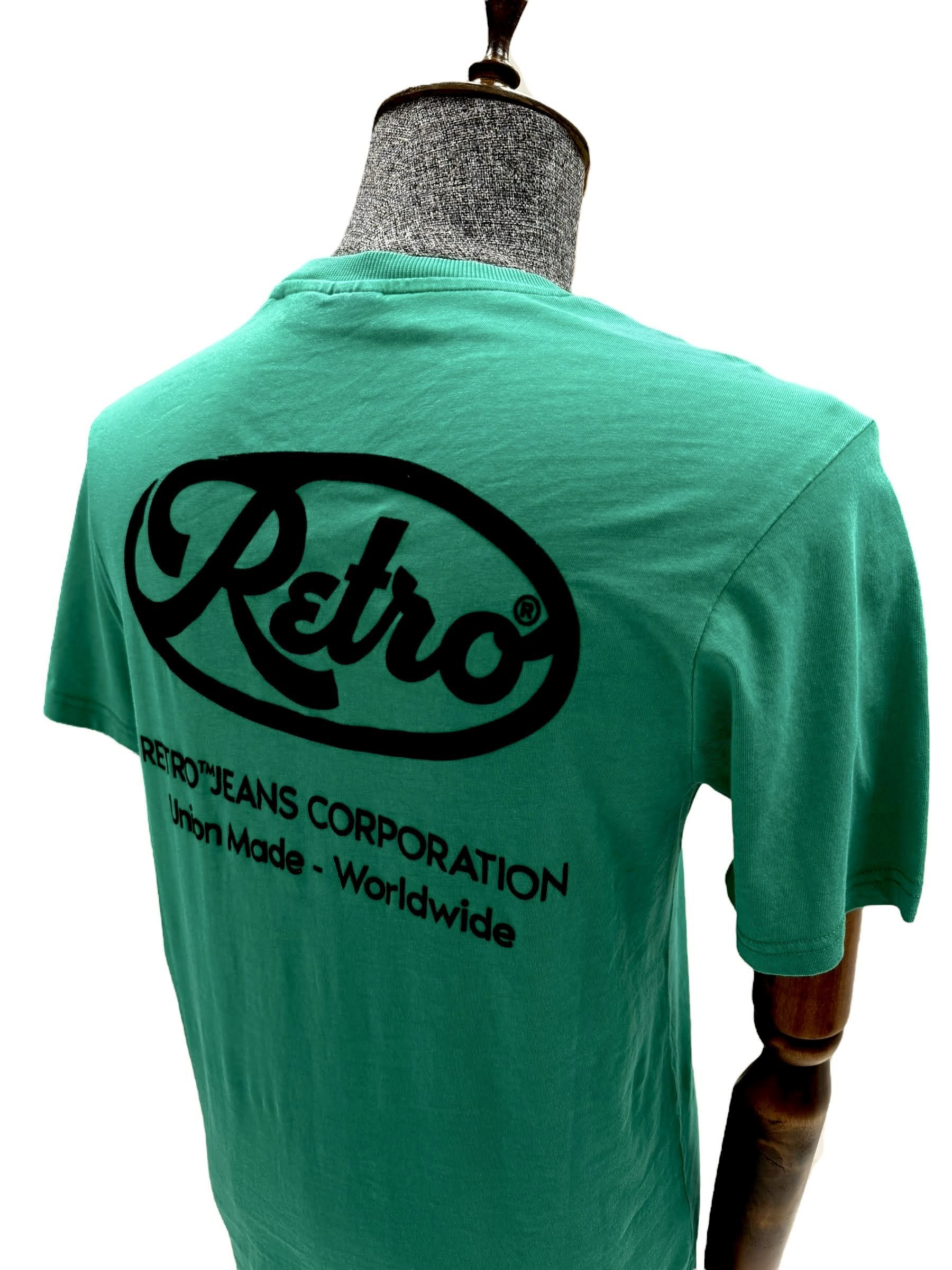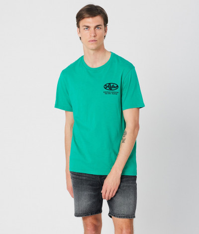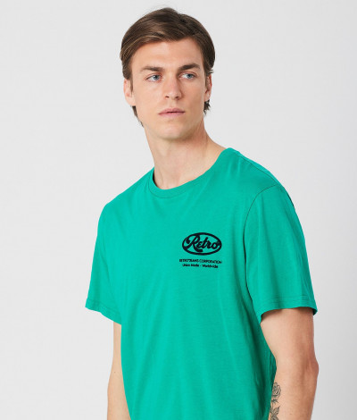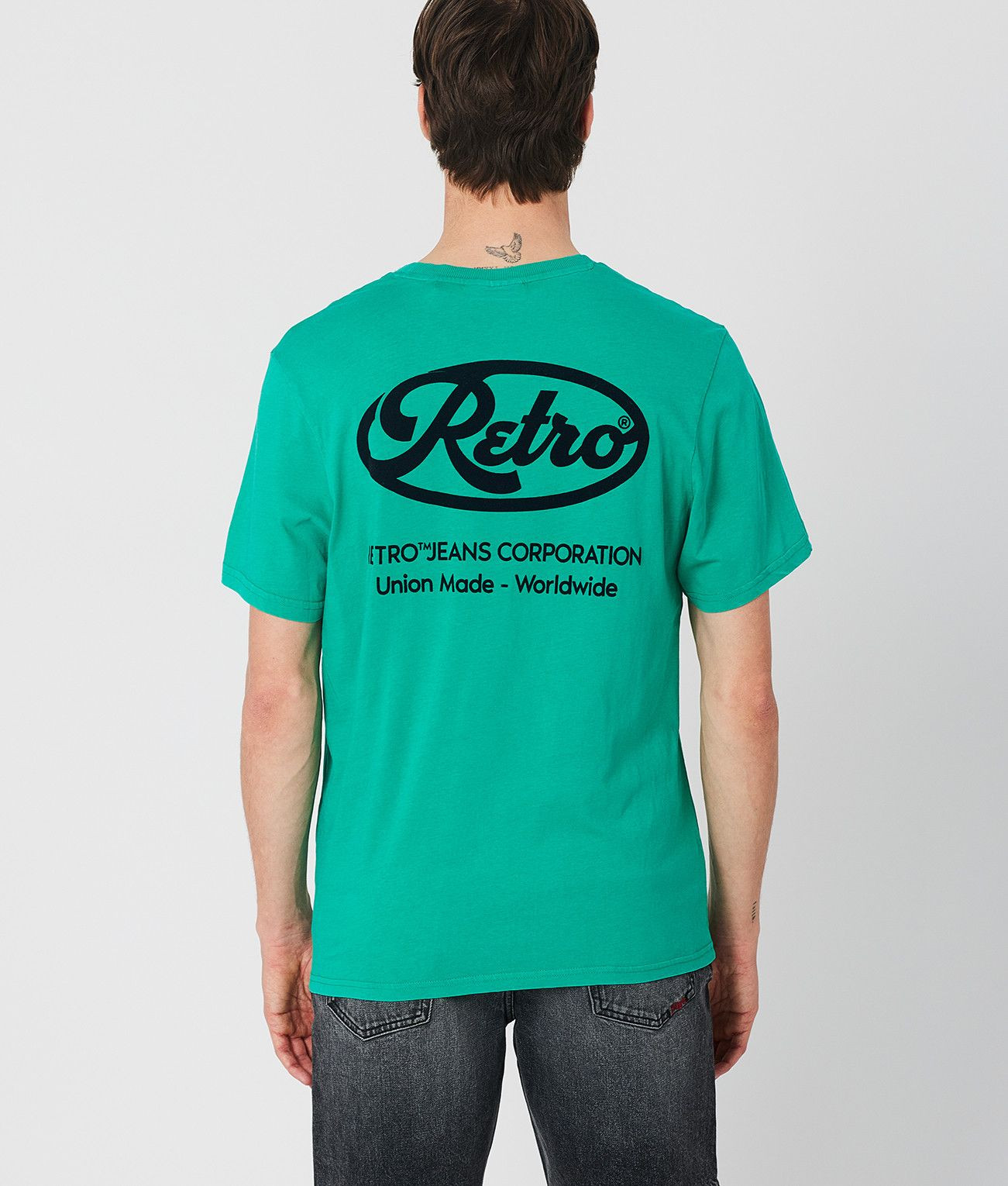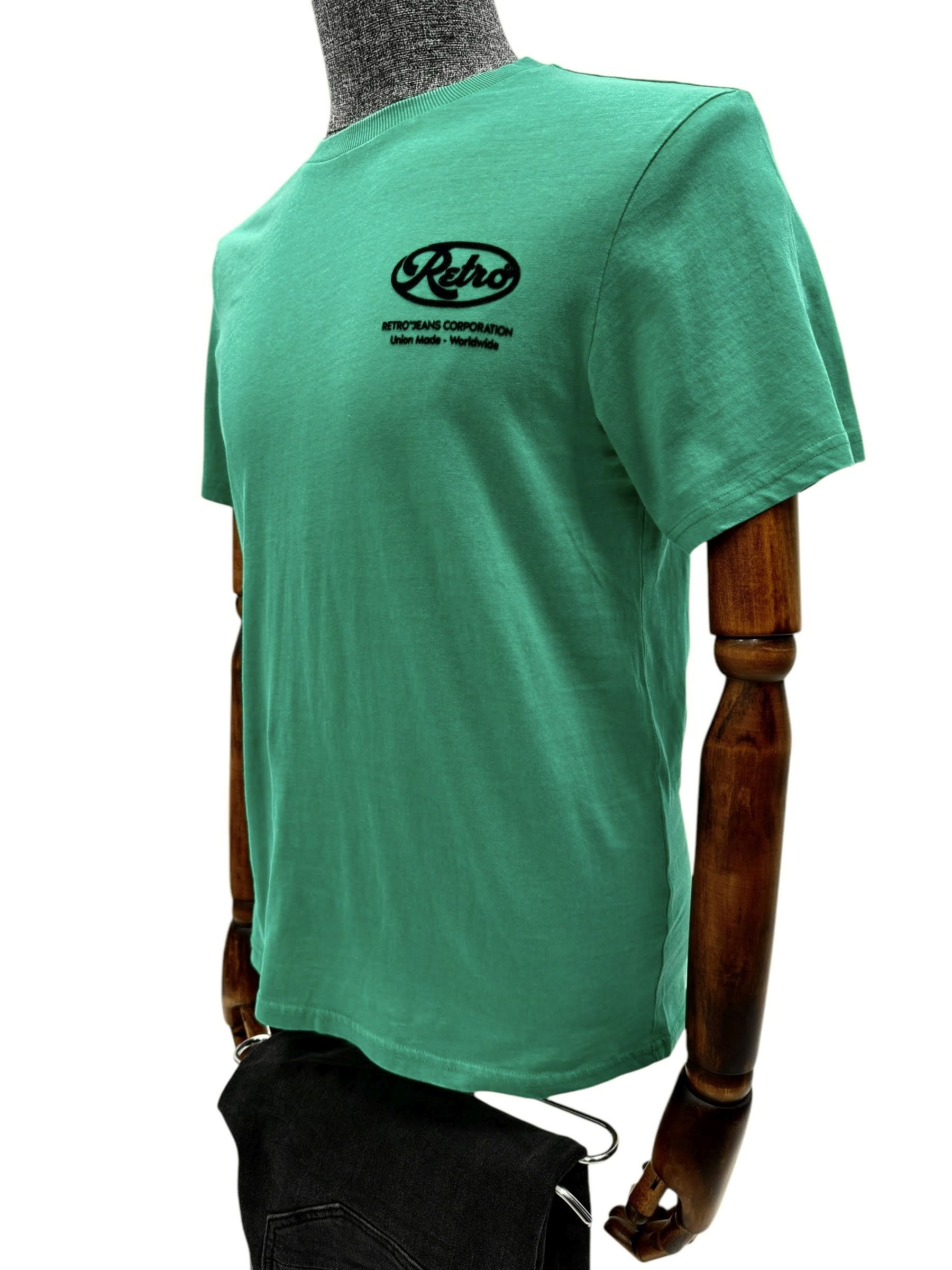 RetroJeans férfi póló, mosott zöld színben, kerek nyakkivágással, normál - egyenes - szabással, mell részén és hátán flokkolt márkajelzéssel.