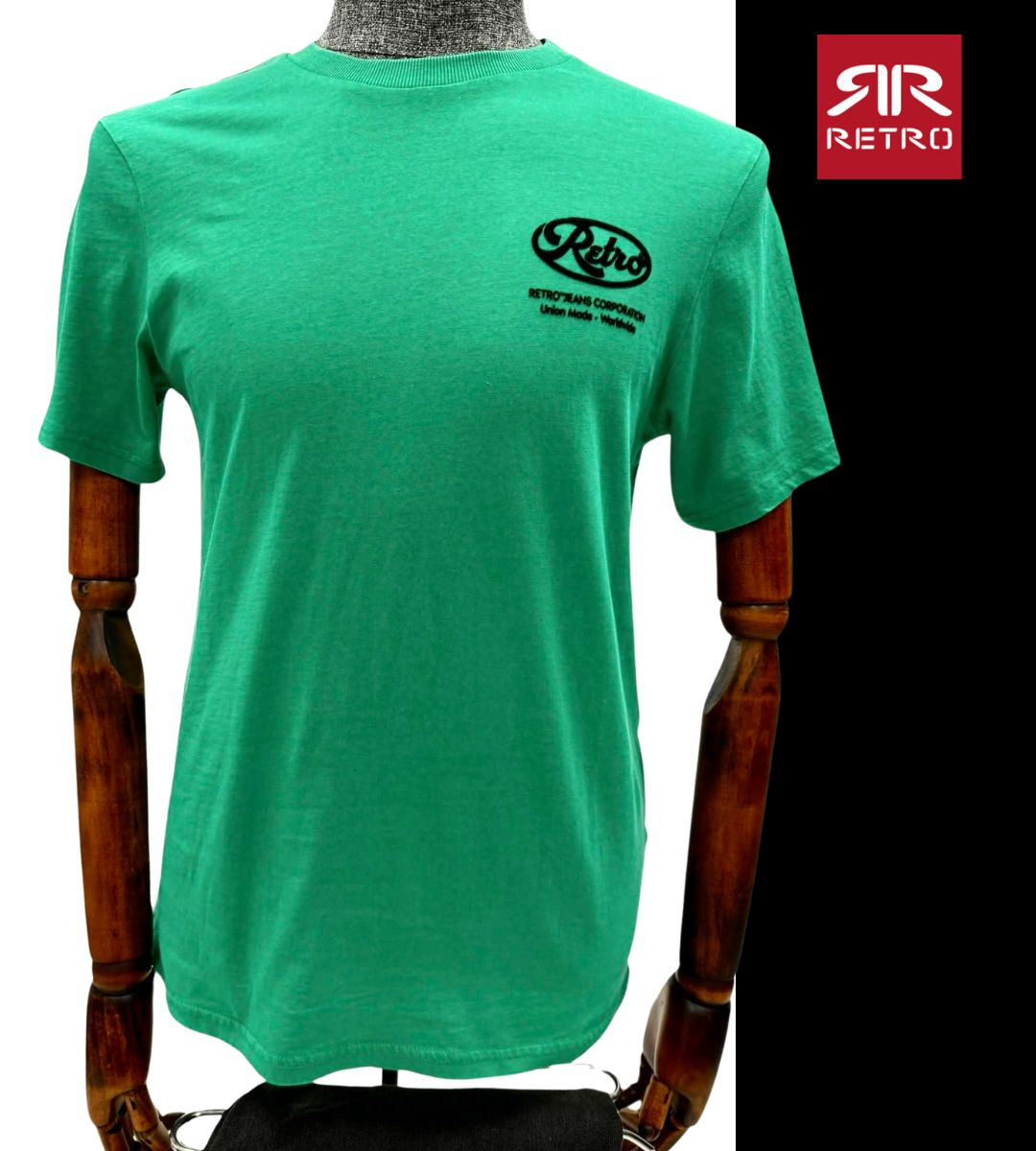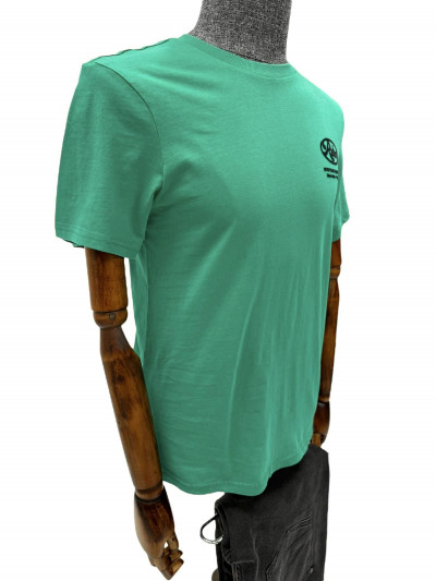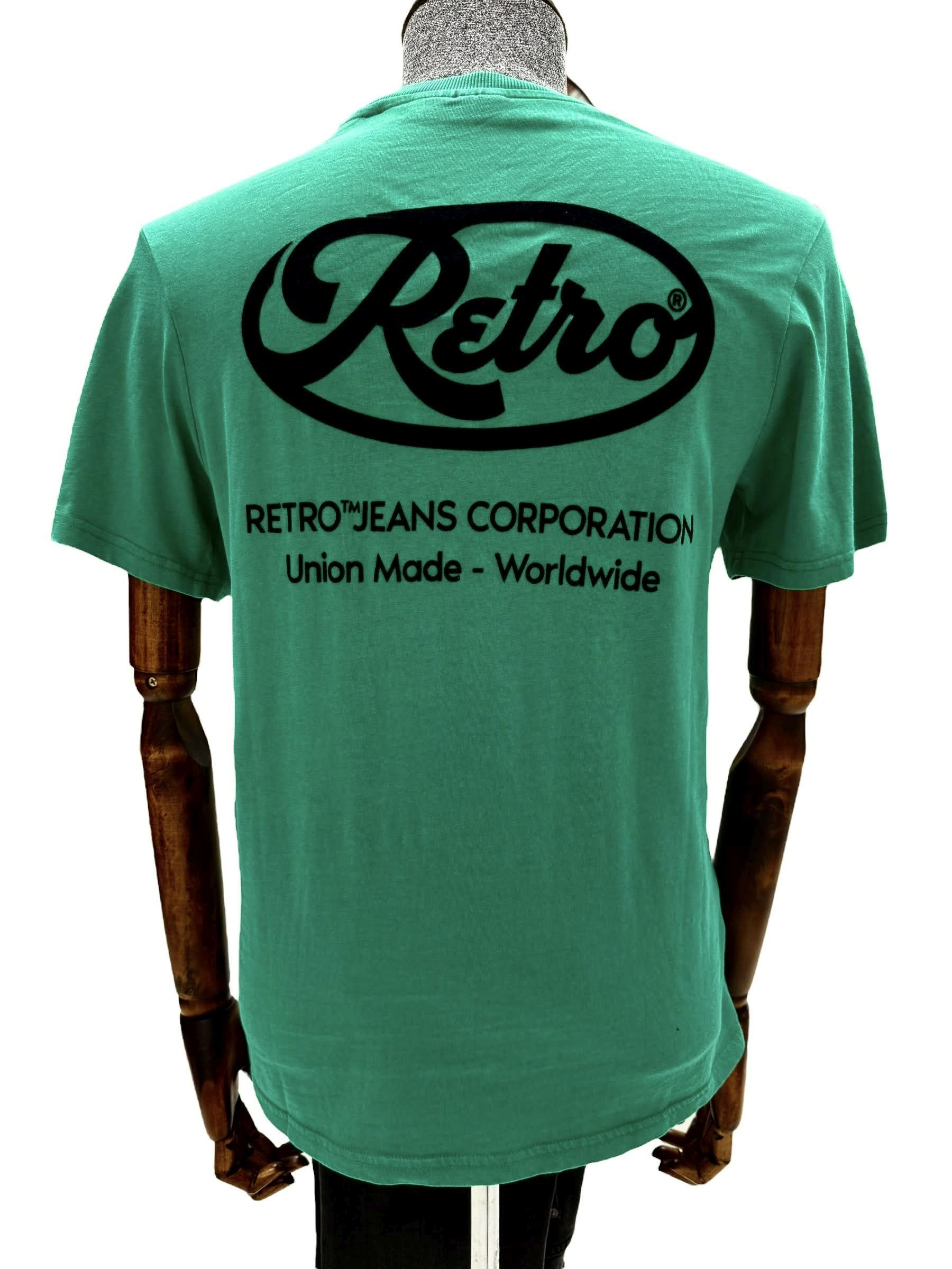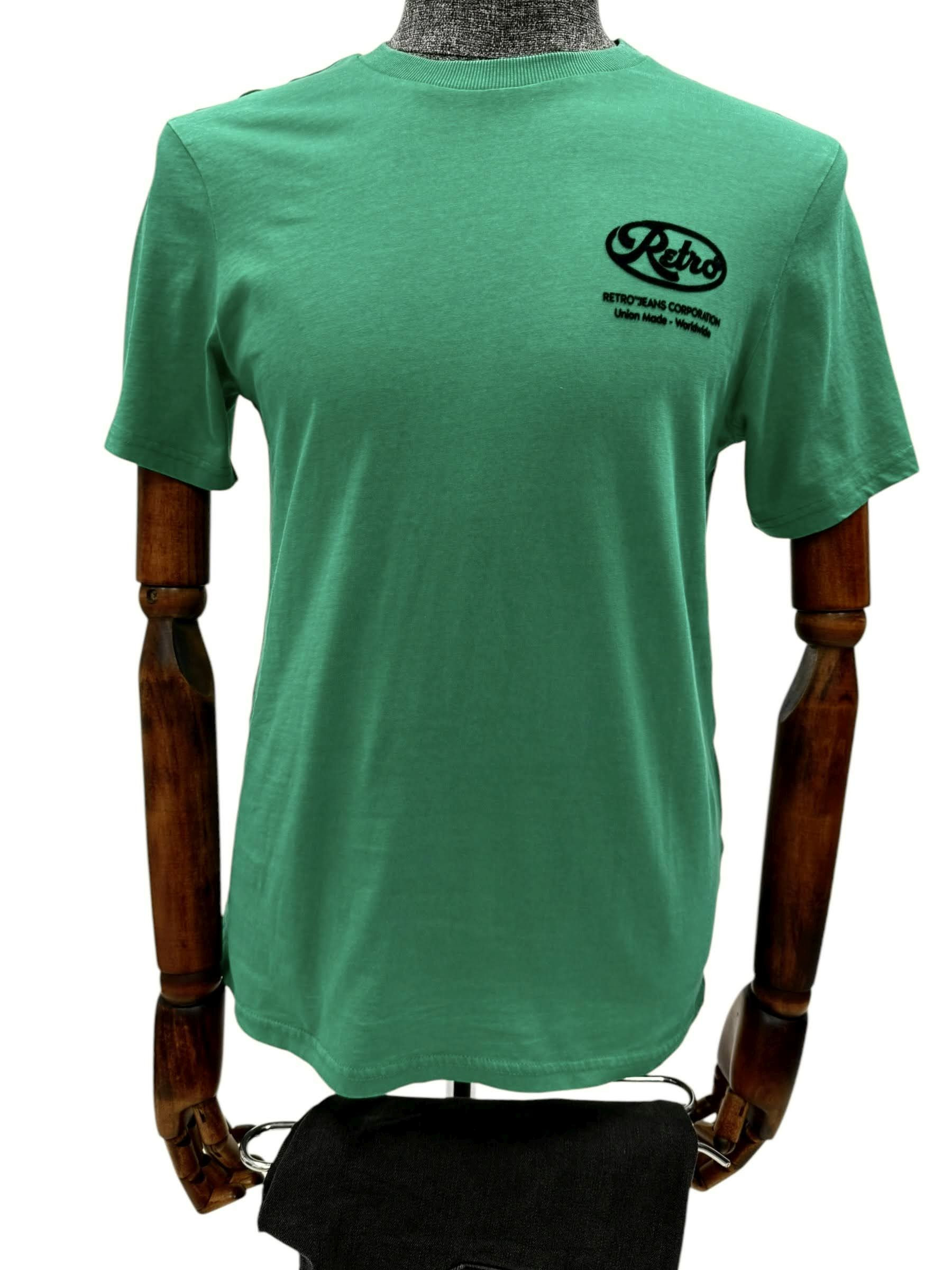 RetroJeans férfi póló, mosott zöld színben, kerek nyakkivágással, normál - egyenes - szabással, mell részén és hátán flokkolt márkajelzéssel.