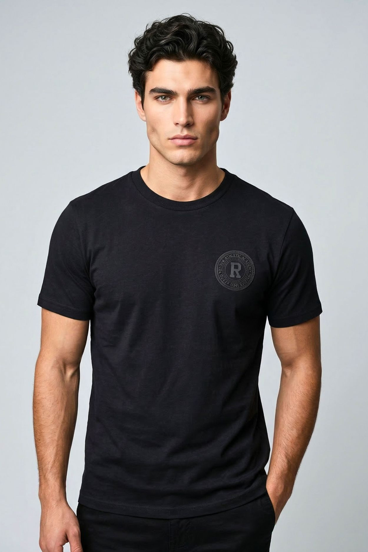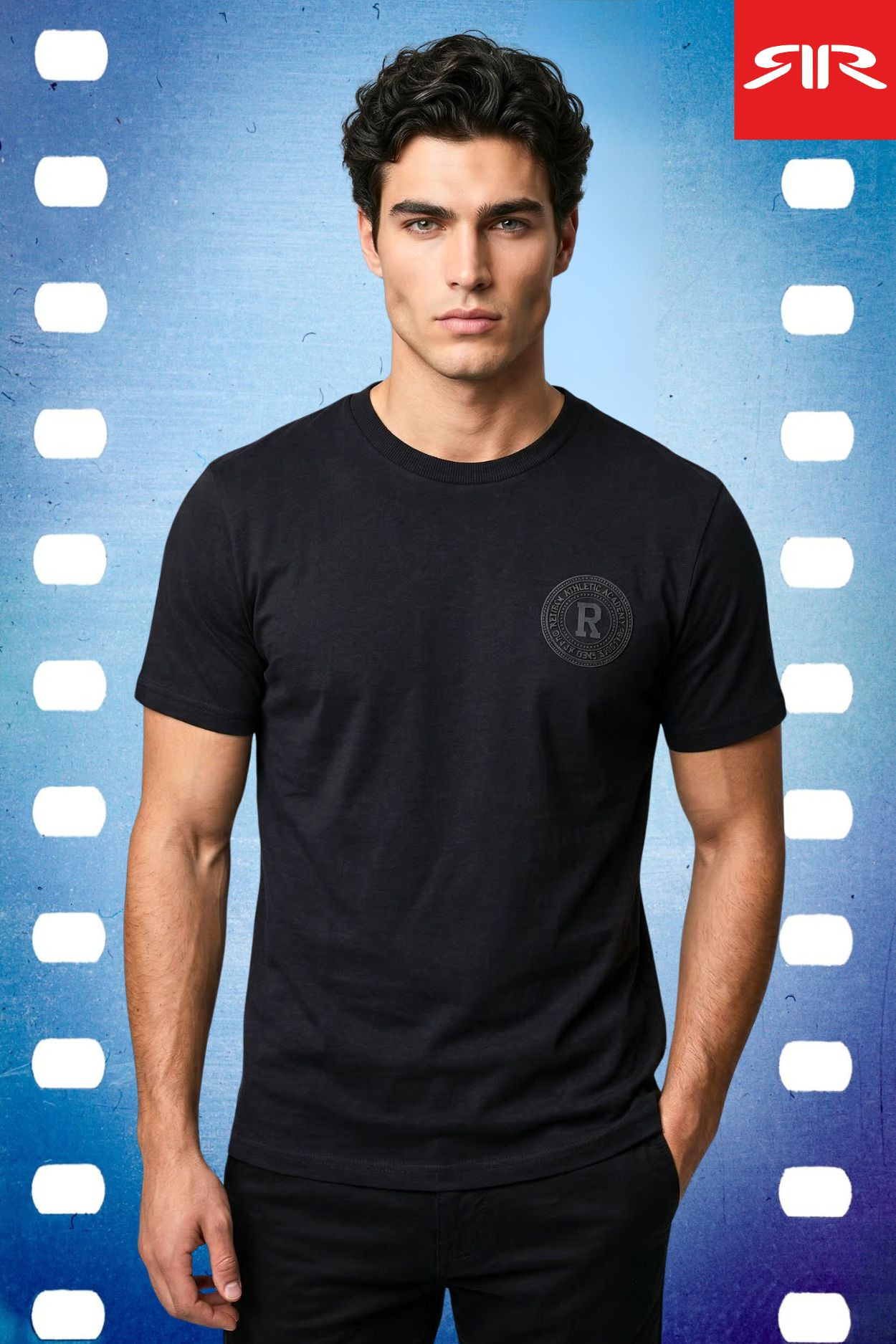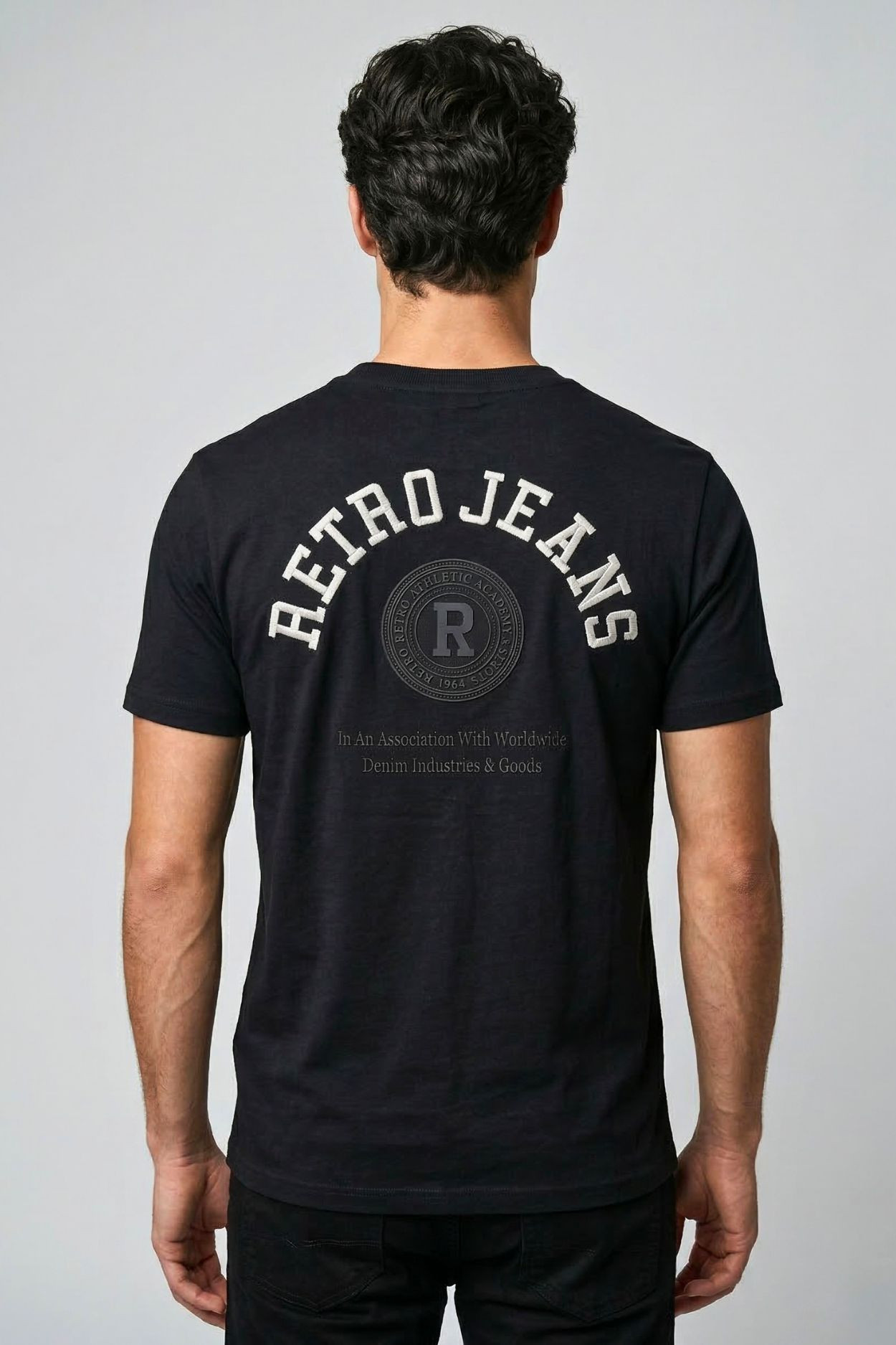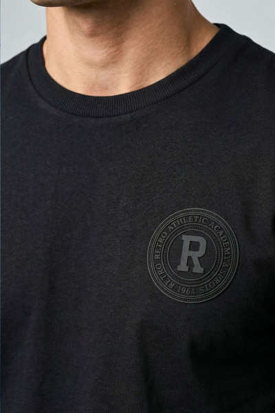 RetroJeans férfi póló, fekete színben, kerek nyakkivágással, oldalába bevarrt, mell részén filmnyomott, hátán filmnyomott és hímzett márkajelzéssel.