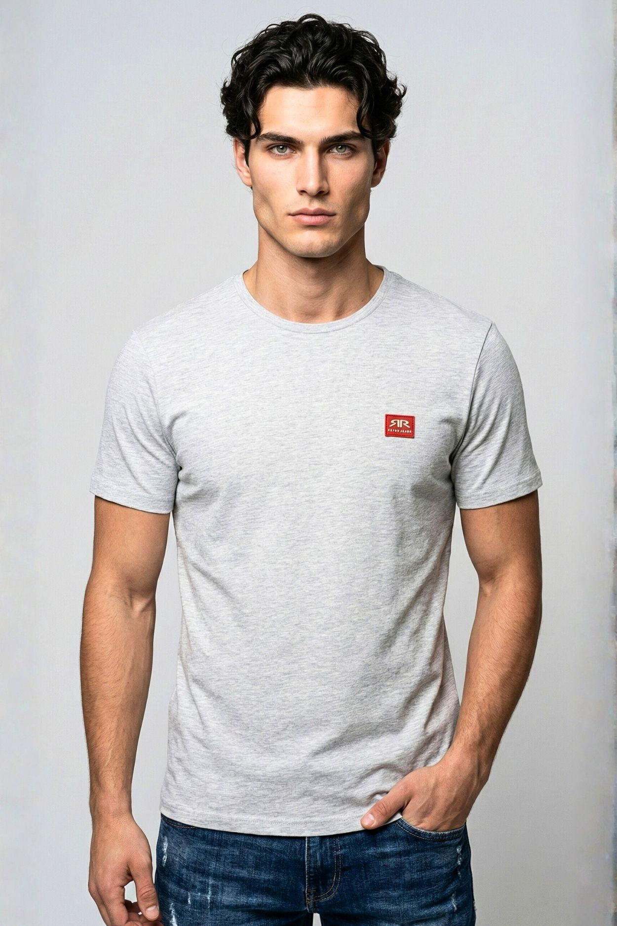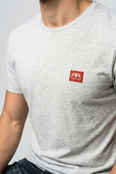 RetroJeans férfi póló, szürke színben, kerek nyakkivágással, elején rávarrt gumírozott márkajelzéssel.