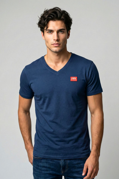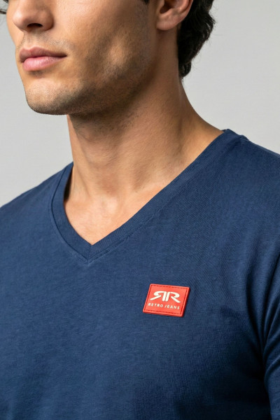 RetroJeans férfi póló, sötétkék színben, V nyakkivágással, elején rávarrt gumírozott márkajelzéssel.