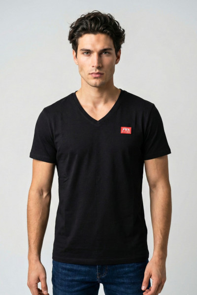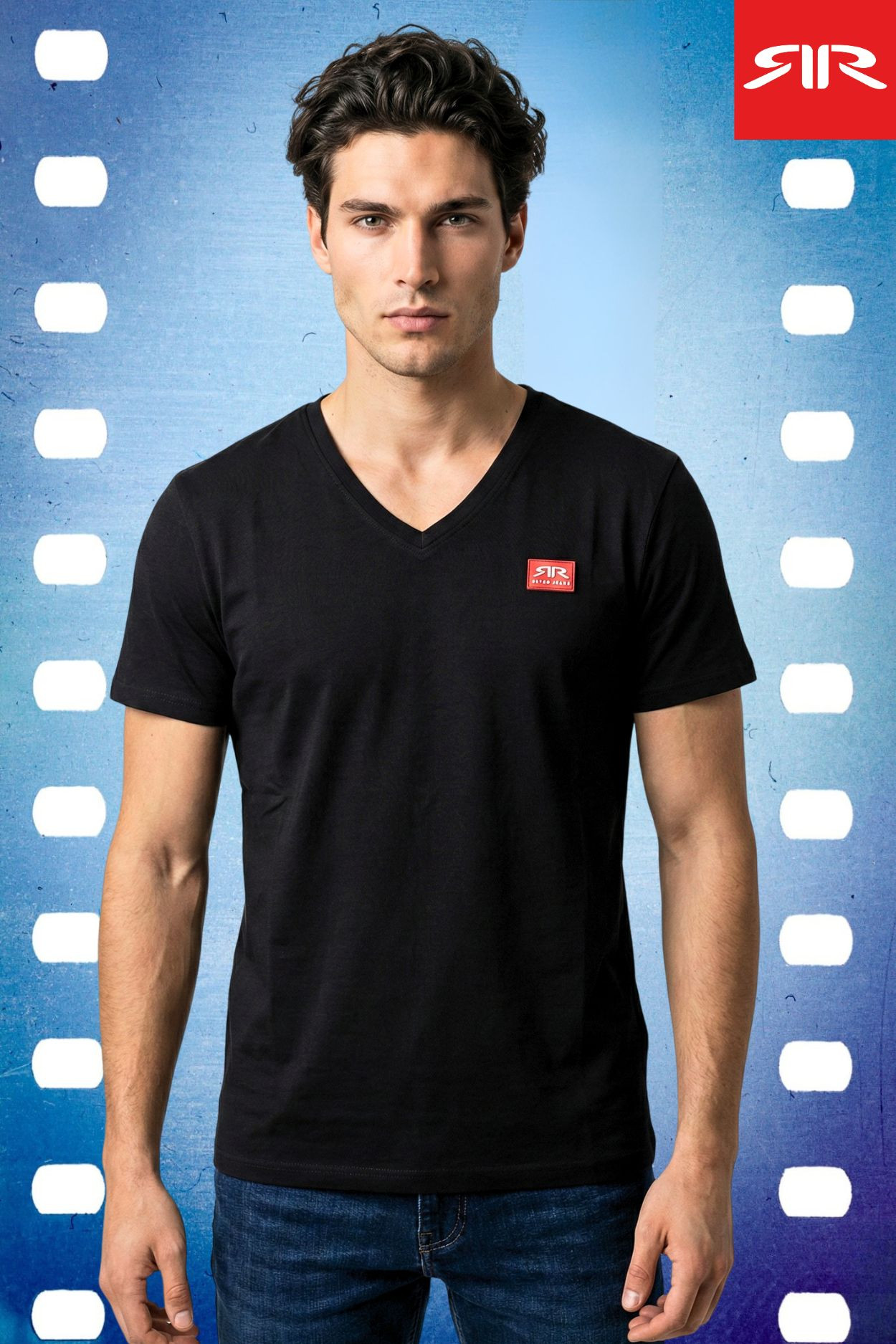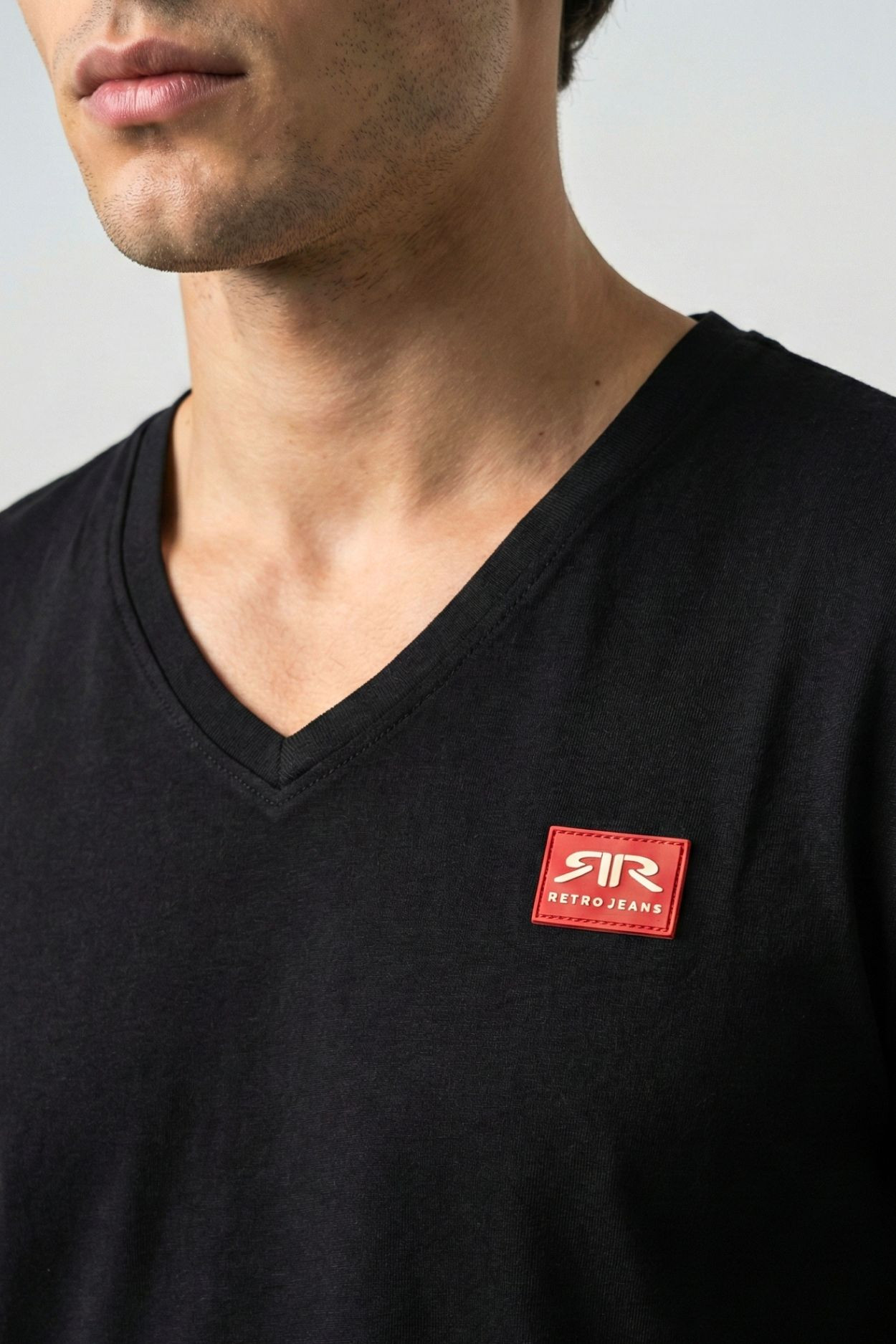 RetroJeans férfi póló, fekete színben, V nyakkivágással, elején rávarrt gumírozott márkajelzéssel.