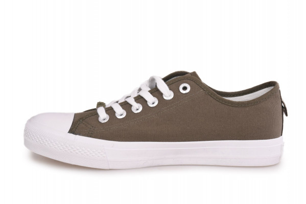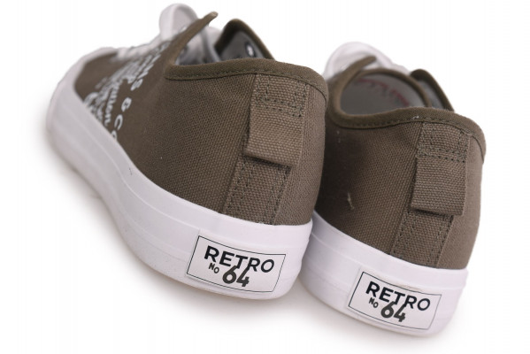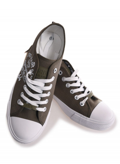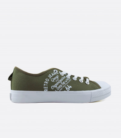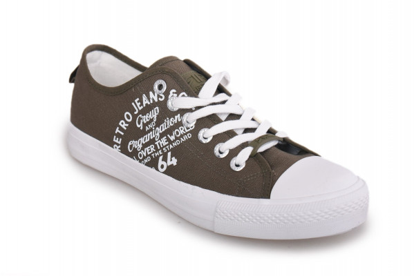 RetroJeans férfi tornacipő - CLAXTON 22 - khaki színben, strapabíró vászon anyagból; fűzős felsőrésszel; megerősített orral; fehér színű gumi talppal, cipőfűzőjén és sarkán szilikon márkajelzéssel; külső oldalán filmnyomott márkajelzéssel a tavaszi/nyári RetroJeans kollekcióból.
