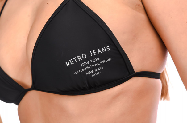 RetroJeans női fekete színű bikini felső, klasszikus háromszög fazonú, kivehető szivacs betéttel, nyakba és hátul megköthető, elején márkajelzéssel Retro Jeans kollekcióból.