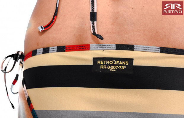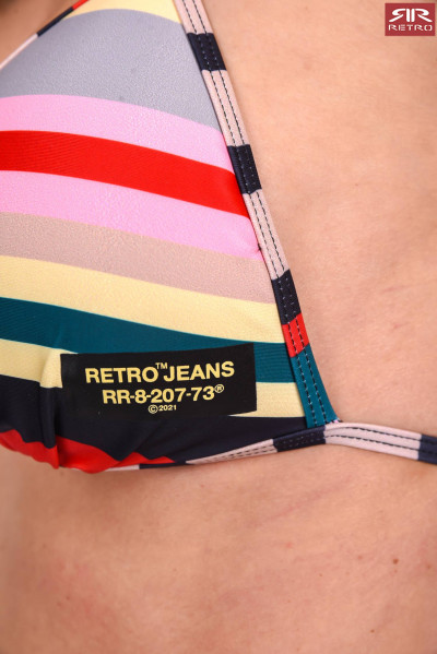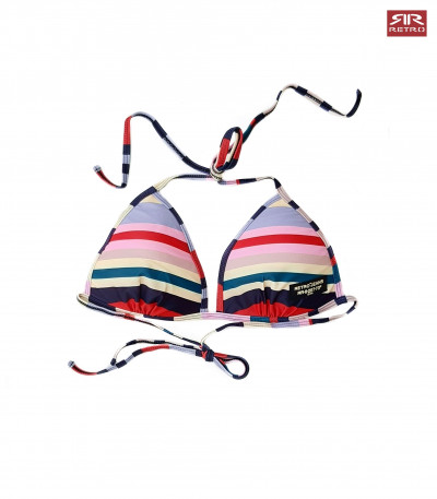 RetroJeans női színes csíkos bikini felső (Lyly Beachwear), klasszikus háromszög fazonú, kivehető szivacs betéttel nyakba és hátul megköthető, márkajelzéssel Retro Jeans kollekcióból.