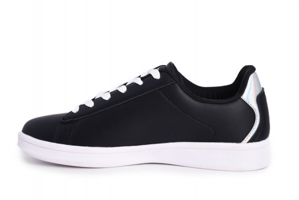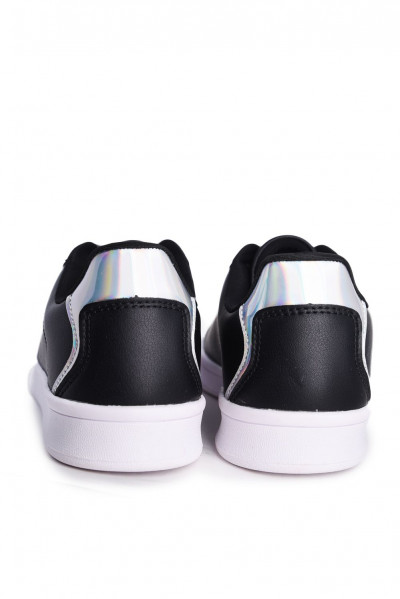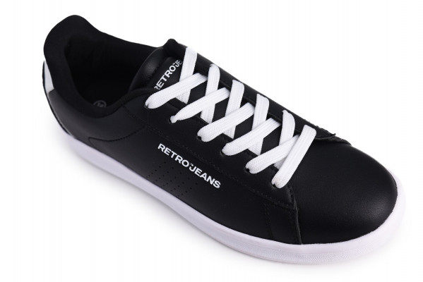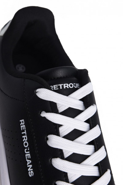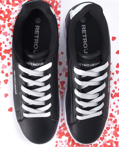 RetroJeans női cipő, bőrhatású anyagból, fekete színben, fűzős felsőrésszel, hologrammos sarokrésszel, légáteresztős kivitelben, nyelvén- és orrán nyomott márkajelzéssel a tavaszi/nyári RetroShoes kollekcióból.