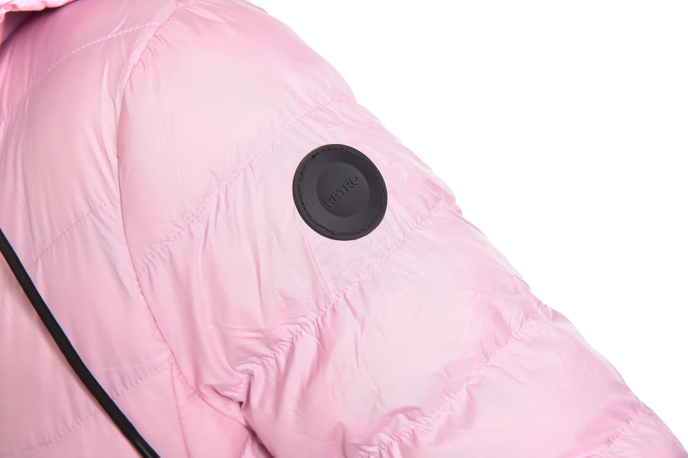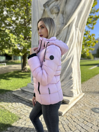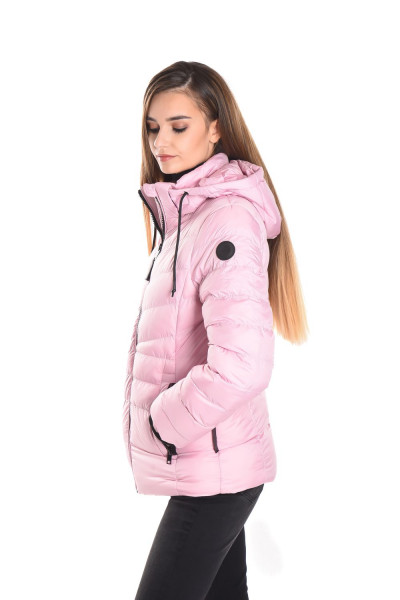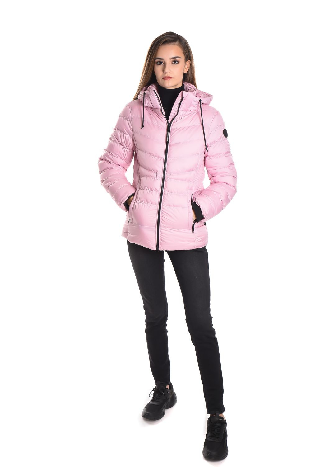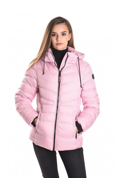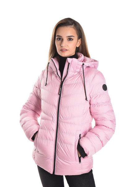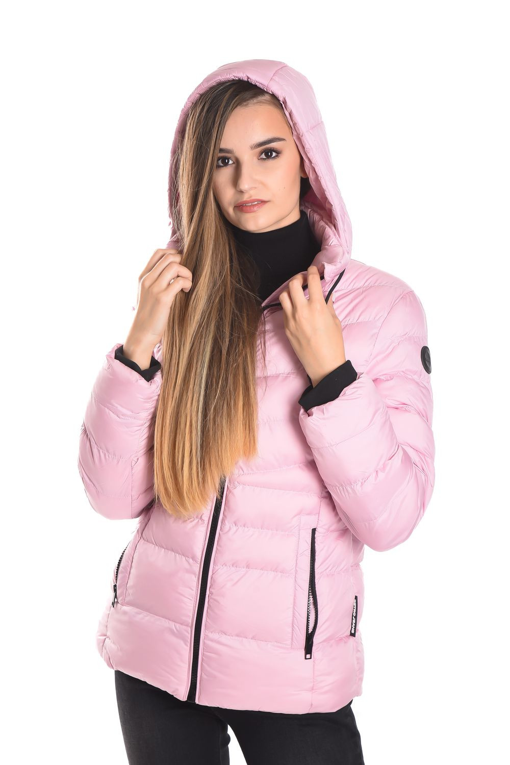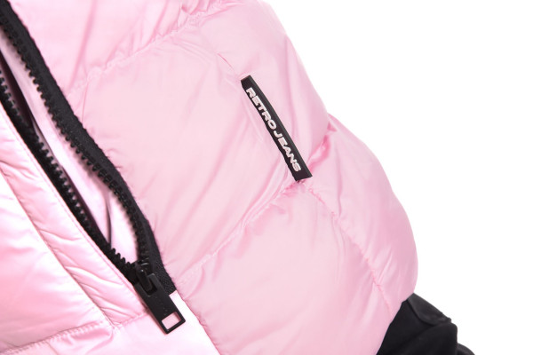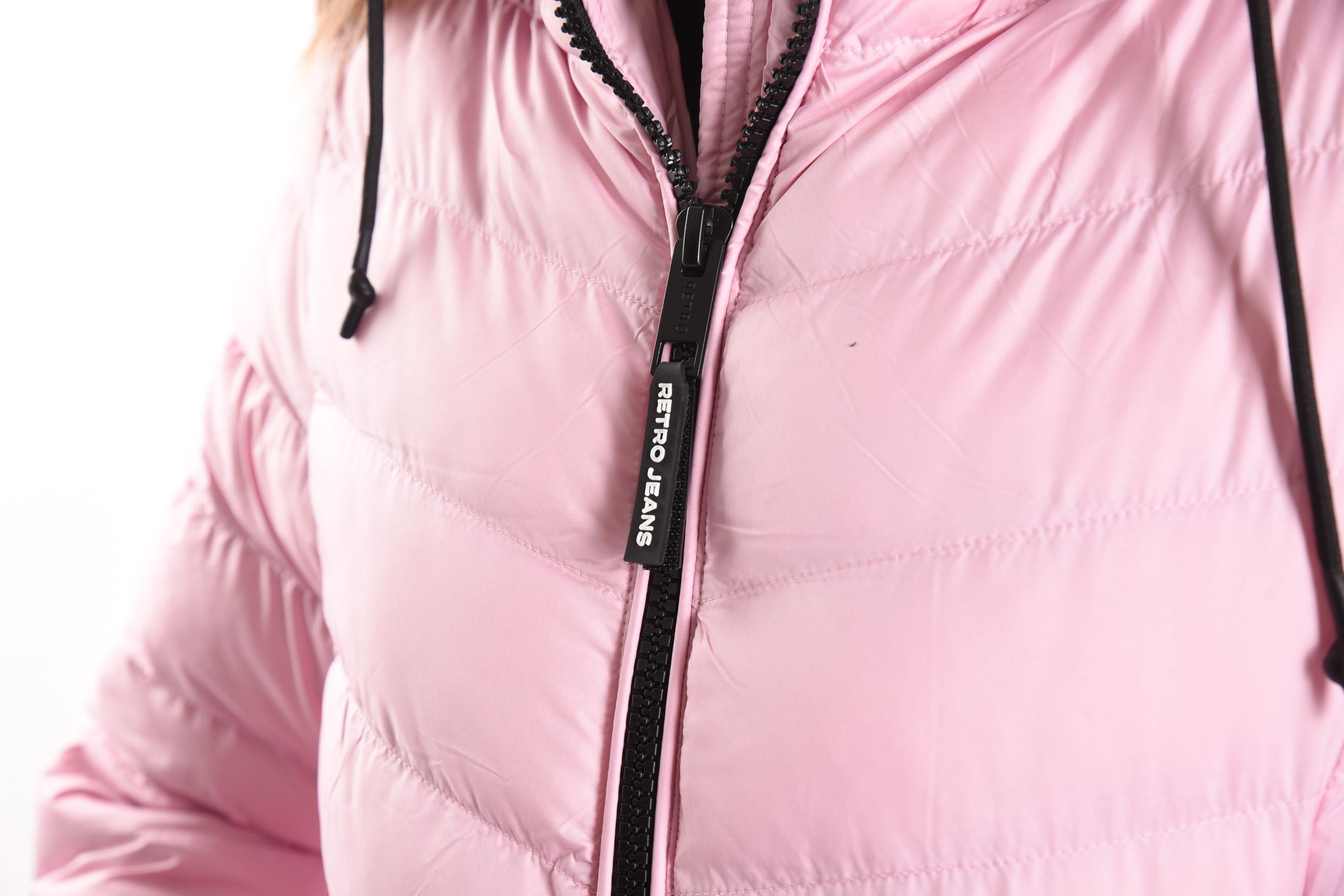 RetroJeans női steppelt dzseki, rózsaszín színben, lezipzárolható, összehúzható kapucnival, zipzáras záródással, zipzáras oldalzsebekkel, oldalán és cipzárján márkajelzéssel.