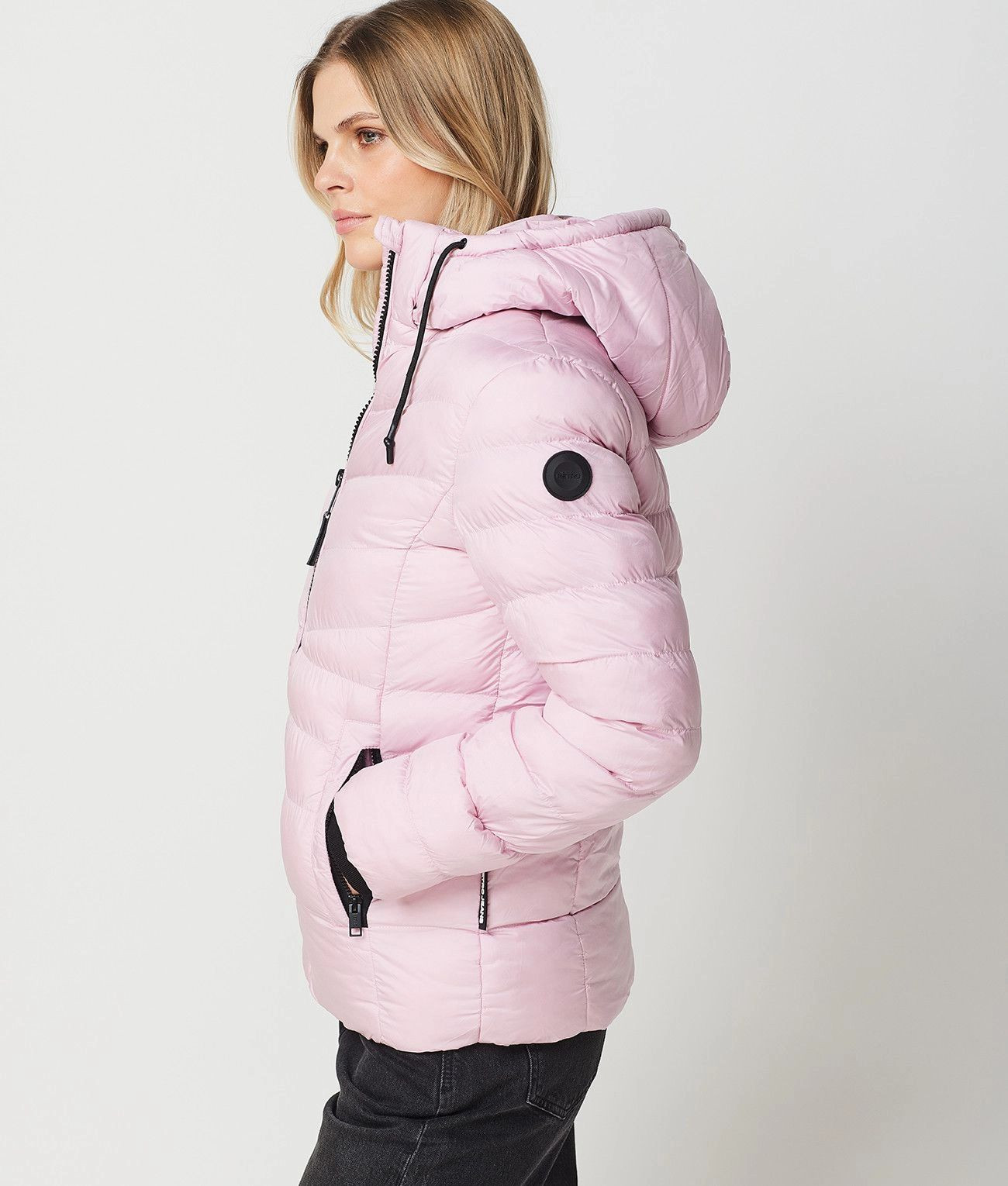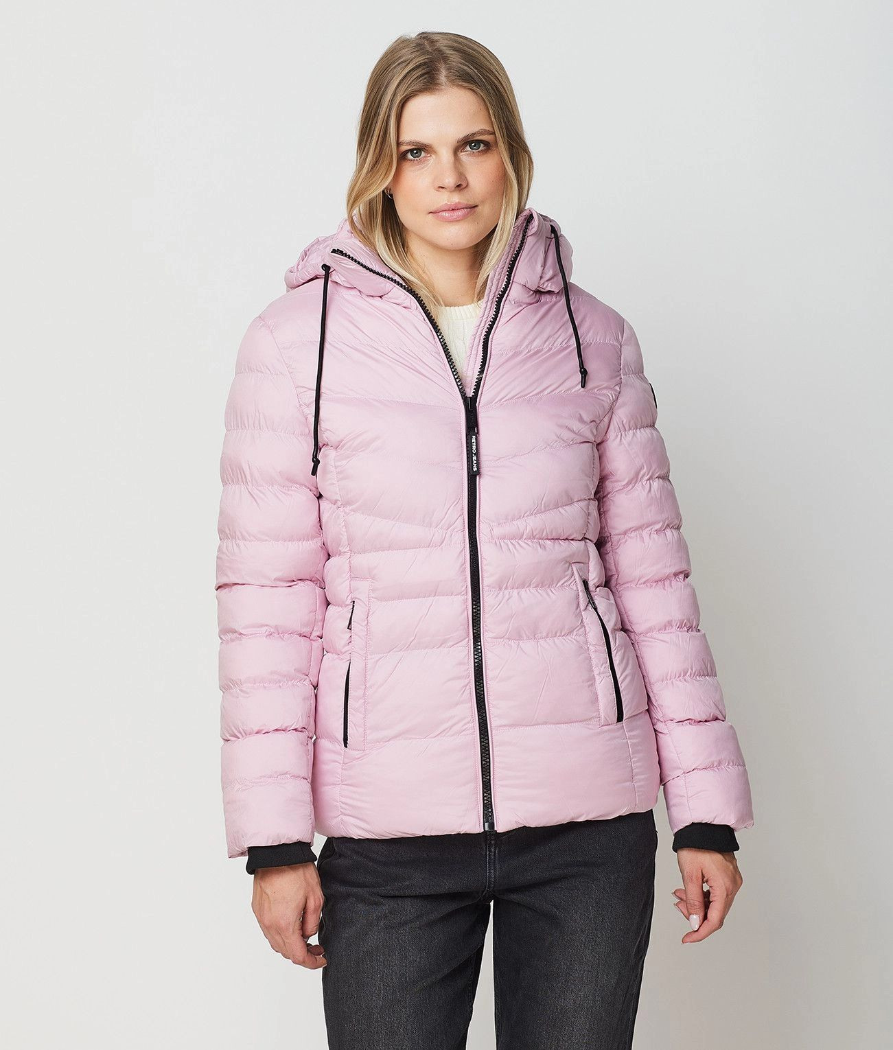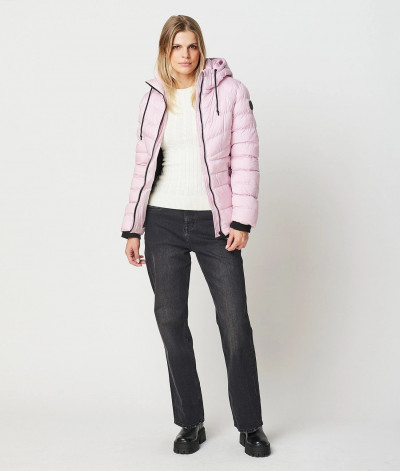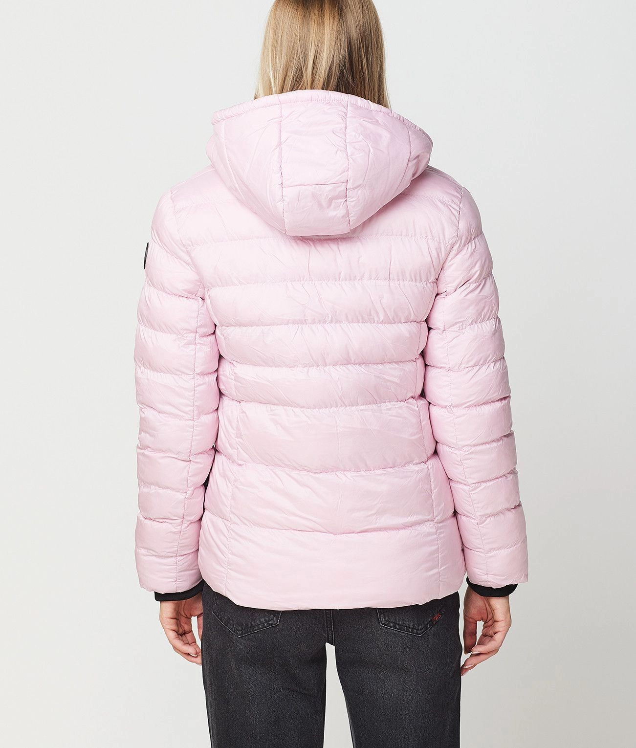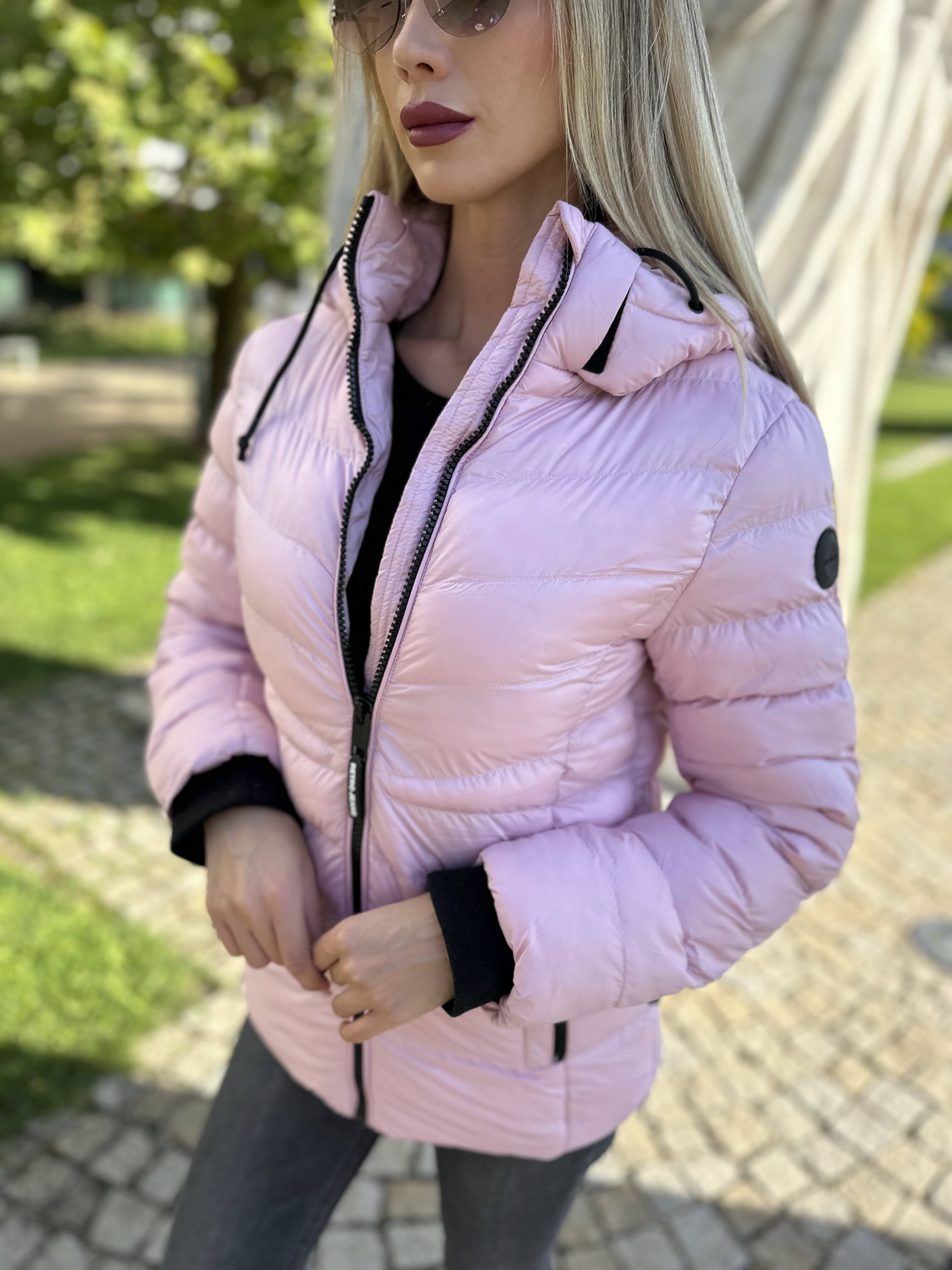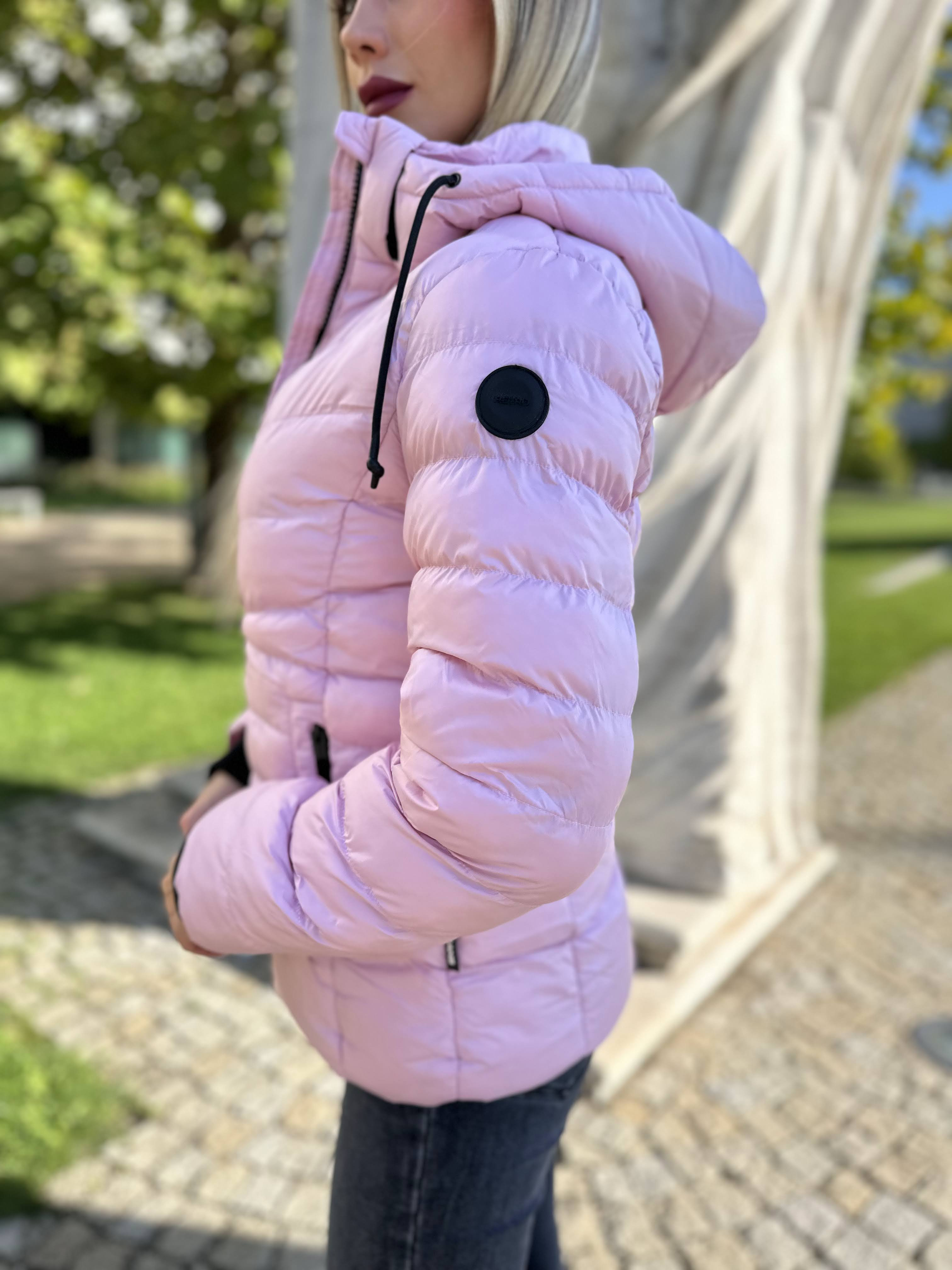 RetroJeans női steppelt dzseki, rózsaszín színben, lezipzárolható, összehúzható kapucnival, zipzáras záródással, zipzáras oldalzsebekkel, oldalán és cipzárján márkajelzéssel.