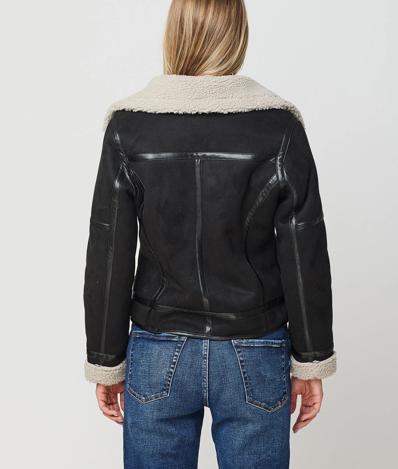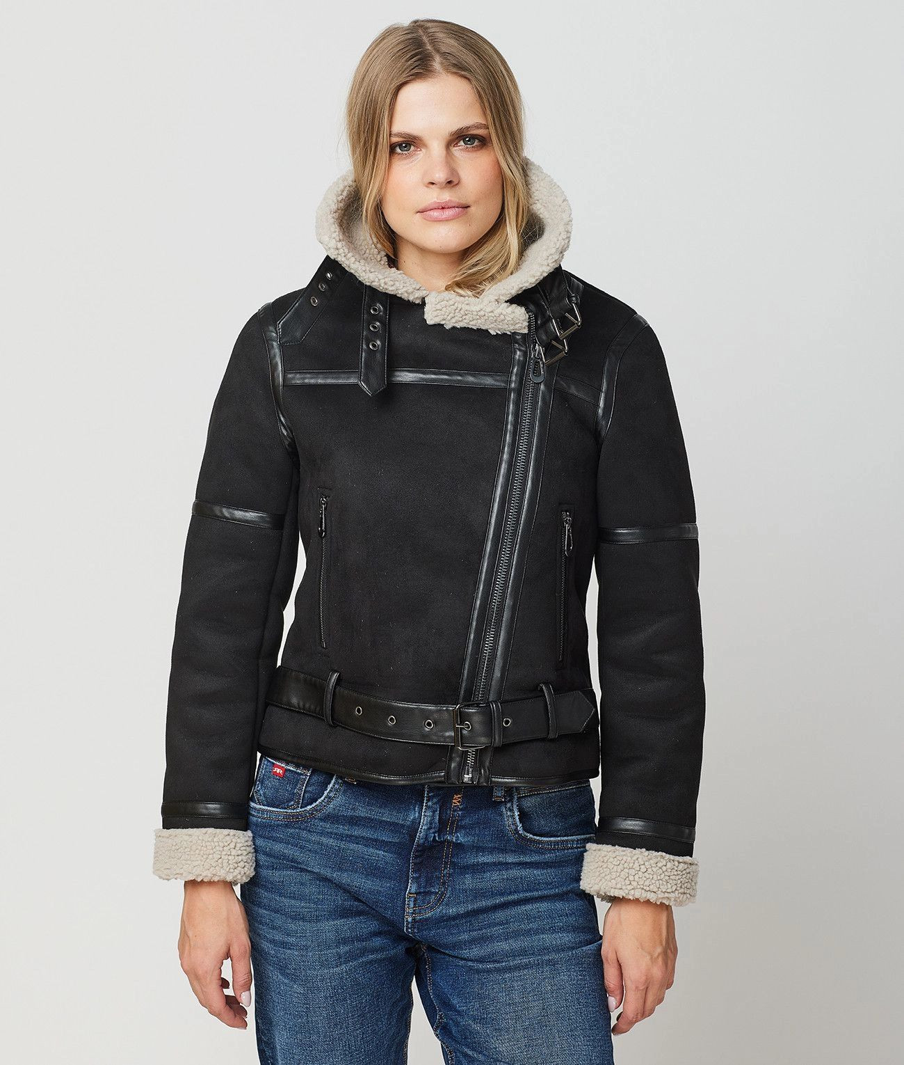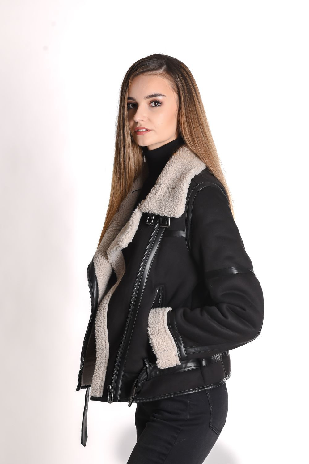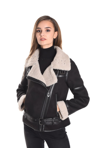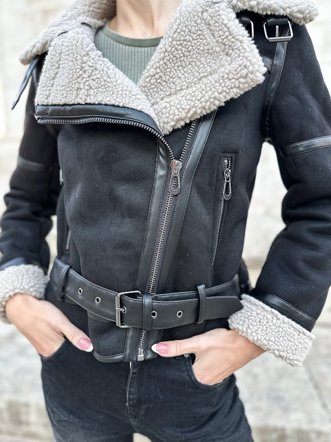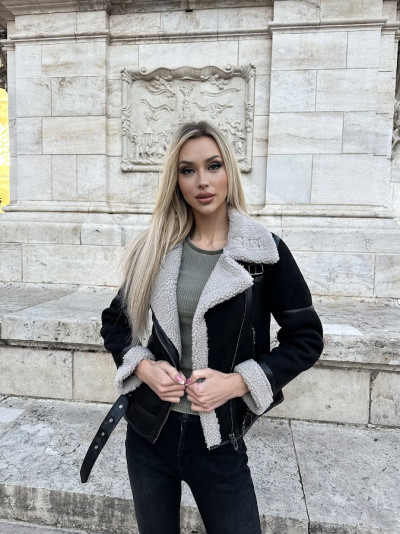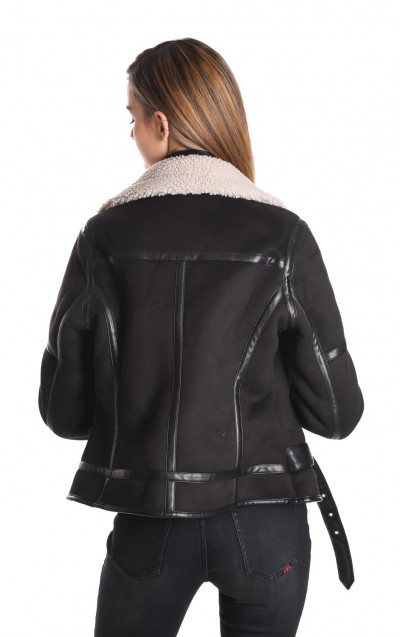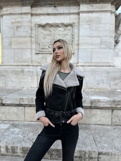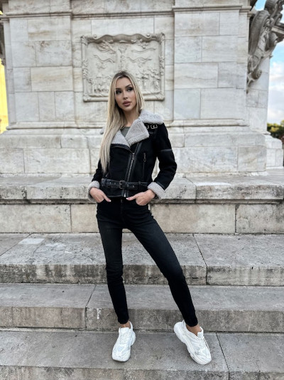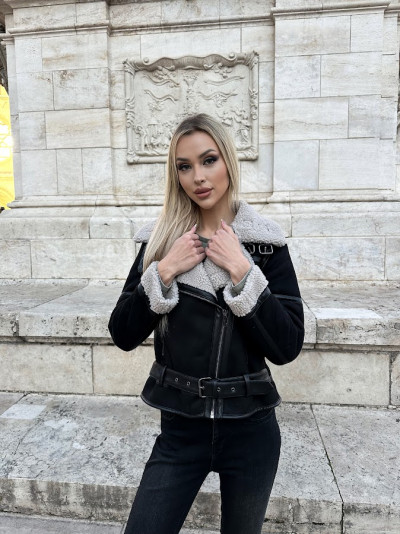 RetroJeans női műirha dzseki, fekete színben, magasított, csatos záródású nyakkal, elején cipzáros záródással, összehúzható kapucnival, cipzáras előzsebekkel, dereka hozzátartozó övvel szűkíthető, márkajelzett fémkellékekkel.