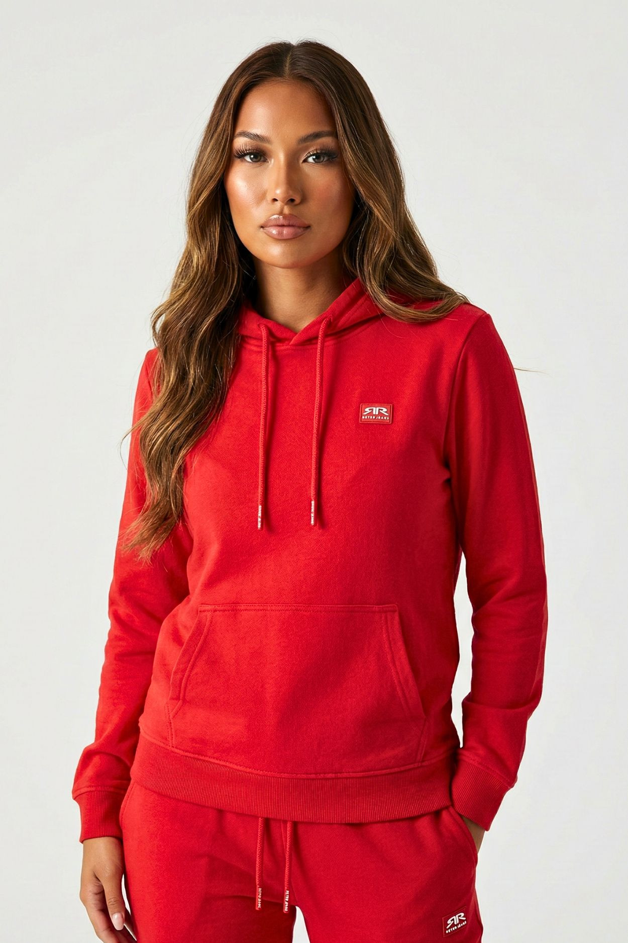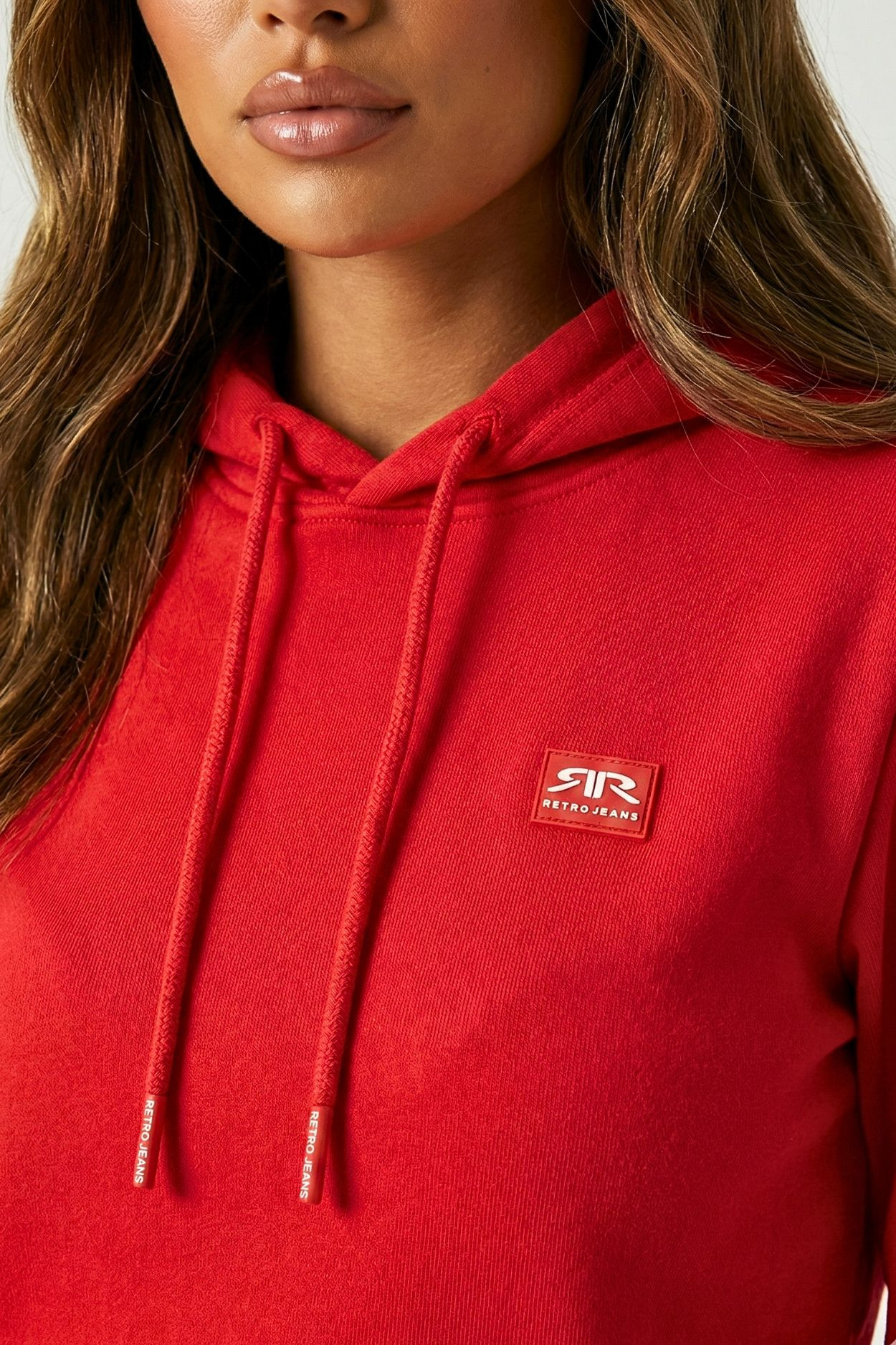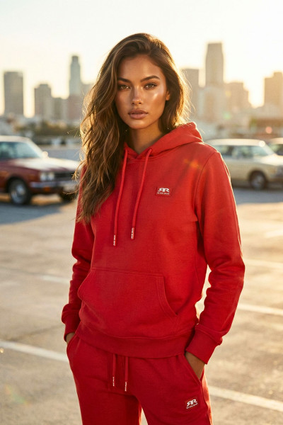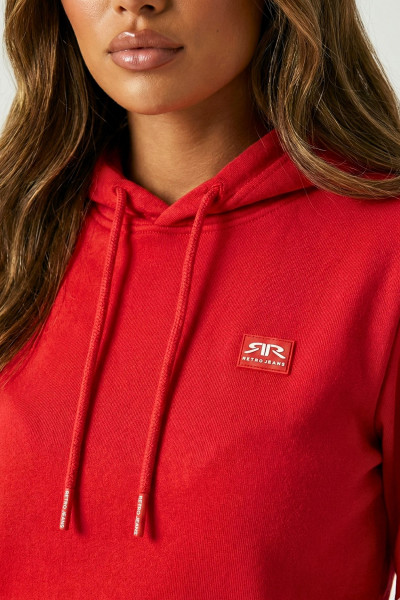 RetroJeans női kapucnis jogging felső, piros színben, kenguruzsebbel, húzózsinóros kapucnival, elején rávarrt gumírozott márkajelzéssel.
