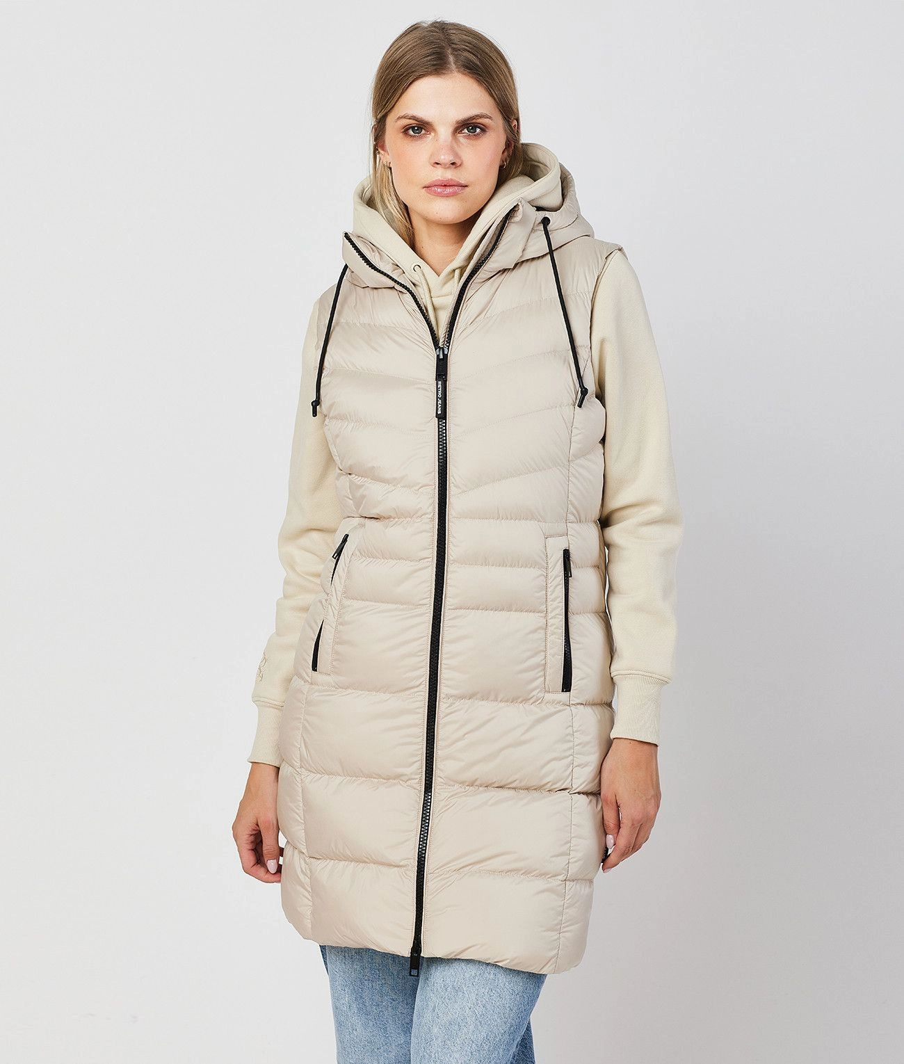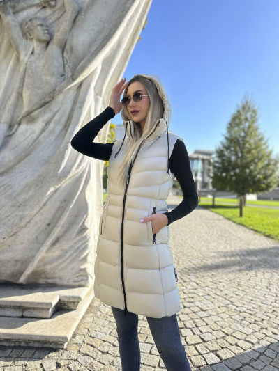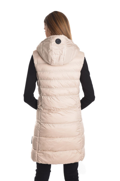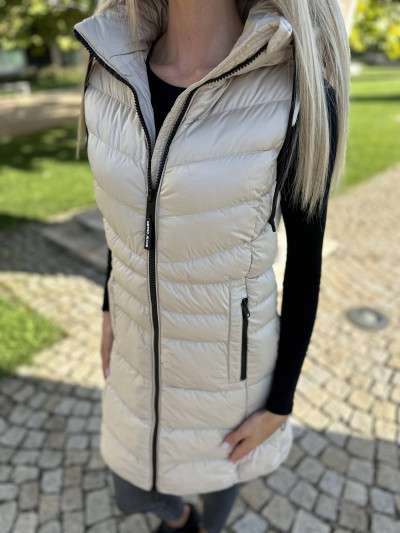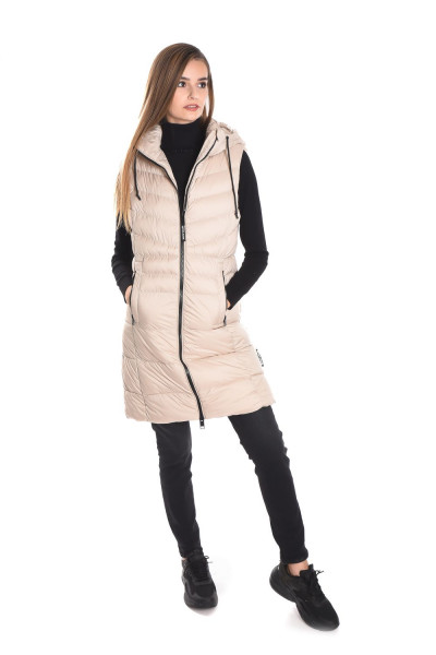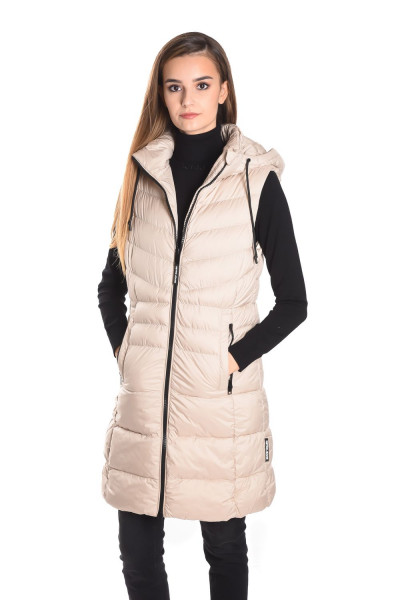RetroJeans női hosszú mellény, bézs színben. Elején zipzáras záródással, zipzáras oldalzsebekkel, magasított nyaki résszel, lezipzárolható kapucnival, kapucniján és oldalán szilikon márkajelzéssel