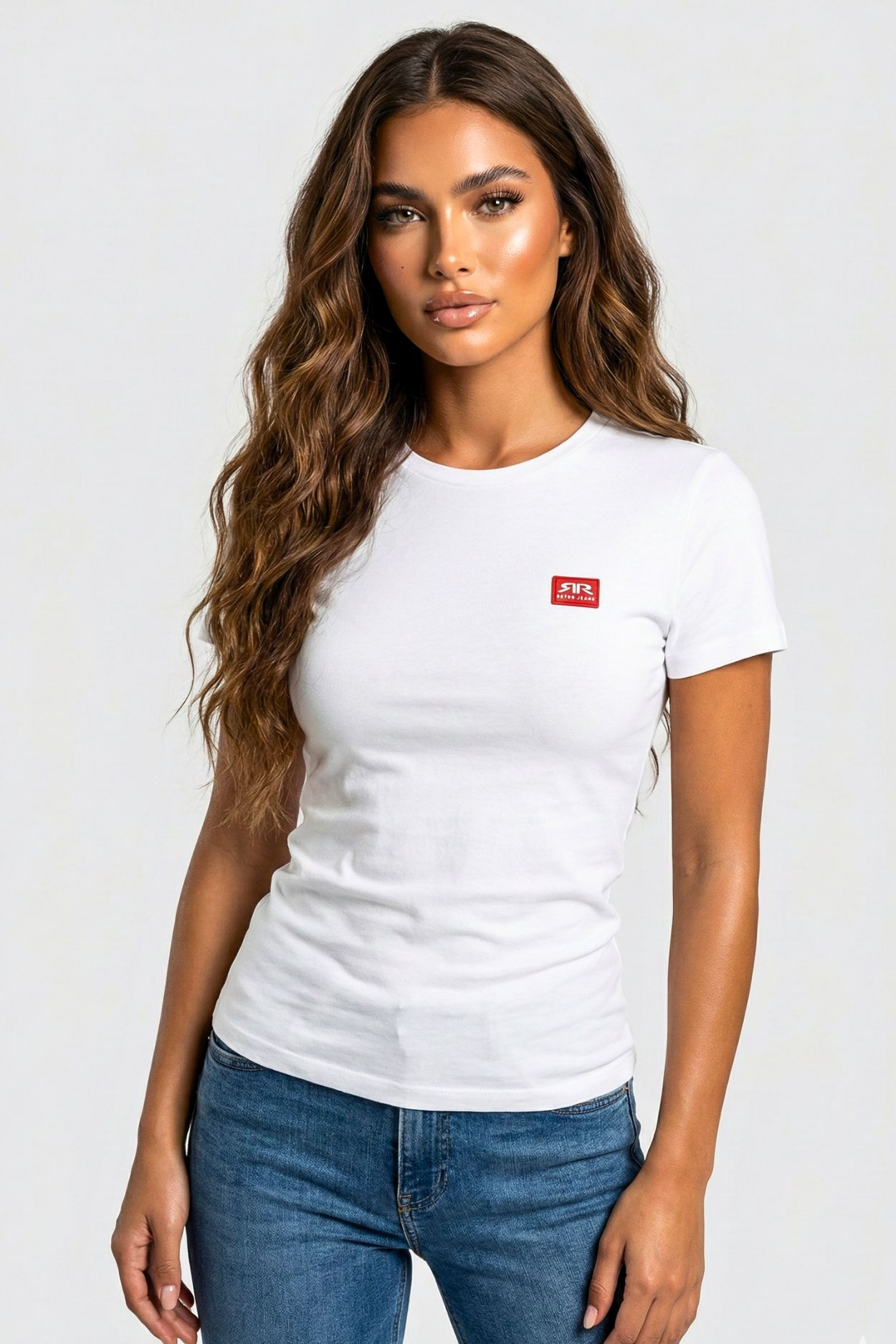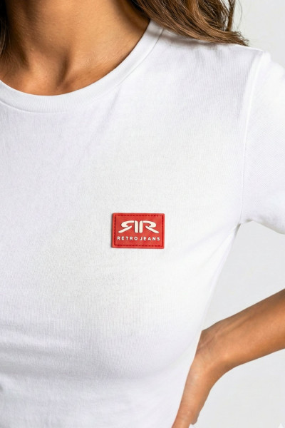 RetroJeans női póló, fehér színben, elején rávarrt gumírozott márkajelzéssel.