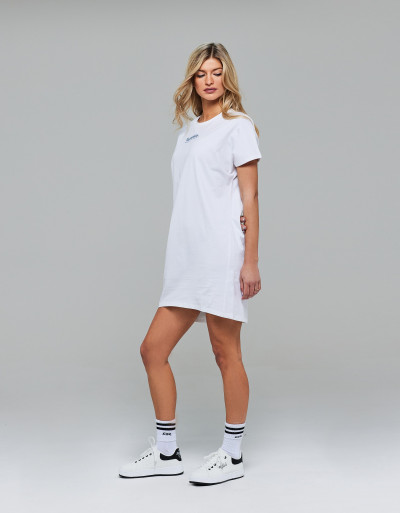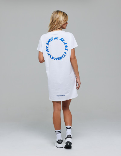 RetroJeans női rövid ujjú tunika, fehér színben, bő fazonban, kerek nyakkivágással, mell részén és hátán filmnyomott márkajelzéssel.