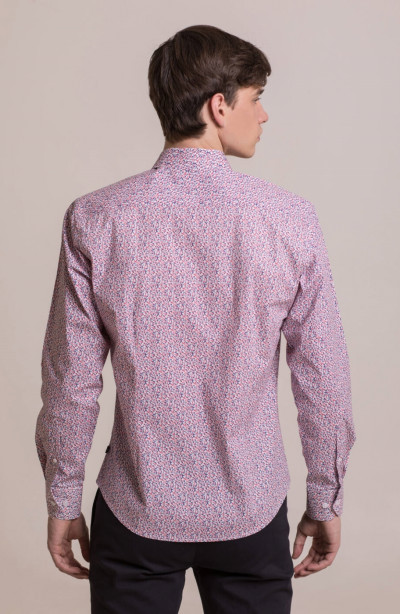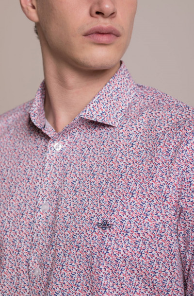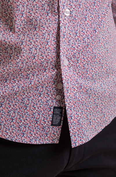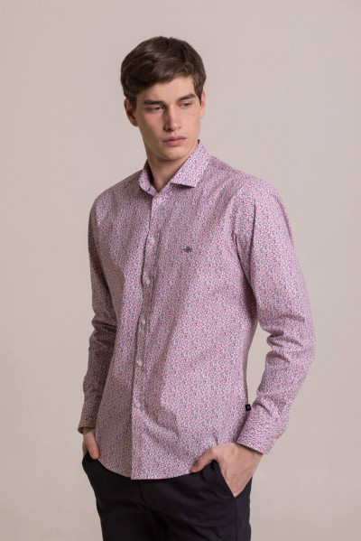 Fehér-kék-piros apró nyomott mintás hosszú ujjú ing, karcsúsított fazonnal, rugalmas anyaggal, hímzett márkajelzéssel az eleje mellrészen, oldalán szövött címke illetve az alsó gombolópánton.