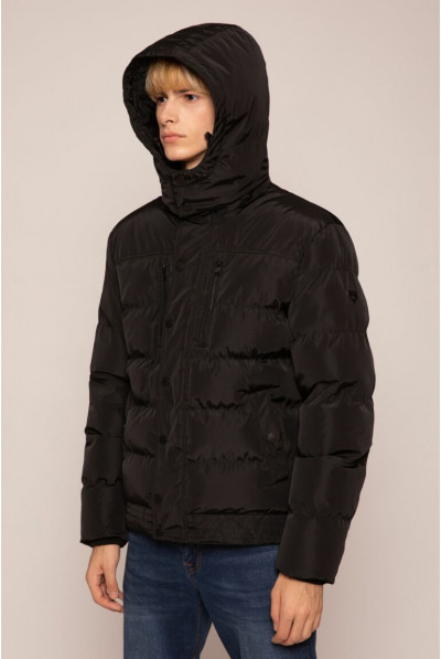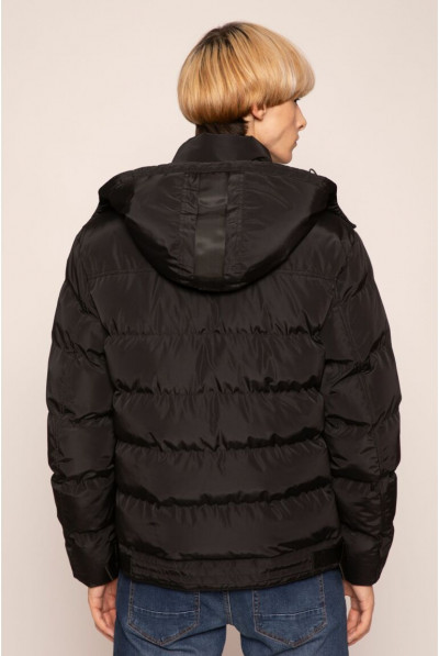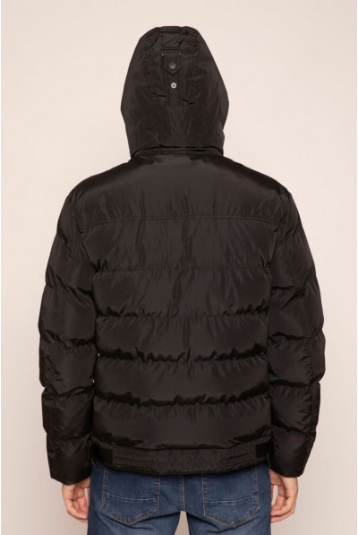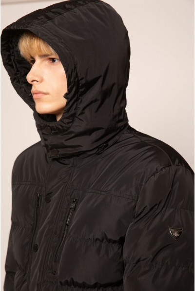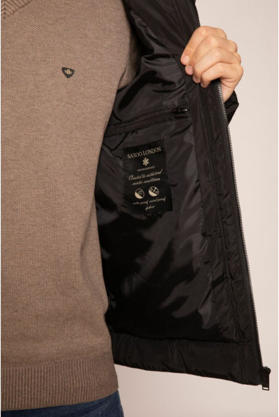 SaxooLondon vízlepergető steppelt bélelt kabát, fekete színben, lecipzározható kapucnival, elején két zsebbel, cipzárral záródó, két belső zsebe szintén cipzáras, alja bősége fém csattal szabályozható, ujja alja rejtett, belső elasztikus szélfogó anyaggal végződik, ujján fém márkajelzéssel.