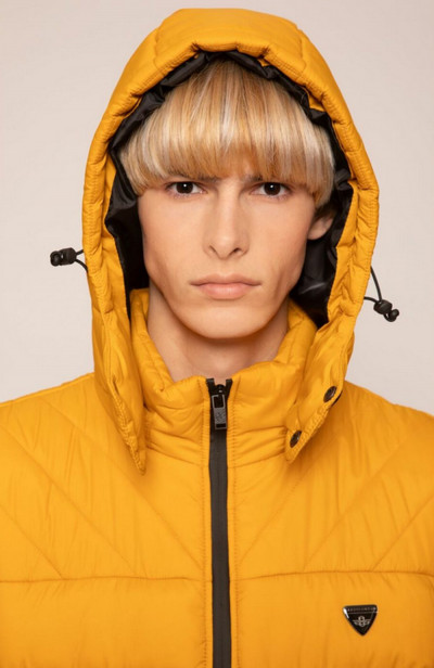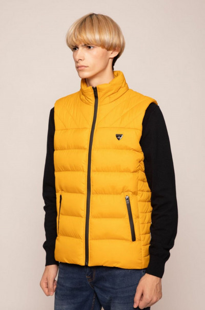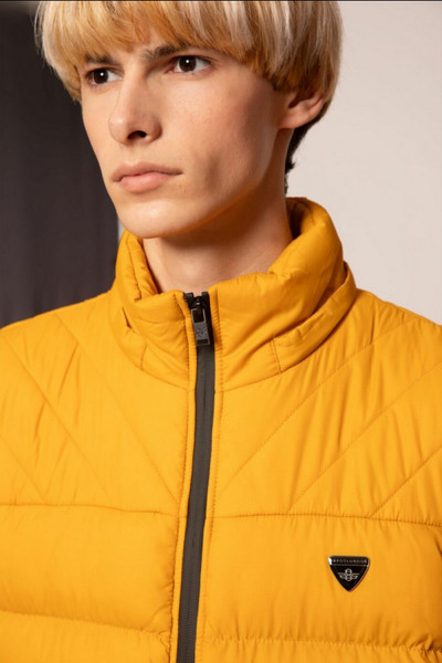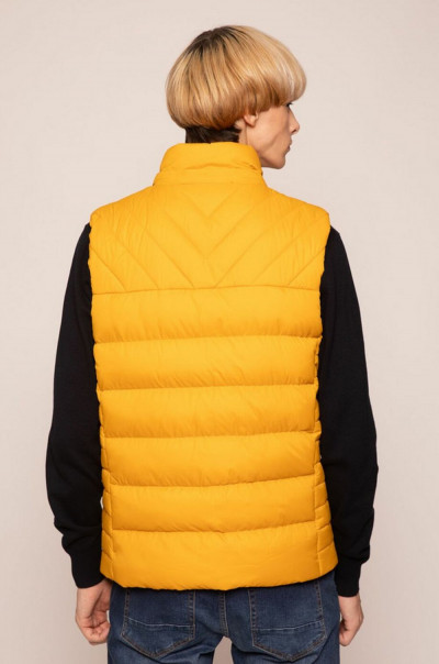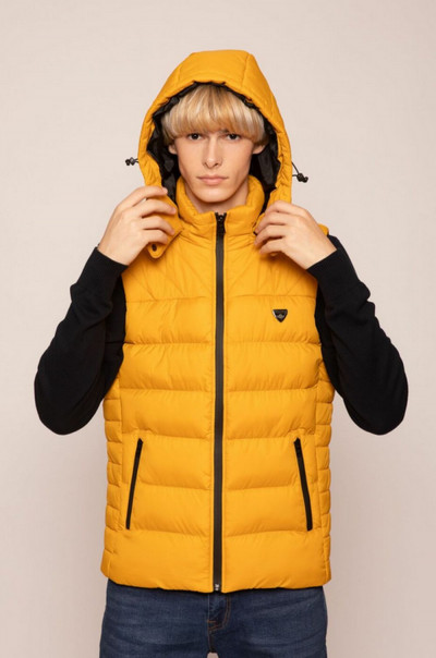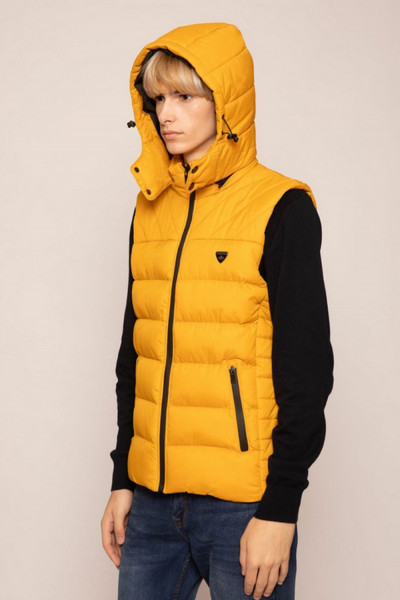 SaxooLondon klasszikus szabású, átmeneti mellény; méz színben; magasított nyakkal; víz és szélálló cipzárakkal; levehető kapucnival; elején fém márkajelzéssel.