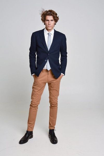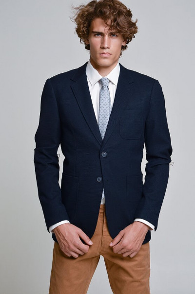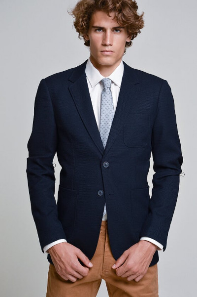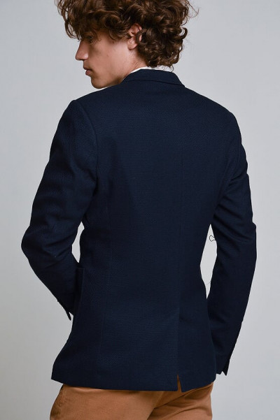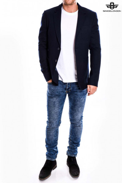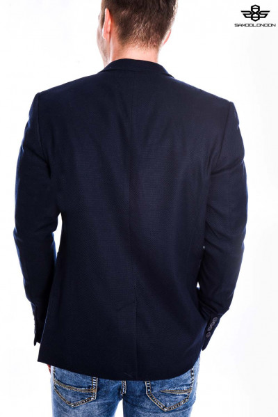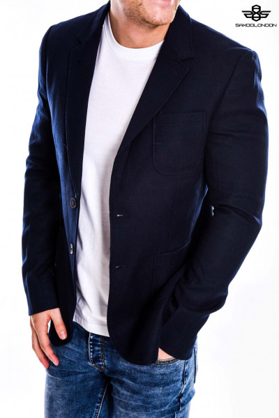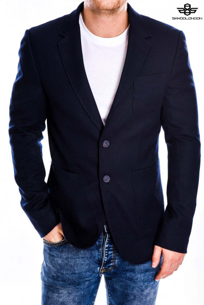 SaxooLondon (Cassius) férfi sportzakó, sötétkék színben, karcsúsított (Slim Fit) fazonú, két gombos, három külső és kettő belső zsebbel, márkajelzett gombokkal az őszi SaxooLondon kollekcióból.