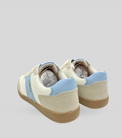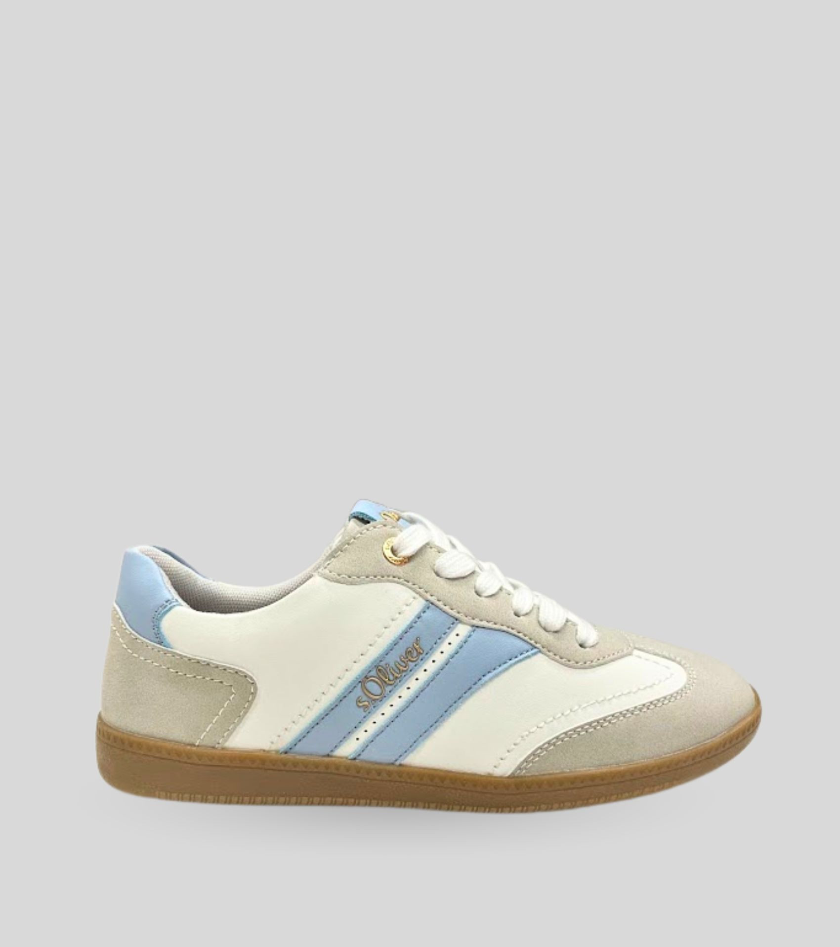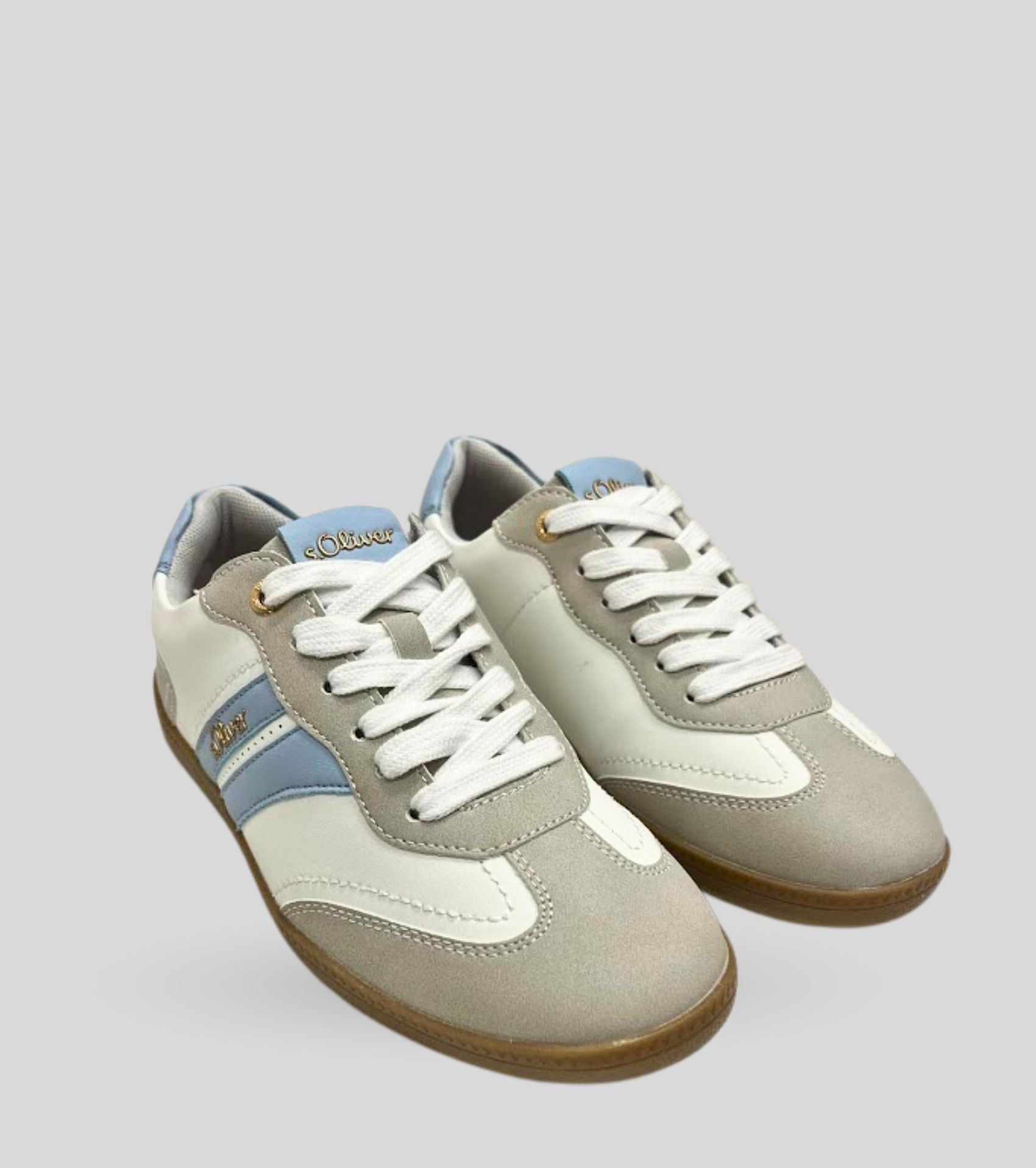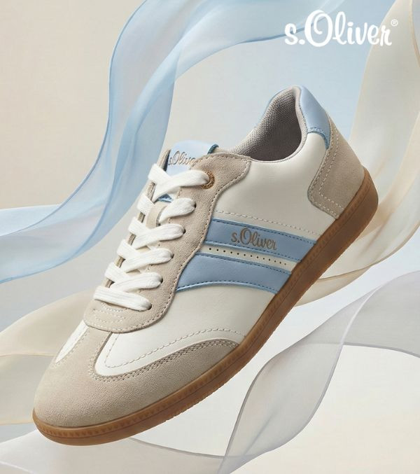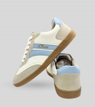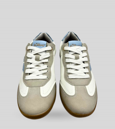 S.Oliver női műbőr sportcipő, szürke, fehér és világos kék színösszeállításban; kényelmes, légáteresztő és kivehető talpbéléssel; párnázott bokarésszel; művelúr orr- és sarokrésszel; barna színű gumis talprésszel, nyelvén és oldalán márkajelzéssel. Kényelmes, mindennapi viseletre ideális.
