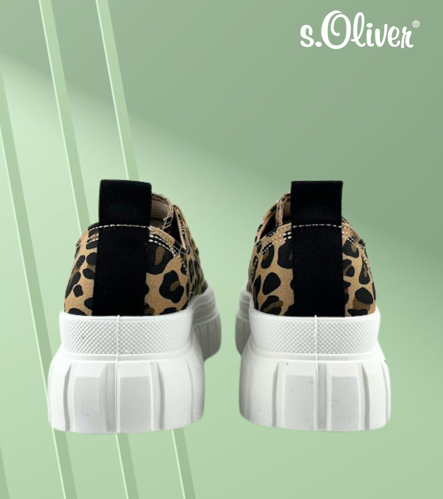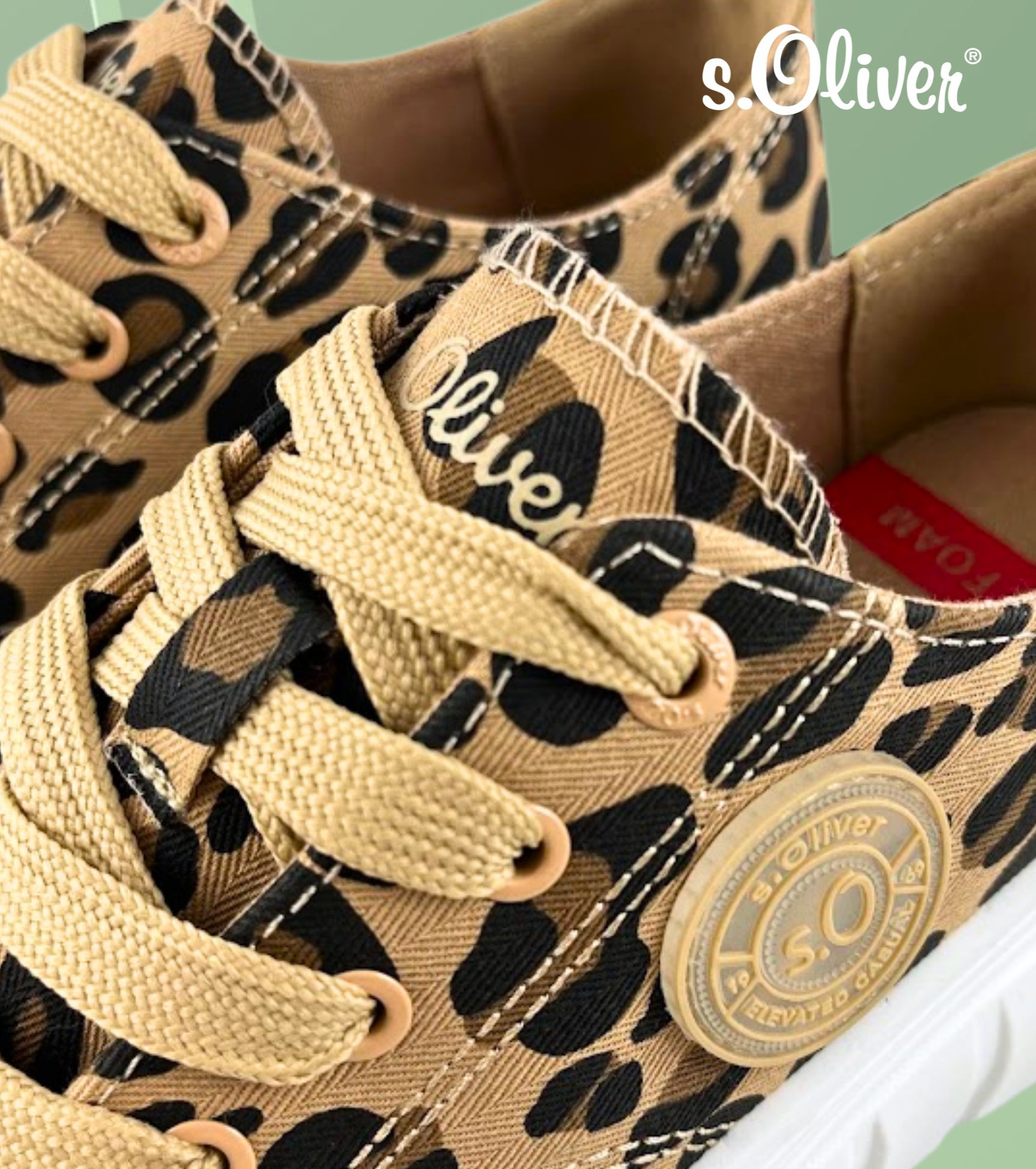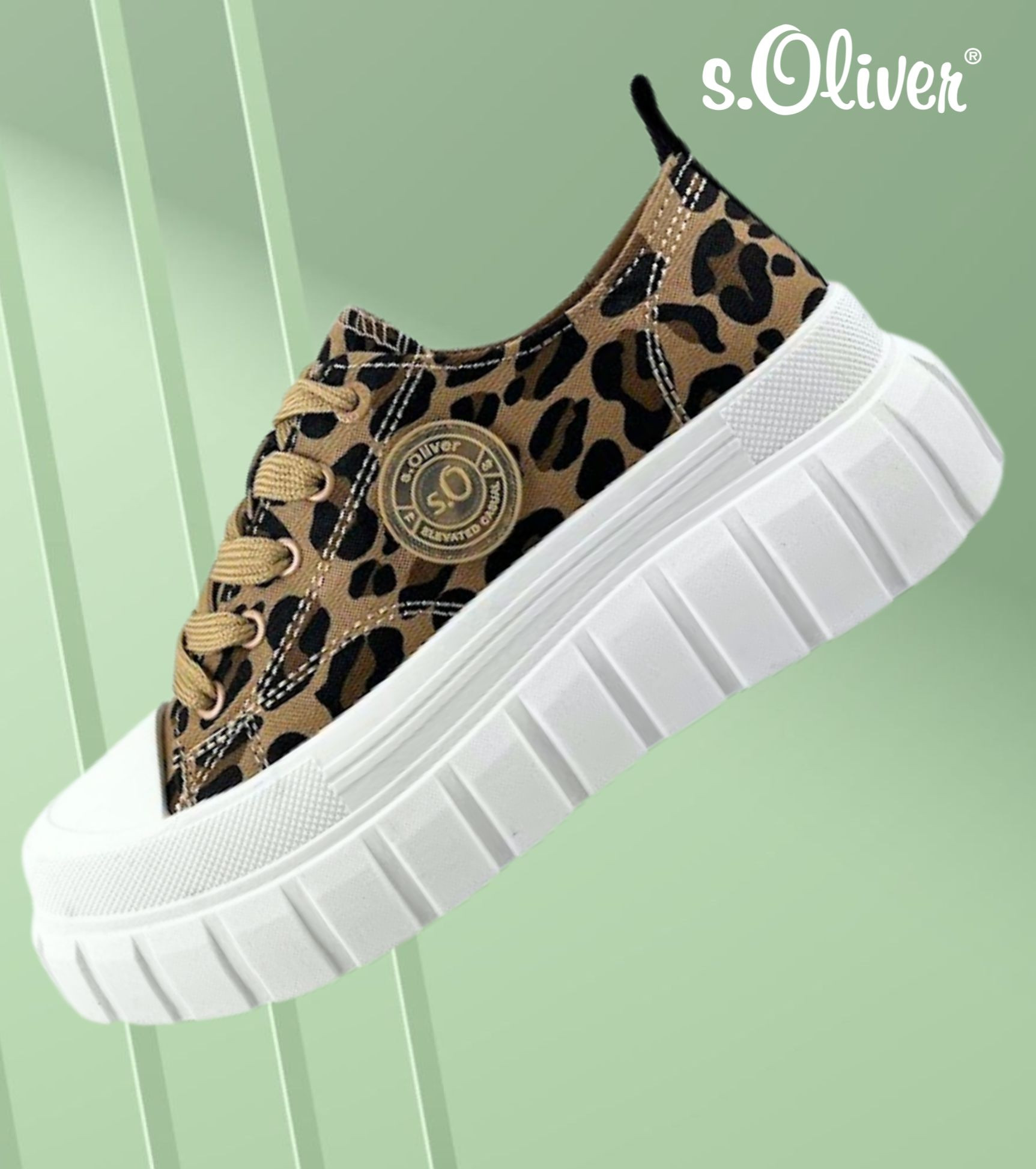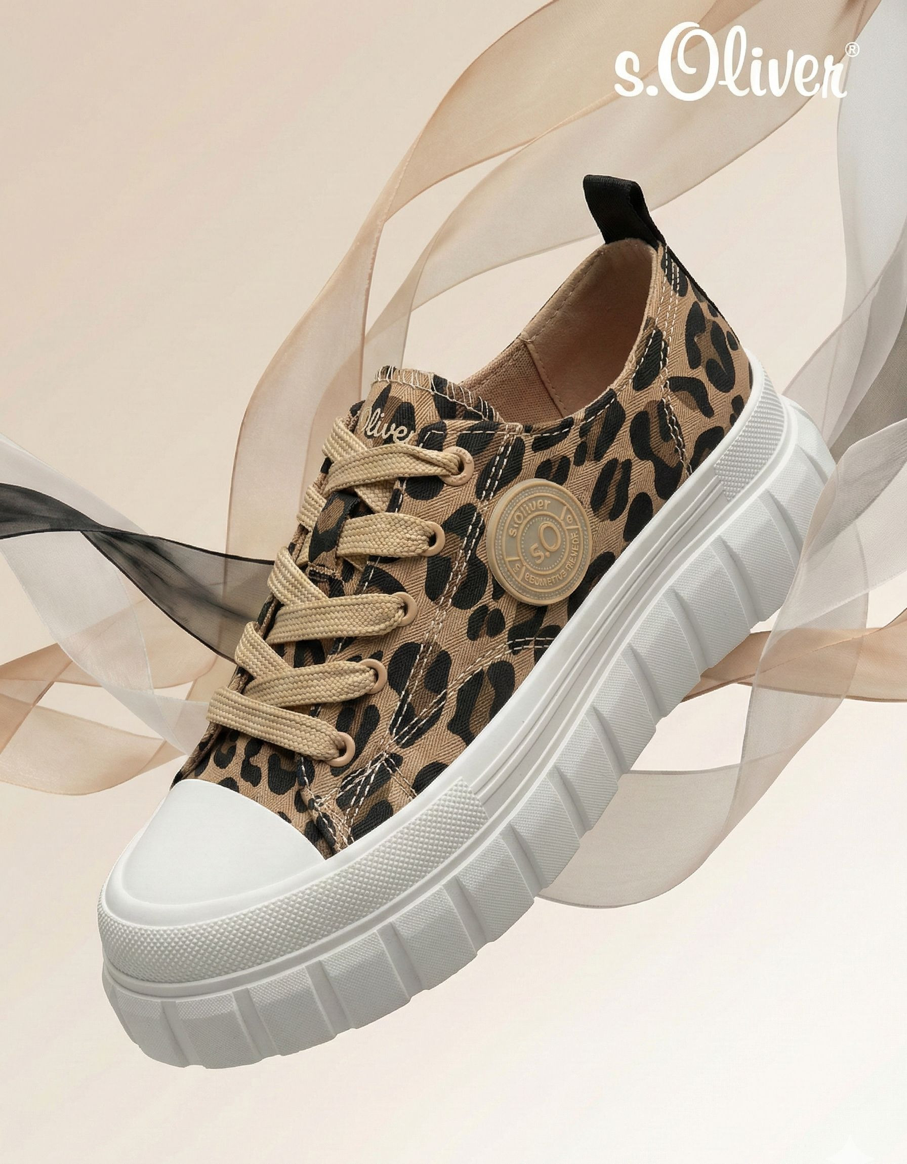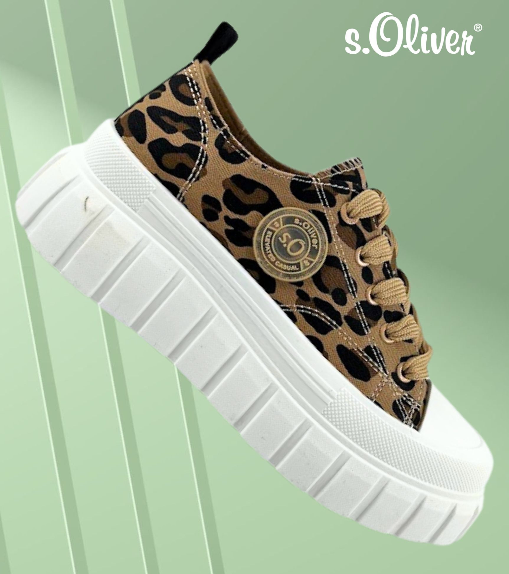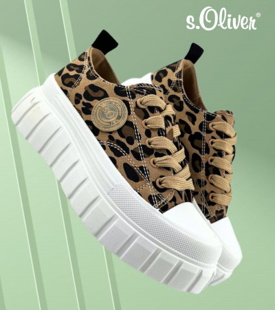 S.Oliver női leopárd mintás textil sneaker; kényelmes talpbéléssel; párnázott bokarésszel; fehér színű magasított gumis talprésszel, nyelvén és oldalán márkajelzéssel. Kényelmes, mindennapi viseletre ideális.