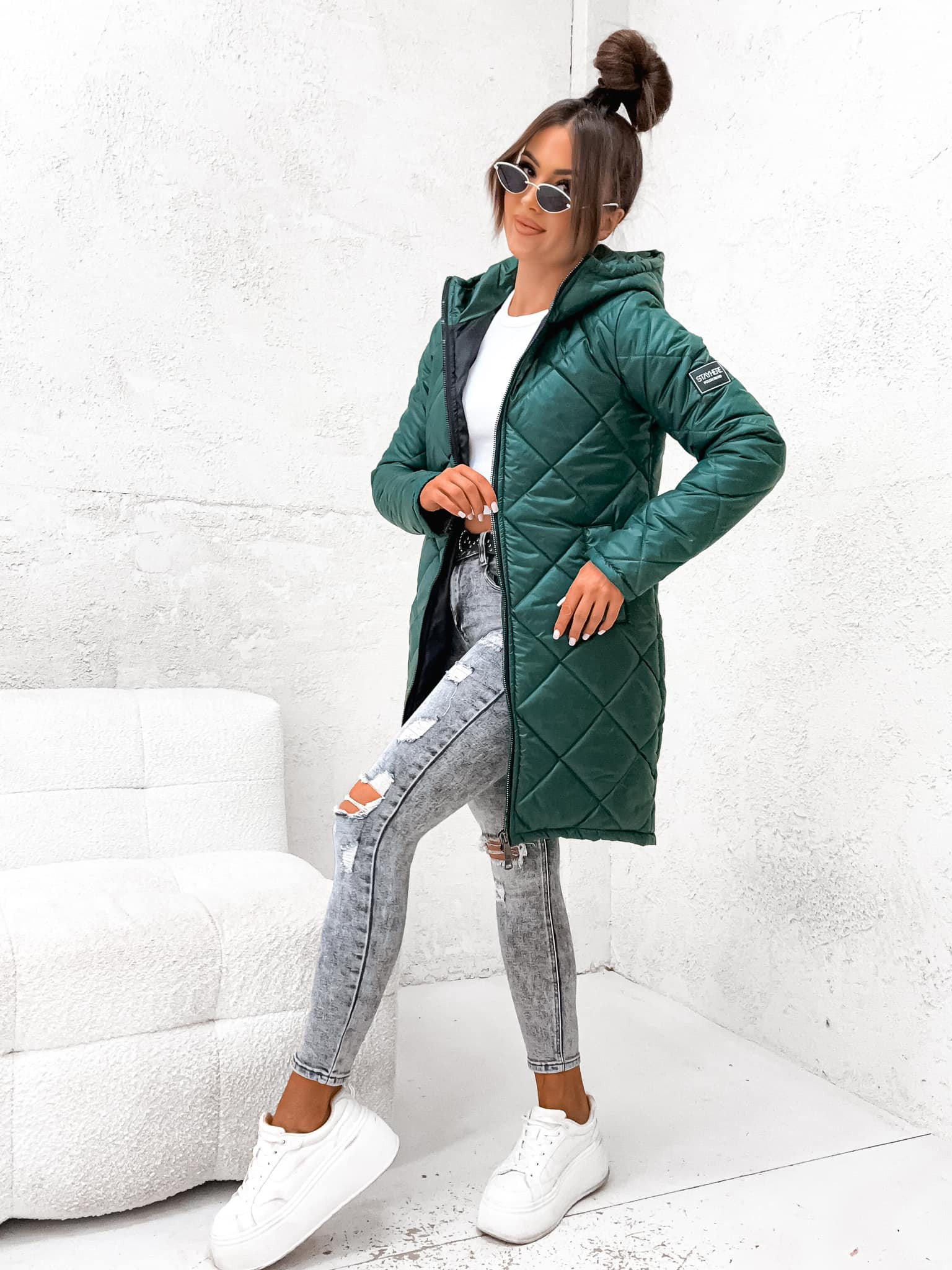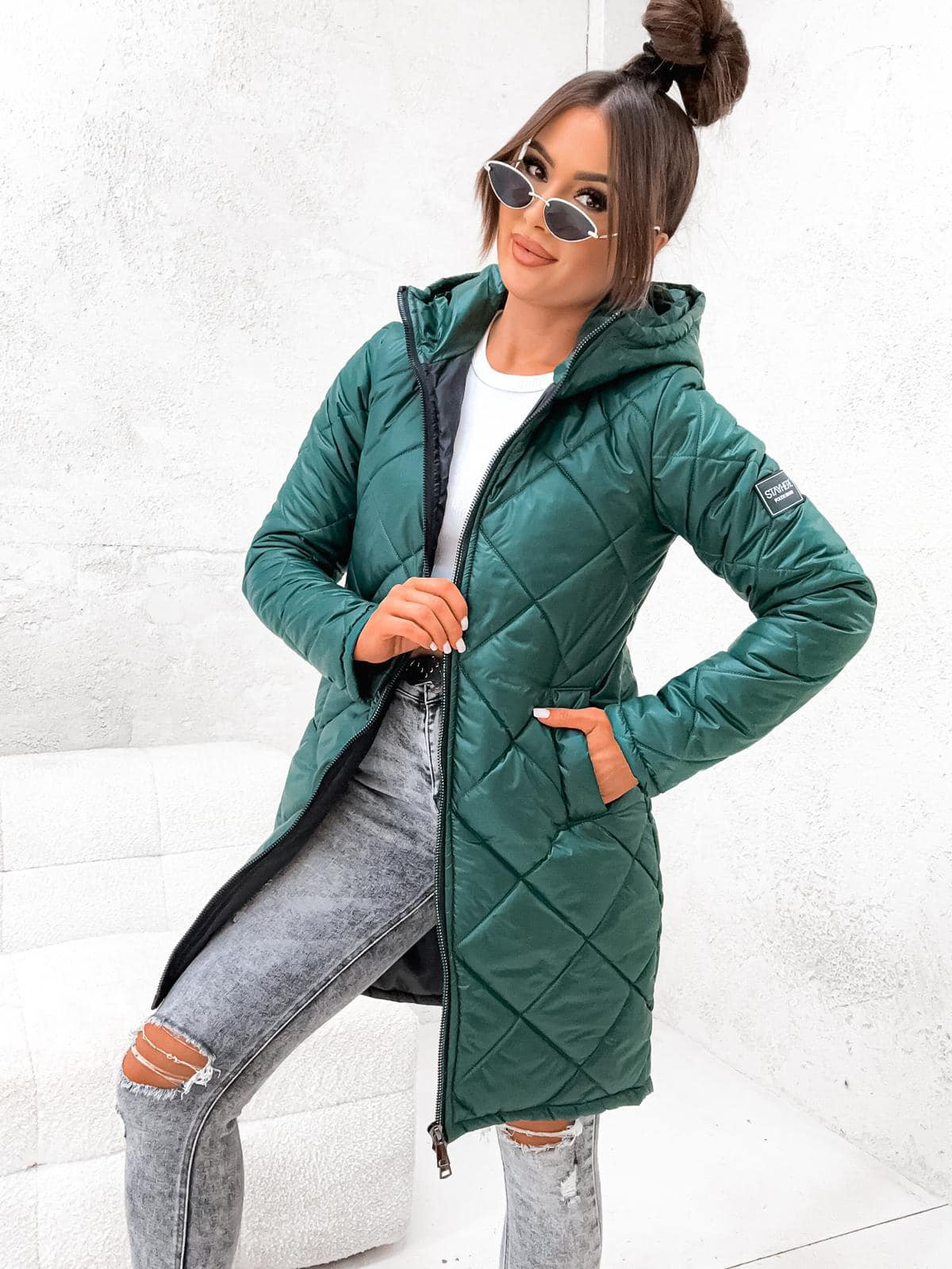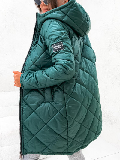 StayHere női steppelt kabát, zöld színben, fix kapucnival, elején cipzáras záródással, oldalzsebbel, hátul hosszított fazonban, ujján szilikon márkajelzéssel.