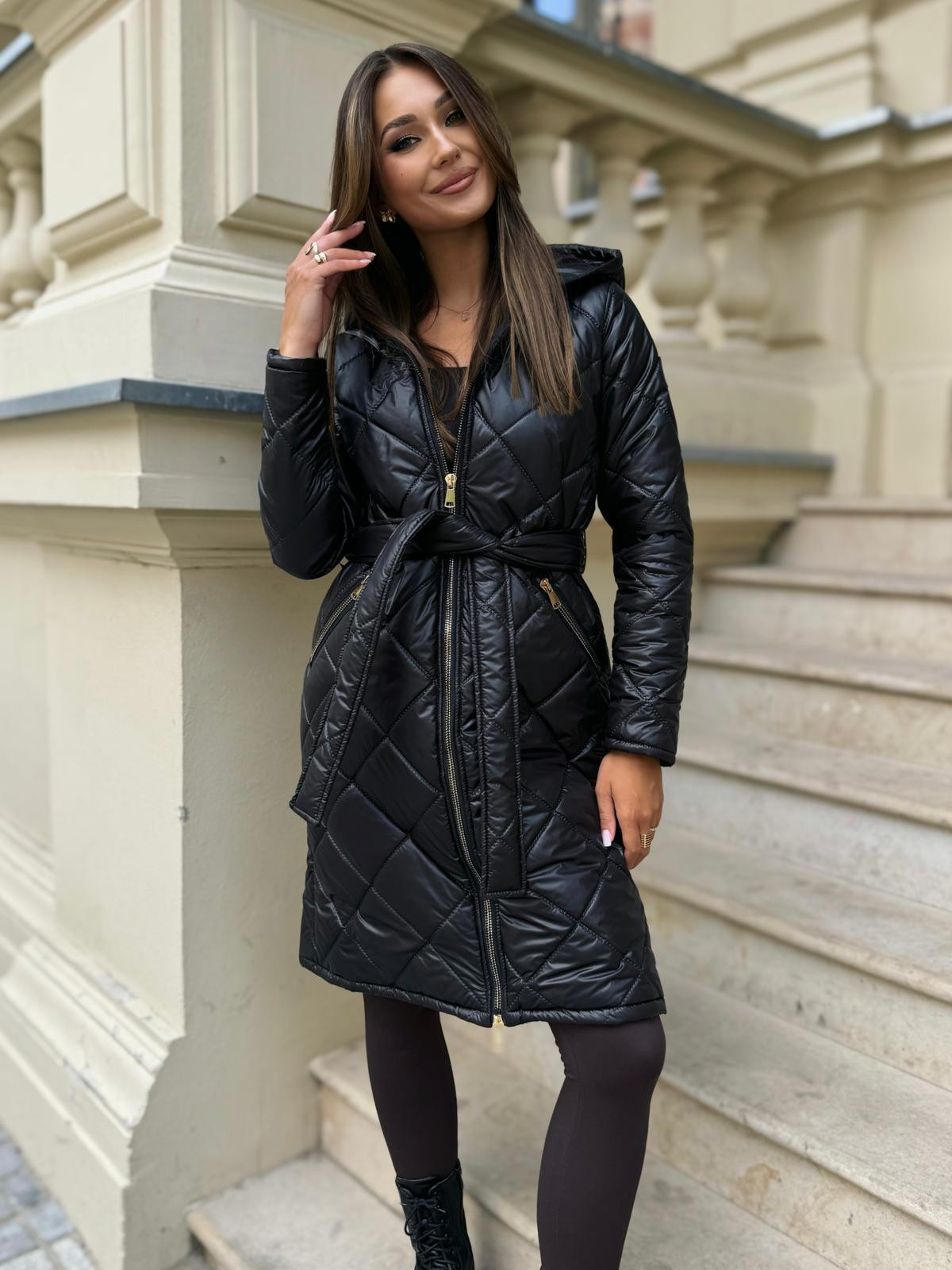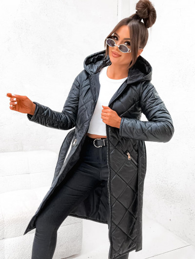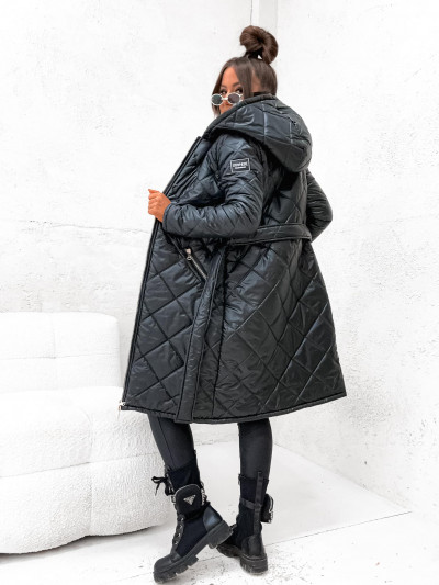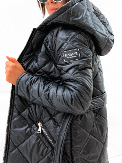 StayHere női steppelt kabát, fekete színben, fix kapucnival, elején cipzáras záródással és oldalzsebbel, derekán anyagából megkötővel, ujján szilikon márkajelzéssel.