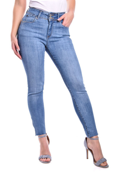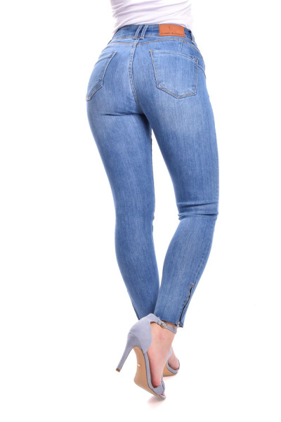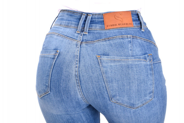 SymbolJeans női elasztikus farmernadrág, világoskék színben, szűk szárral, övbújtatós derékrésszel, elején cipzáras és gombos záródással, klasszikus ötzsebes, eldolgozatlan szárvéggel és cipzáras díszítéssel, derekán rávarrt bőrhatású-, zsebén fém márkajelzéssel.