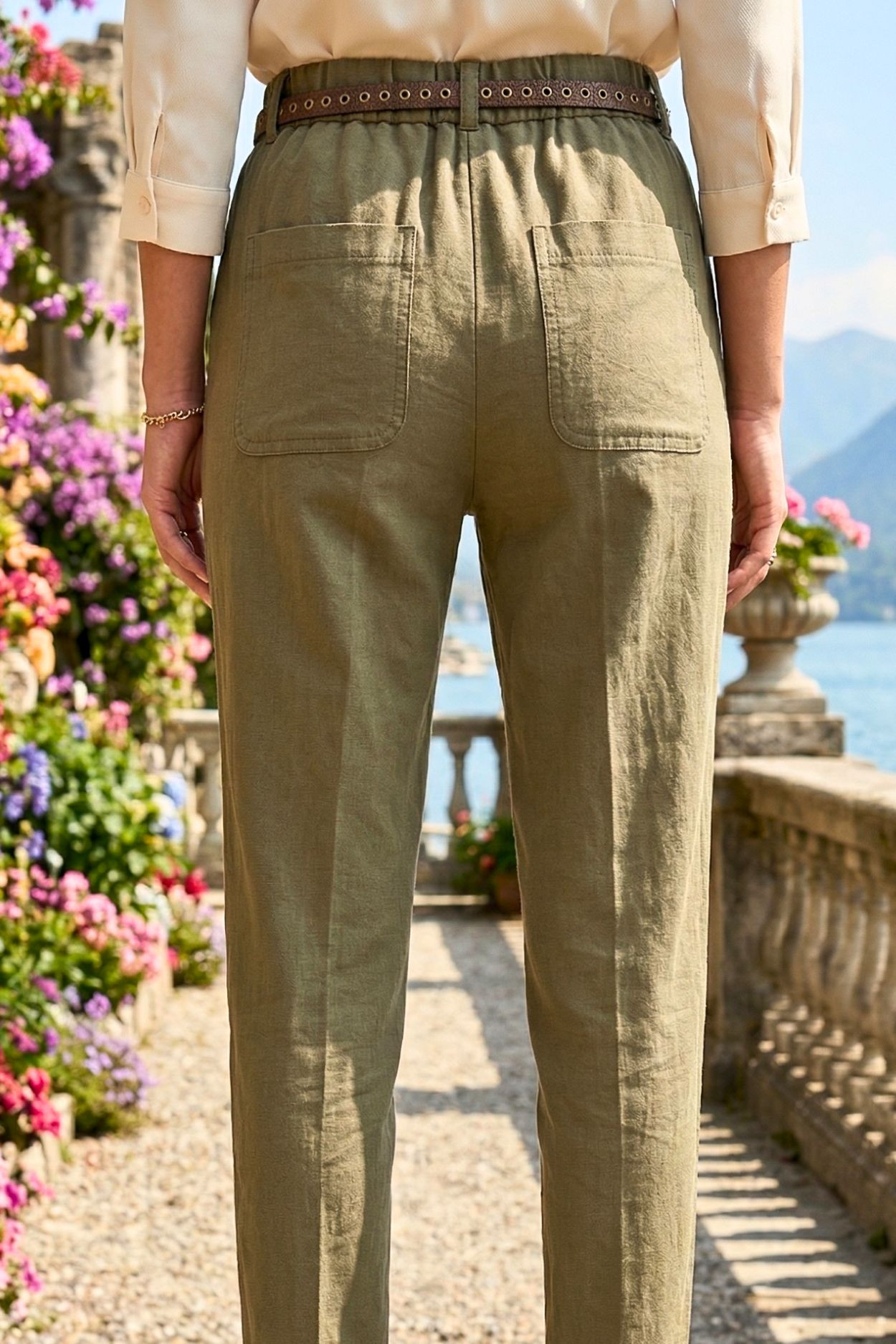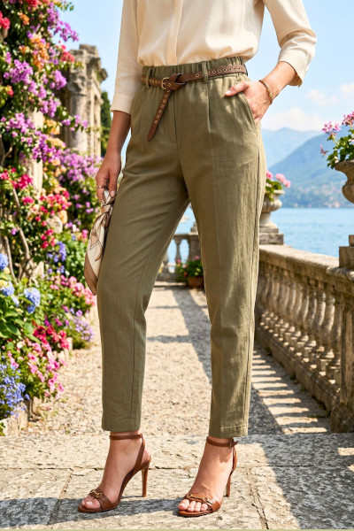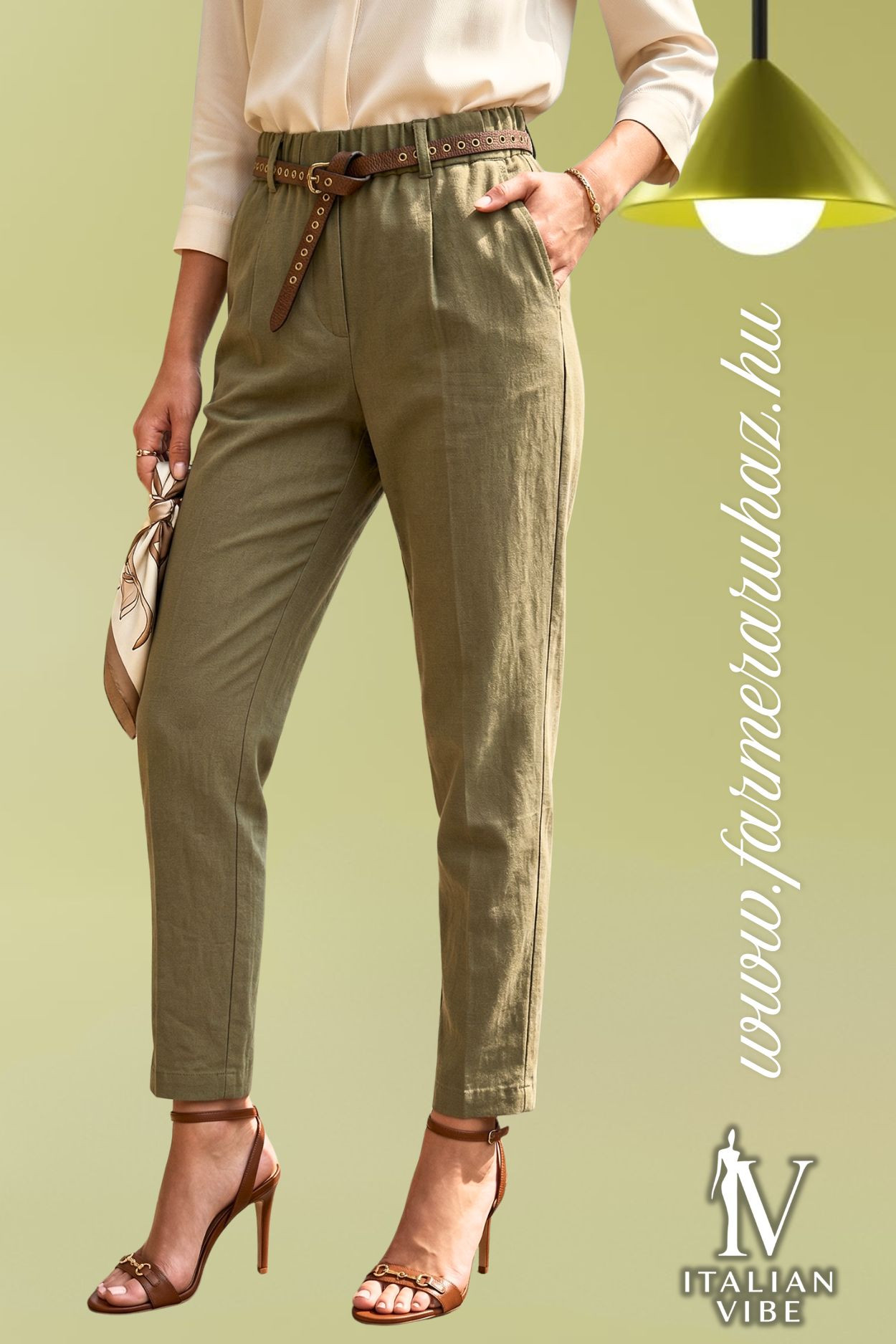 Italian Vibe - Paperbag - fazonú női elasztikus vászon nadrág, khaky színben. Gumis dereka övbújtatós, hozzá tartozó bőrhatású övvel, oldal és farzsebes.