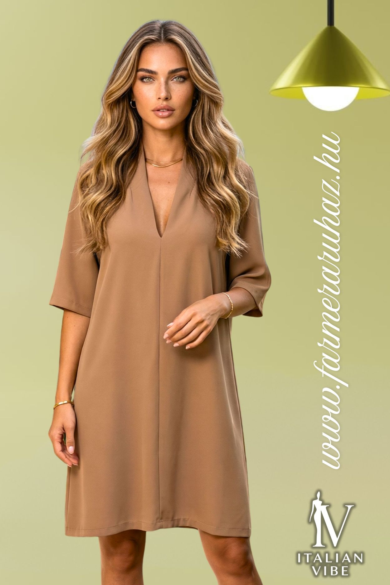 Italian Vibe egyenes szabású női ruha, kakaóbarna színben, 3/4-es ujjal, V-kivágással.