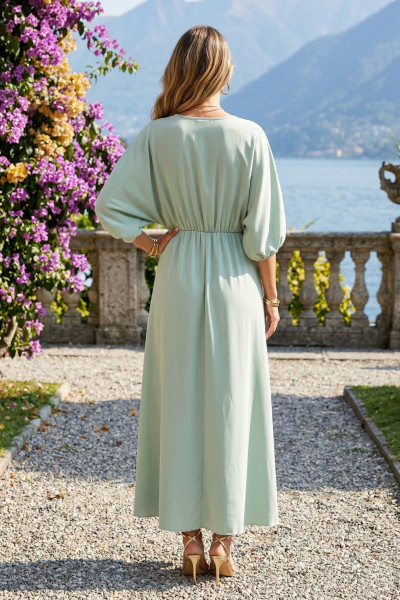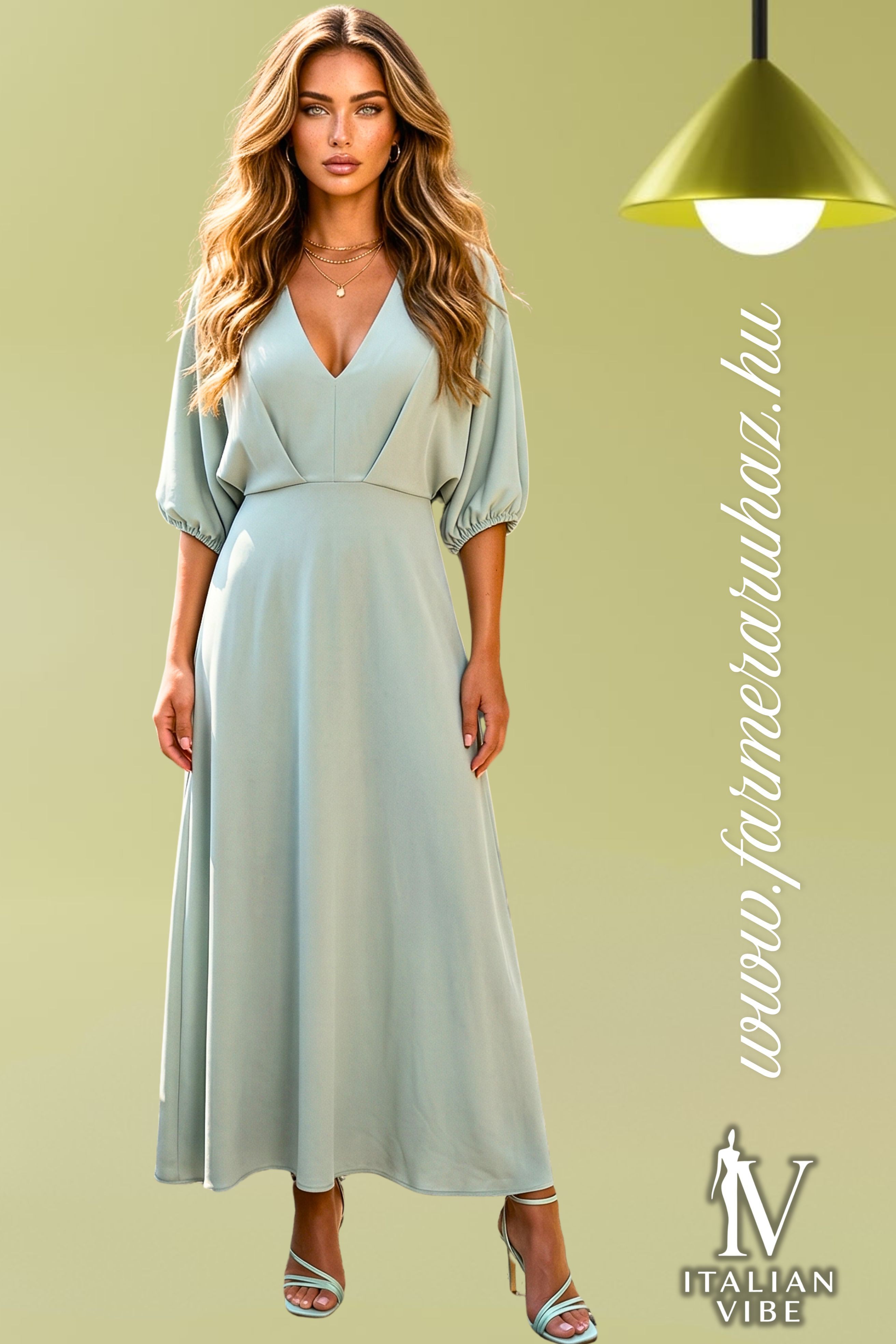 Italian Vibe női ruha, jadezöld színben. Gumis derékkal, A vonalú szoknyával, V kivágott, gumis denevérujjú felső résszel.