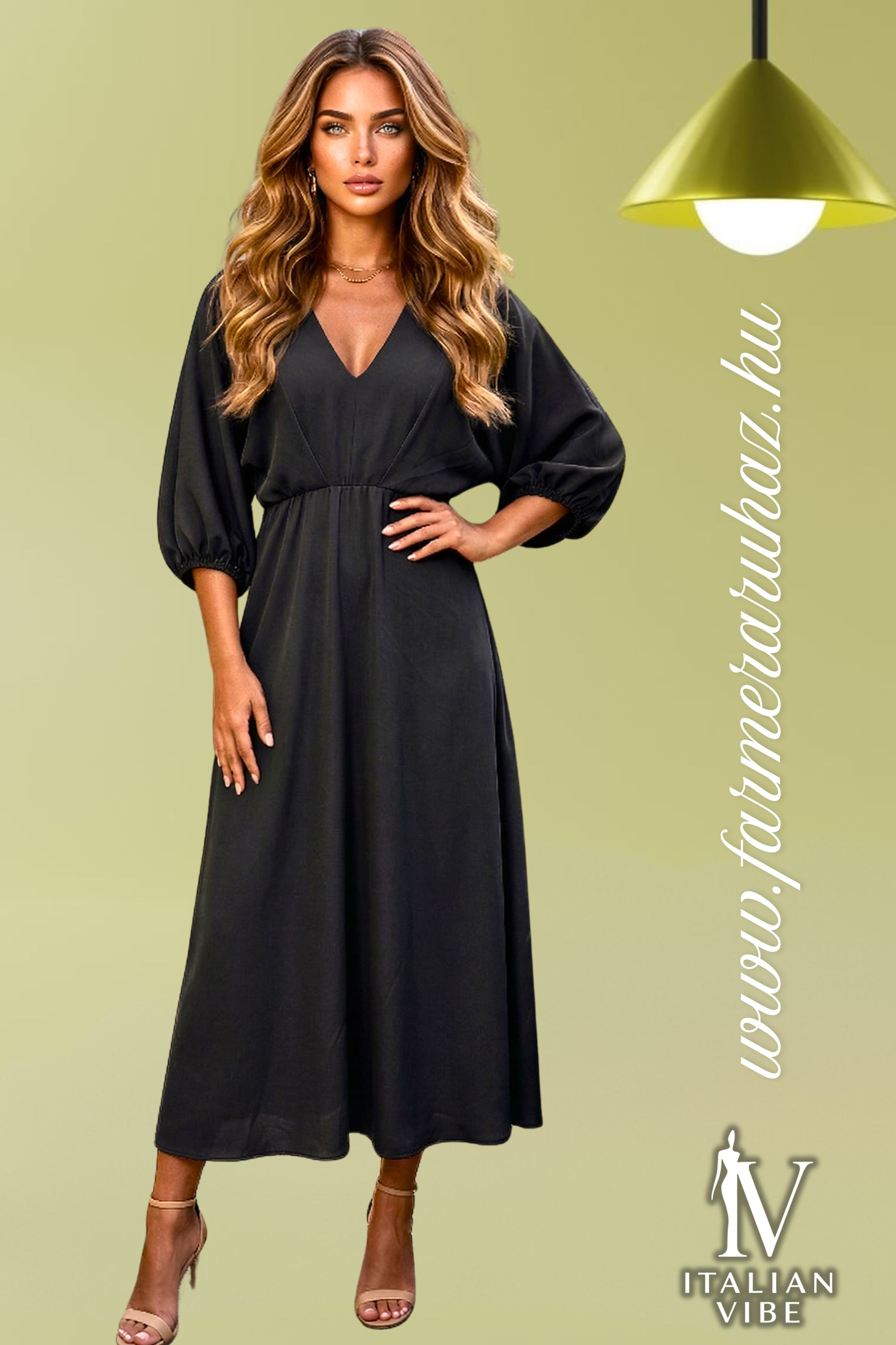 Italian Vibe női ruha, fekete színben. Gumis derékkal, A vonalú szoknyával, V kivágott, gumis denevérujjú felső résszel.