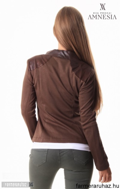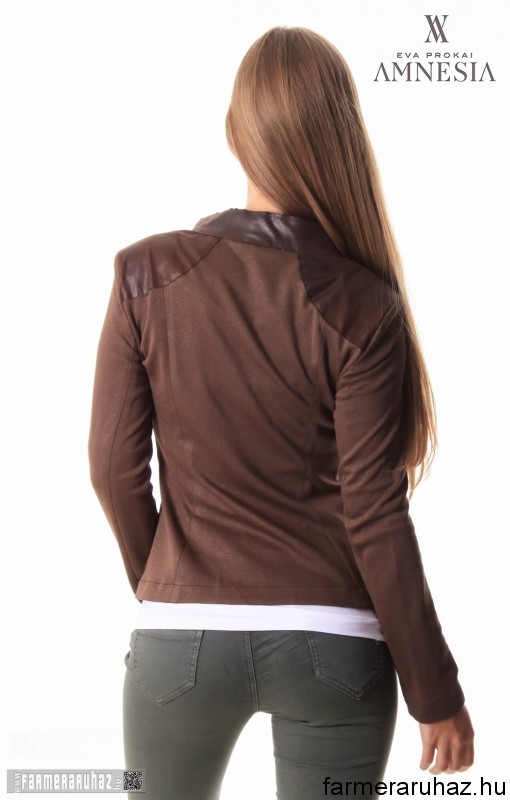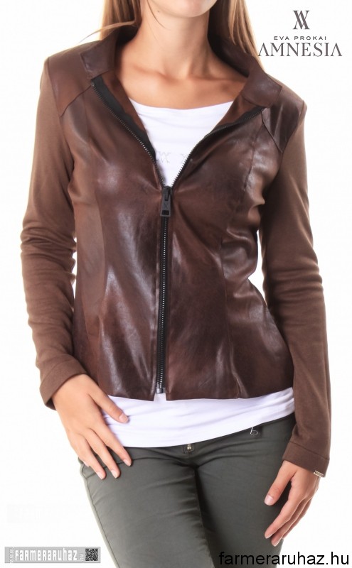 Amnesia Fashion - Eva Prokai bőrhatású blézer (Labelly), barna színben, elején zipzáras, ujján fém márkajelzéssel a 2016. őszi Amnesia kollekcióból.