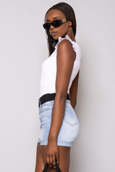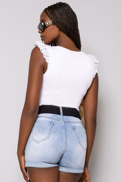 Amnesia Fashion - Eva Prokai felső, fehér színben, fodros és hímzett ujjal, nyaki részén fém márkajelzéssel.