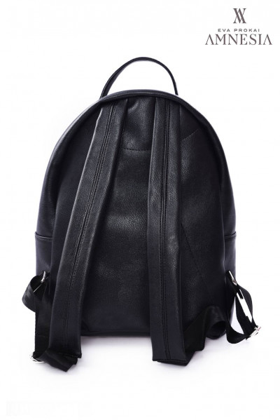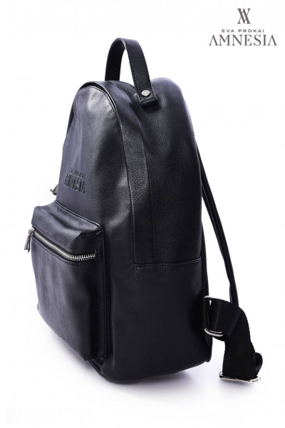 Amnesia Fashion - Eva Prokai - hátizsák fekete színben, bőrhatású anyagból, zipzáros záródással, egyterű belsőrésszel, belsejében egy darab zipzáros rekesszel, elején egy kis méretű zipzáros rekesszel, állítható vállpánttal, elején nyomott márkajelzéssel a tavaszi Amnesia kollekcióból.