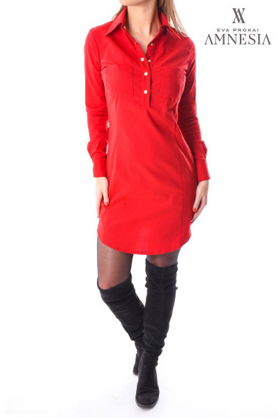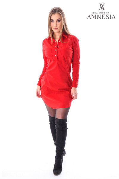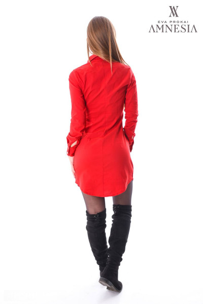 Amnesia Fashion - Eva Prokai ingtunika (Eskeli) piros színben, galléros nyakkal, mellzsebbel, márkajelzett patentokkal a téli Amnesia kollekcióból.