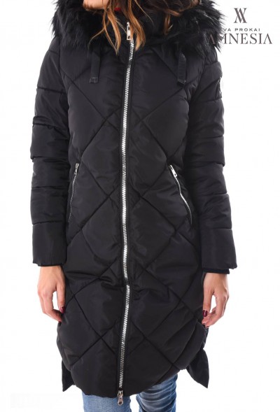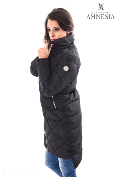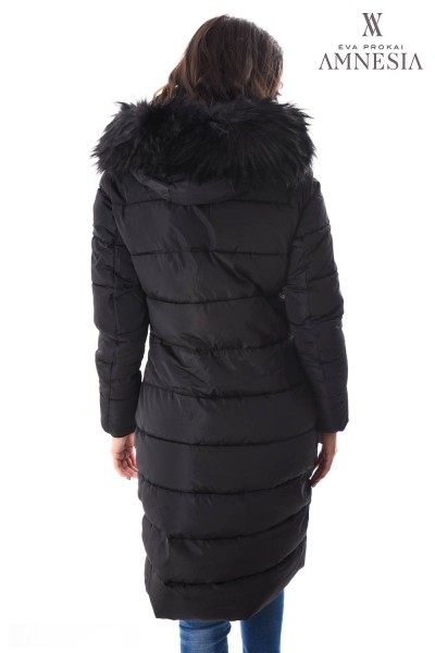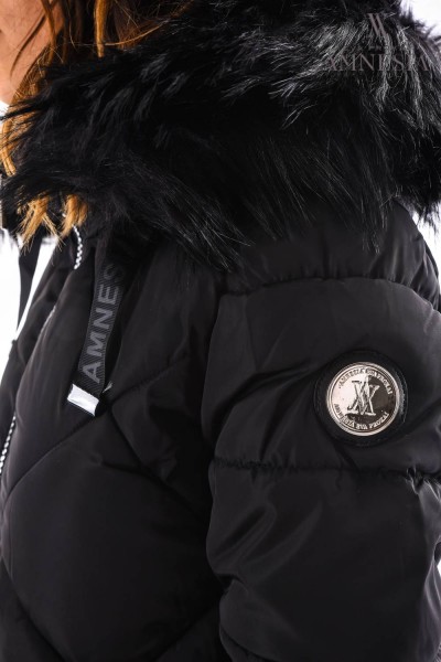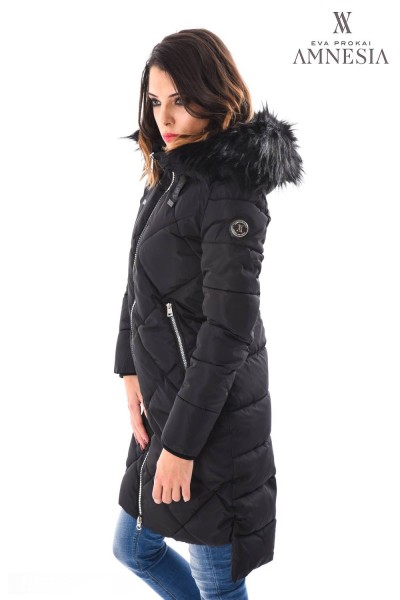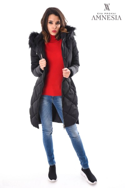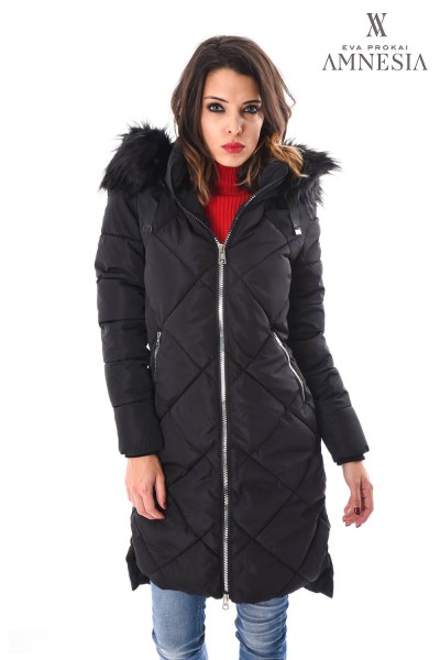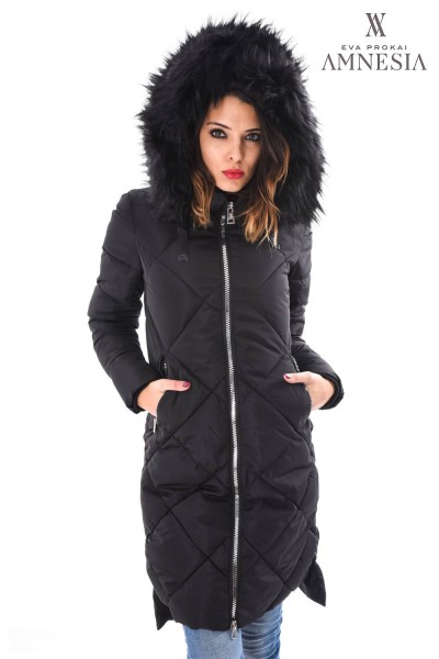 Amnesia Fashion - Eva Prokai négyzetesen steppelt kabát fekete színben, lezipzározható kapucnival és legombolható szőrmével, oldalzsebes, ujján fém márkajelzéssel az őszi/téli Amnesia kollekcióból.