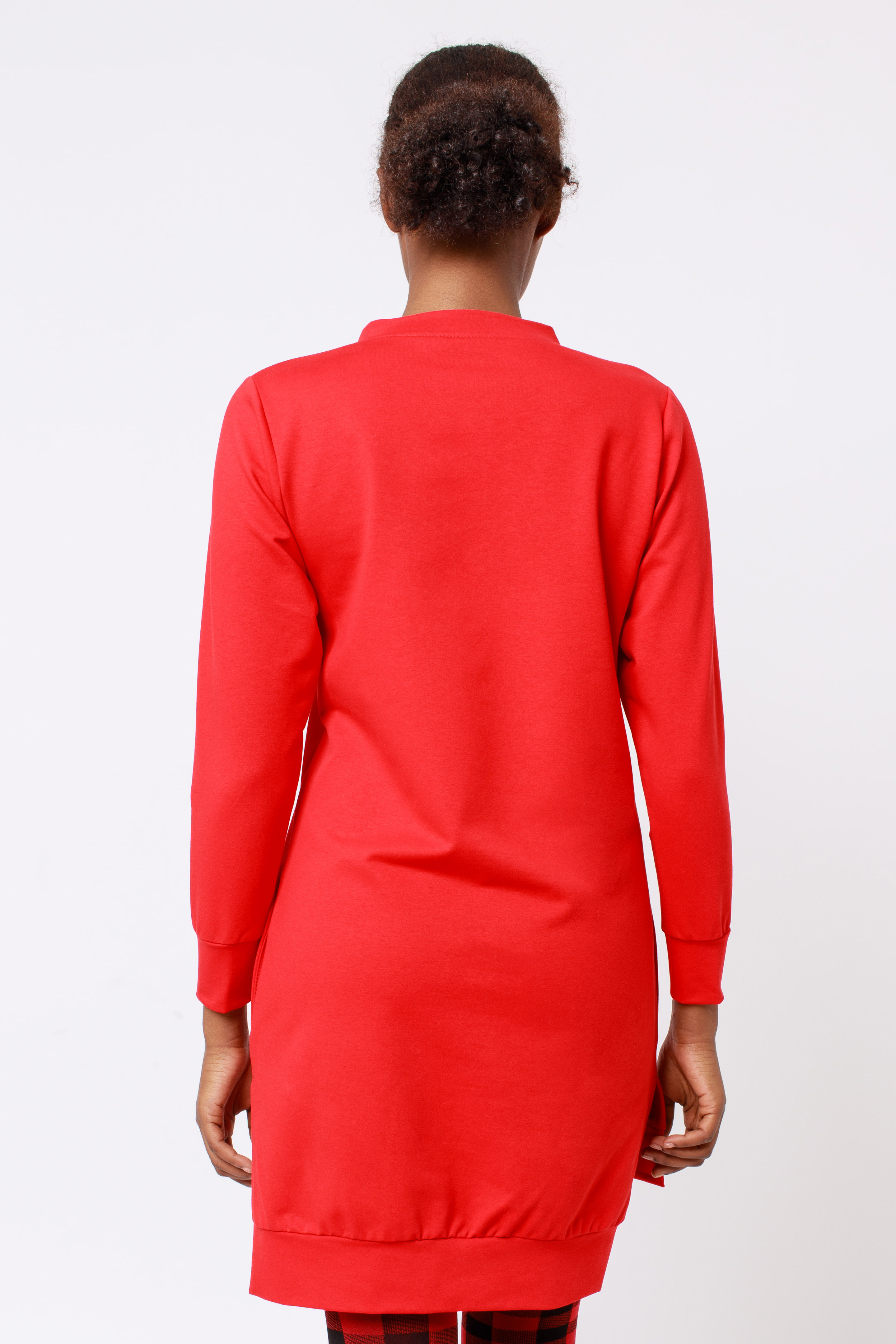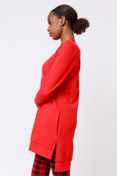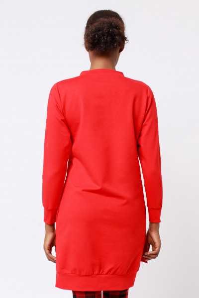 Amnesia Fashion - Eva Prokai tunika piros színben; kapucnival; passzés kézelővel; mindkét oldalán slicceléssel; oldalzsebekkel; hátul enyhe hosszítással; mell részén filmnyomott karácsonyi mintával az őszi/téli Amnesia kollekcióból.