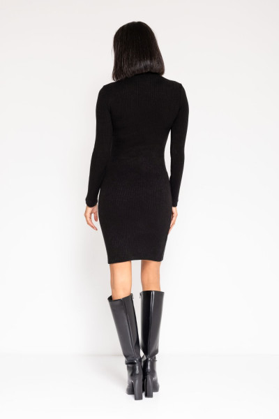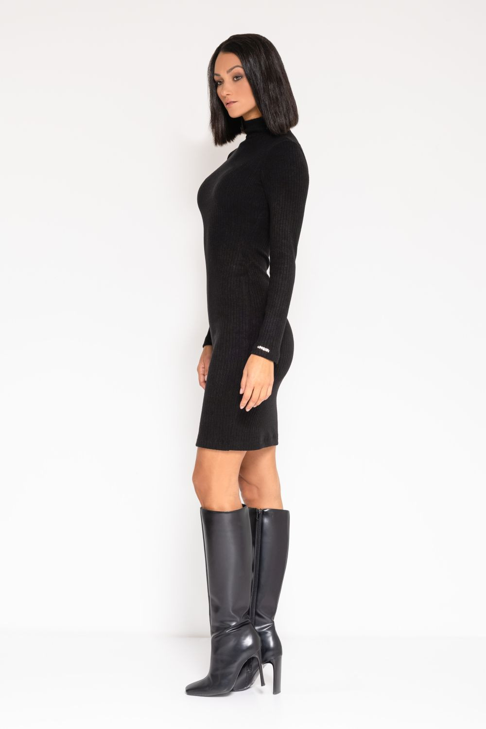 Amnesia Fashion - Eva Prokai kötött ruha, fekete színben, garbós nyakkal, karcsúsított fazonban, ujján apró fém márkajelzéssel.