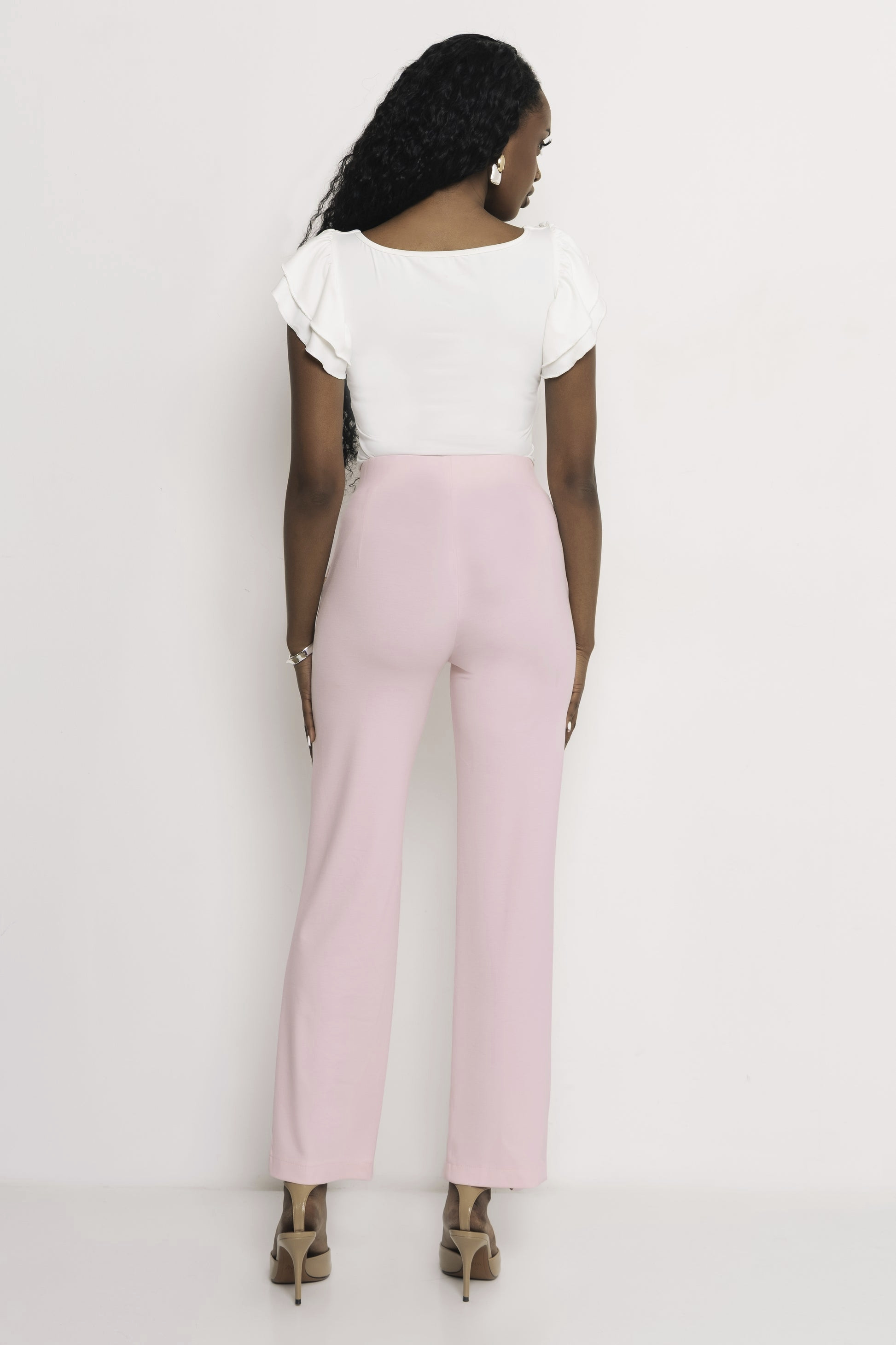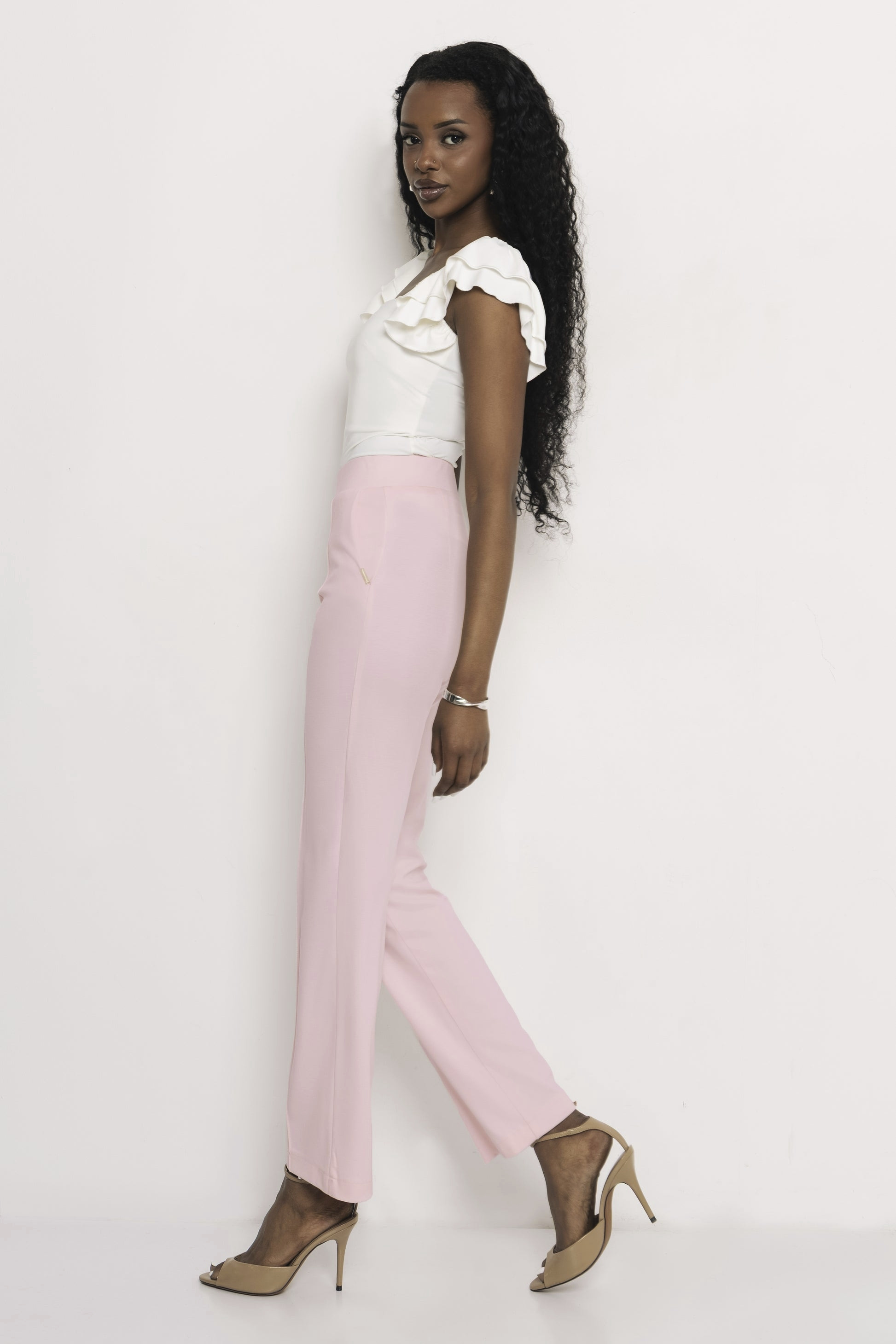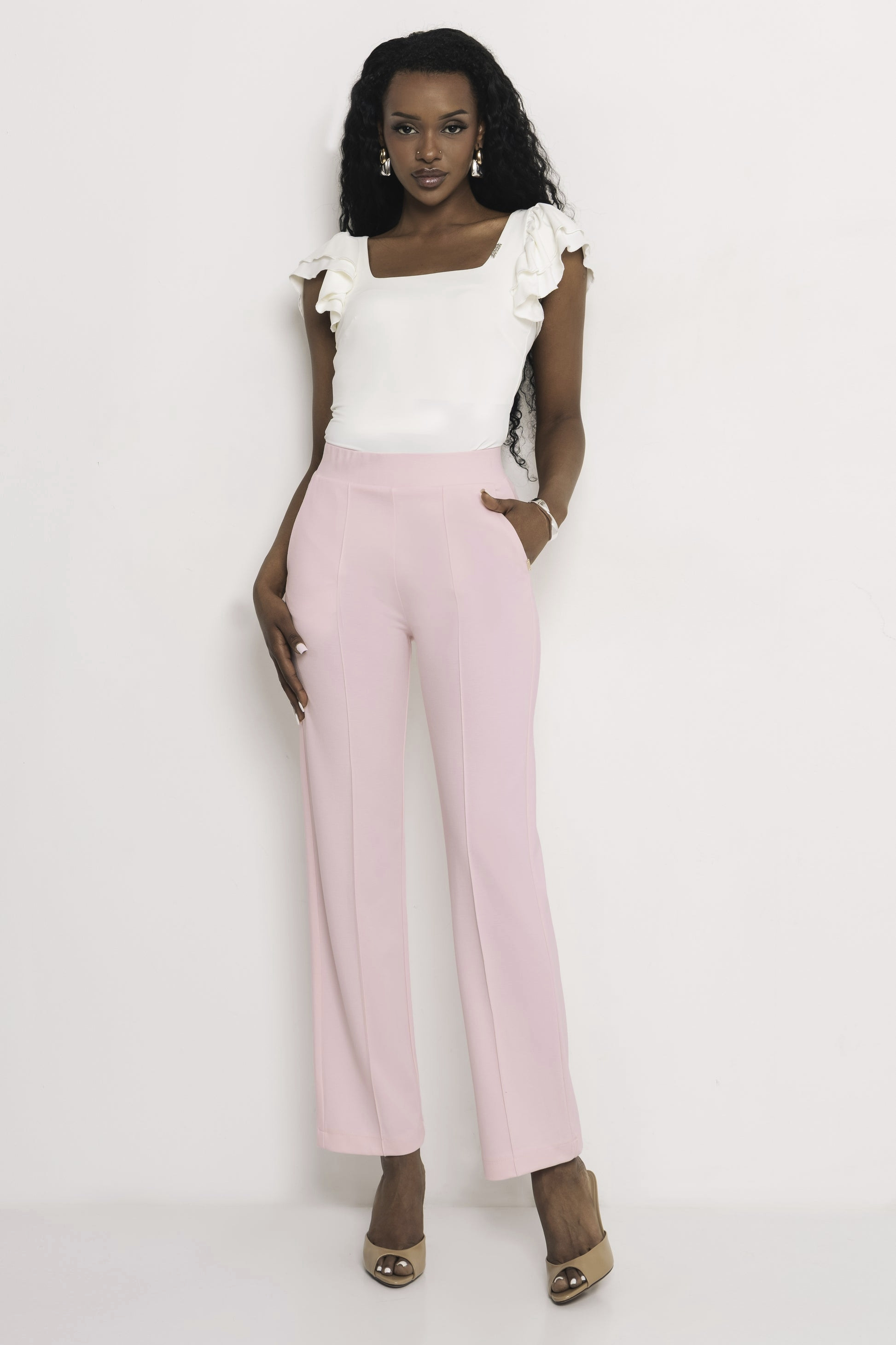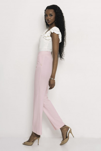 Amnesia elegáns vonalvezetésű puntó nadrág halvány rózsaszín színben; egyenes szárral; magasított, gumírozott derékkal; elején dísztűzéssel; oldalzsebekkel; rajta diszkrét fém márkajelzéssel.
