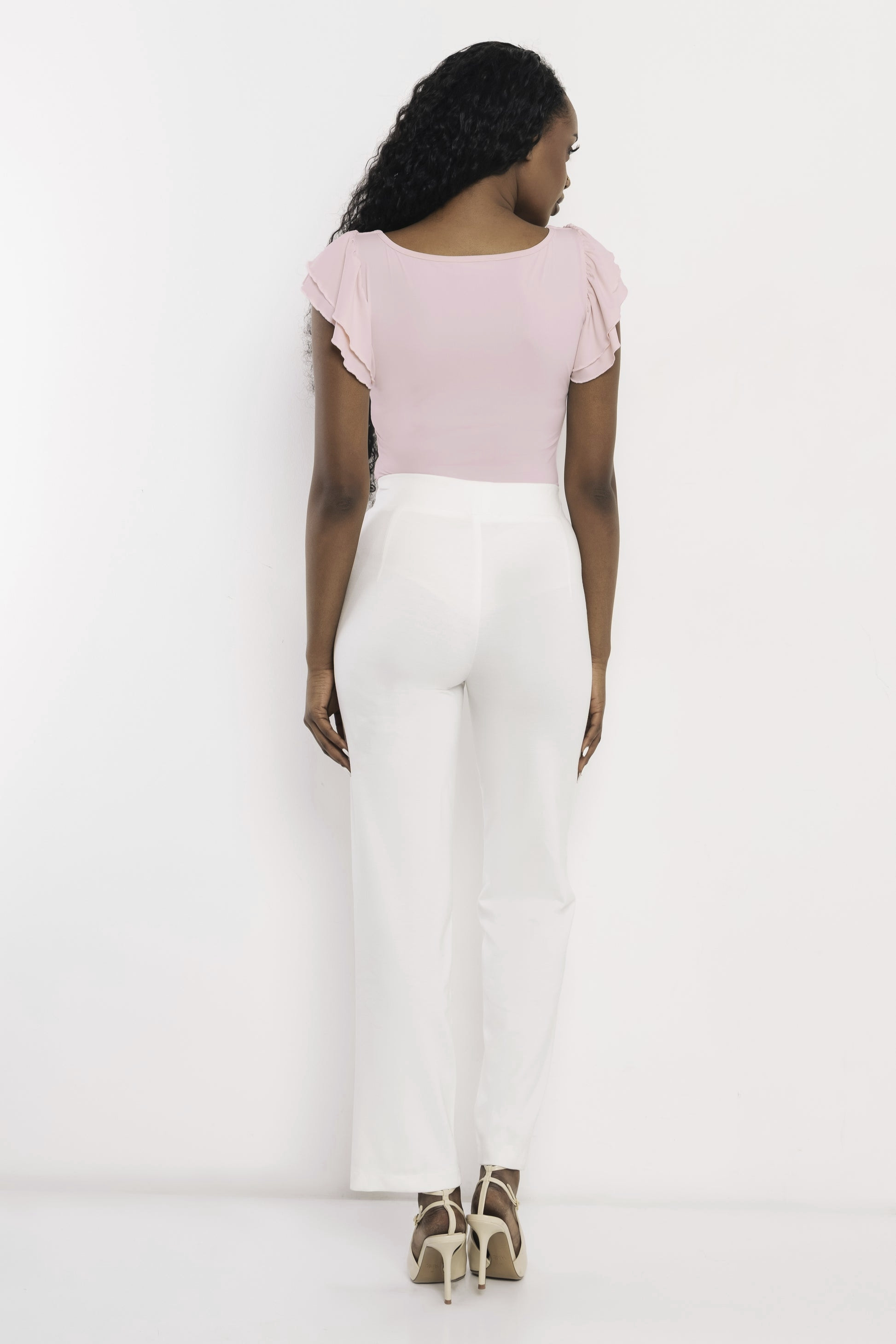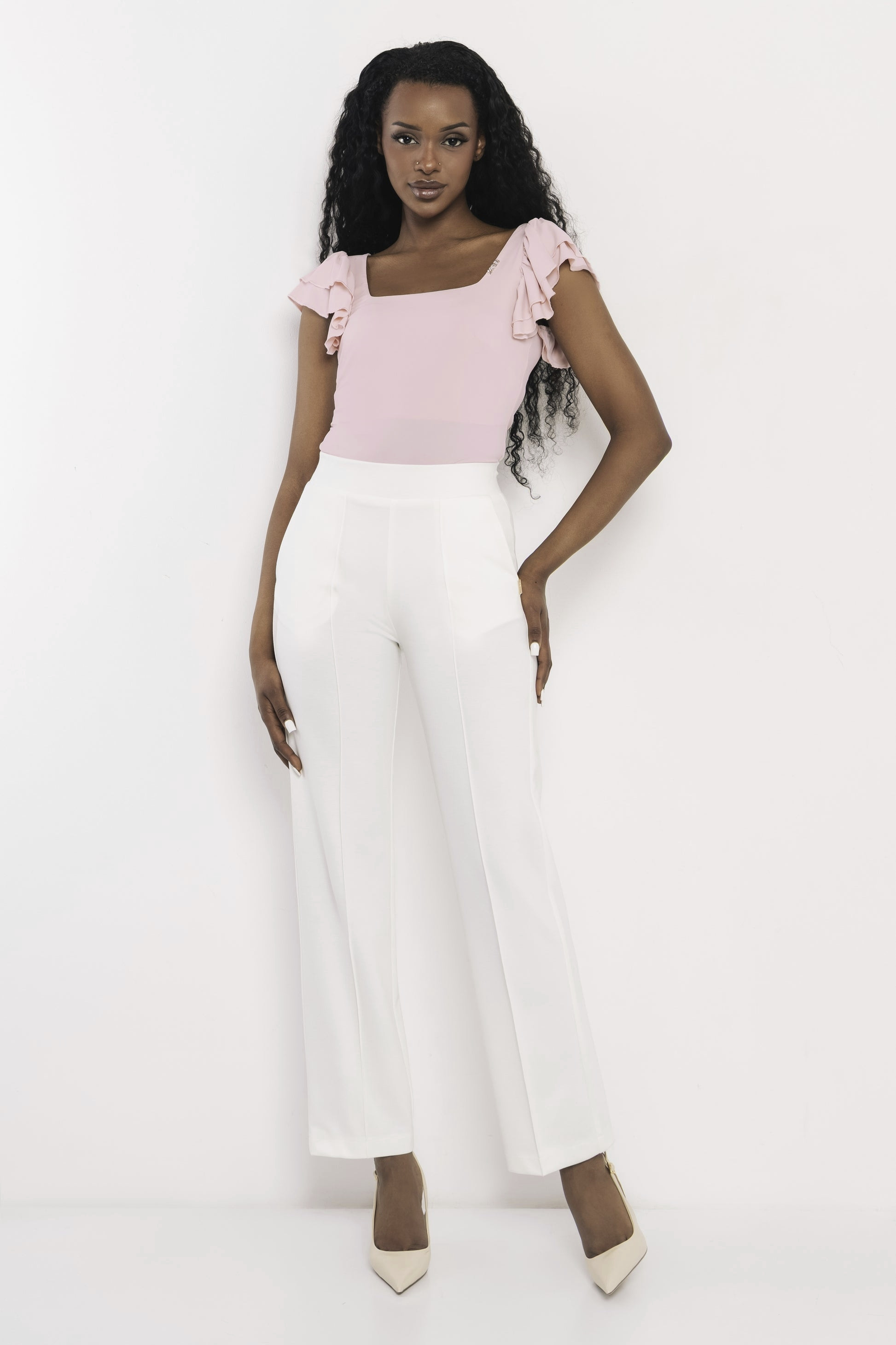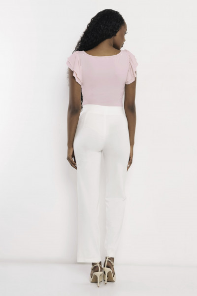 Amnesia elegáns vonalvezetésű puntó nadrág ekrü színben; egyenes szárral; magasított, gumírozott derékkal; elején dísztűzéssel; oldalzsebekkel; rajta diszkrét fém márkajelzéssel.