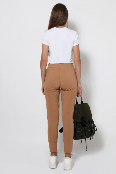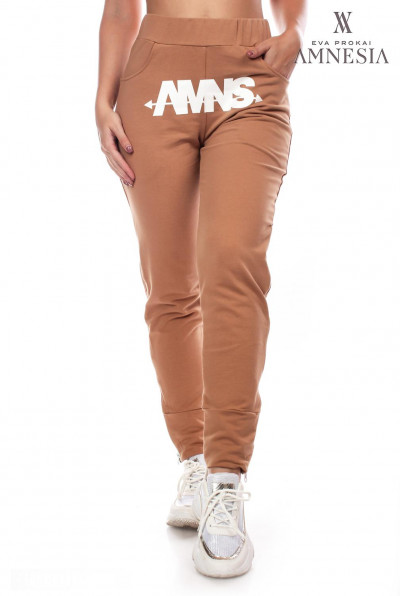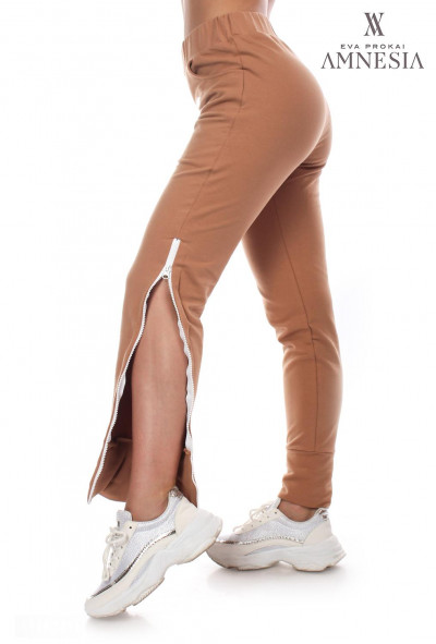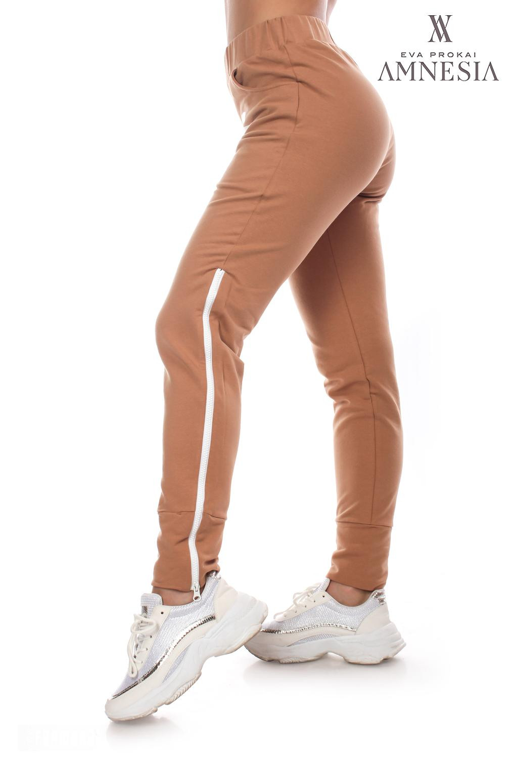 Amnesia Fashion - Eva Prokai - nadrág mogyoró színben; oldalzsebekkel; passzés szárral; szárában kontrasztos zipzárral; elején nagyméretű filmnyomott márkajelzéssel az őszi kollekcióból.