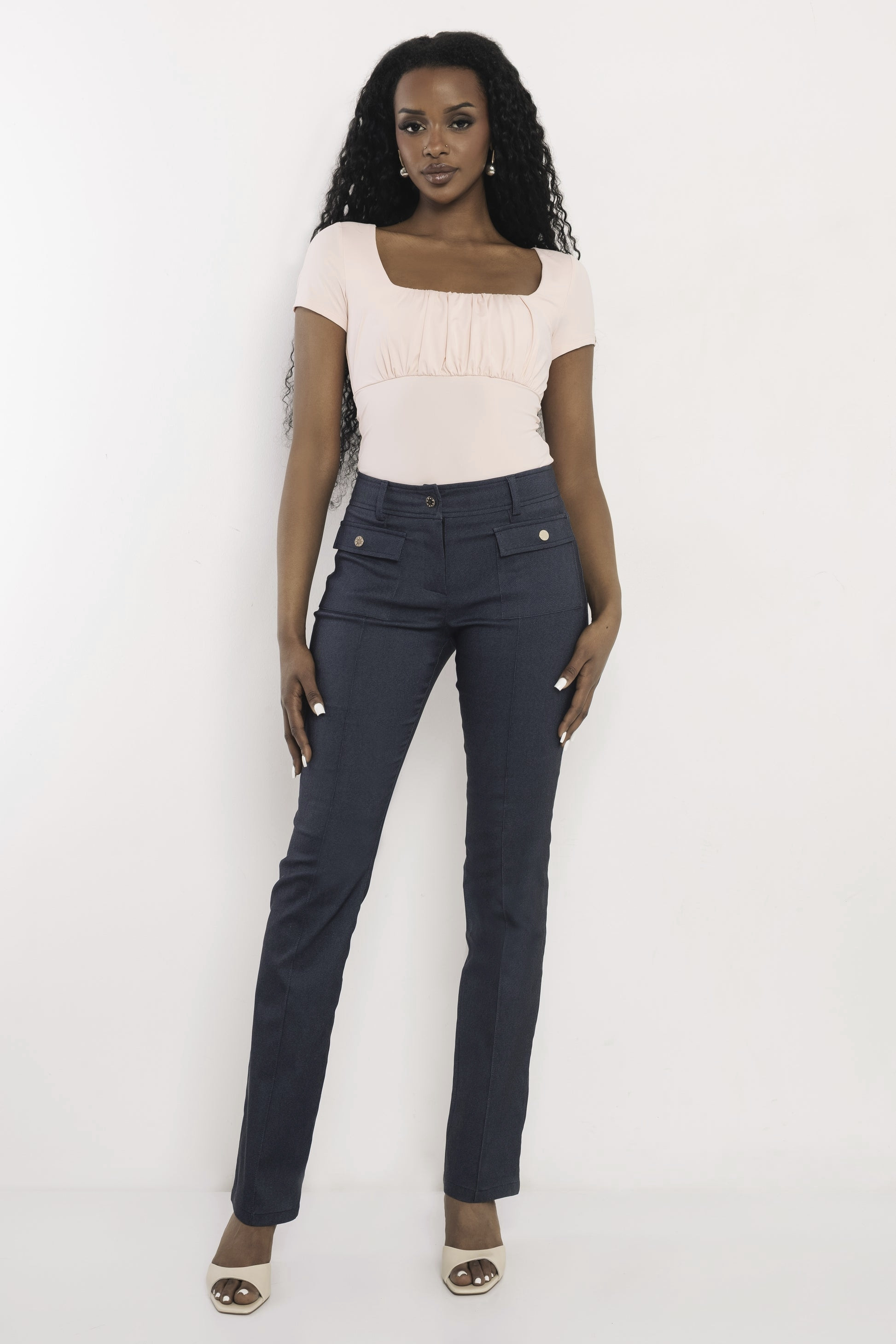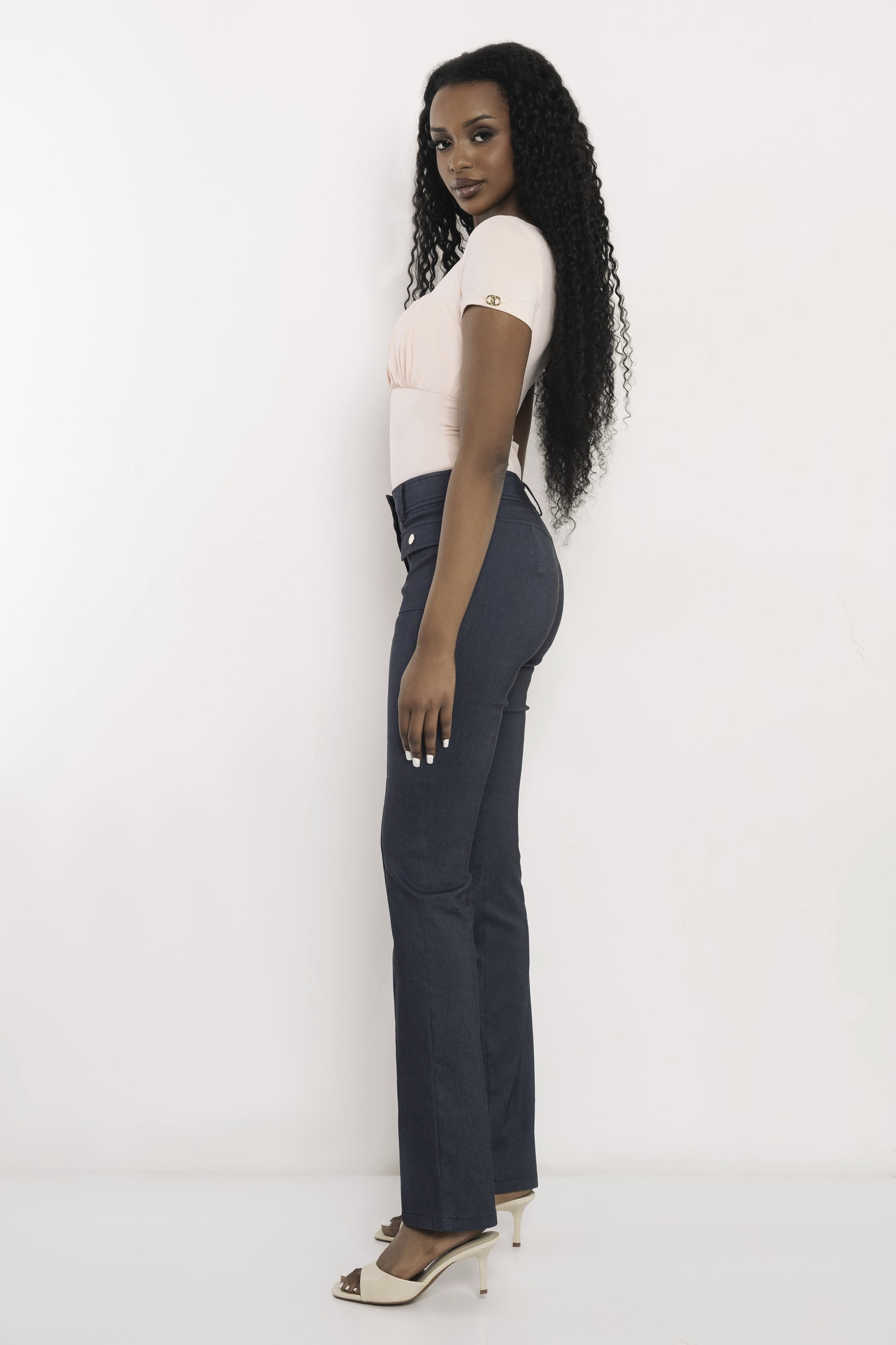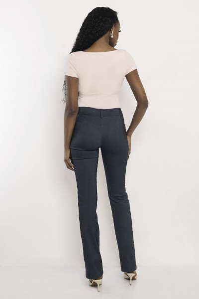 Amnesia bengalin nadrág sötét szürkéskék színben; denim hatással; elején dísztűzéssel; övbújtatós derékkal; patentos és zipzáros záródással; elején rávarrt zsebfedős zsebekkel; márkajelzett fémkellékekkel.