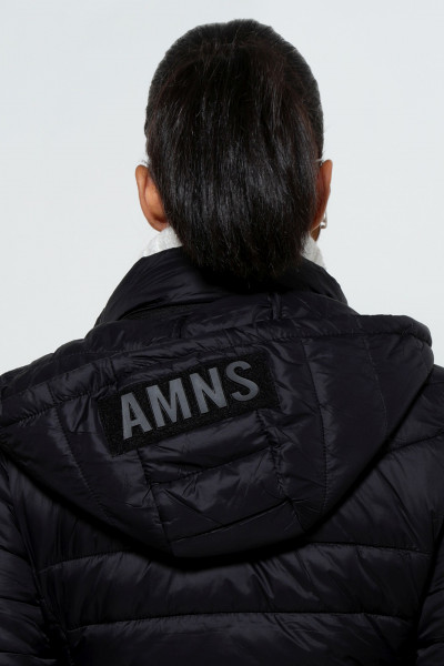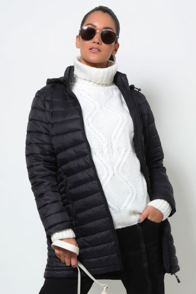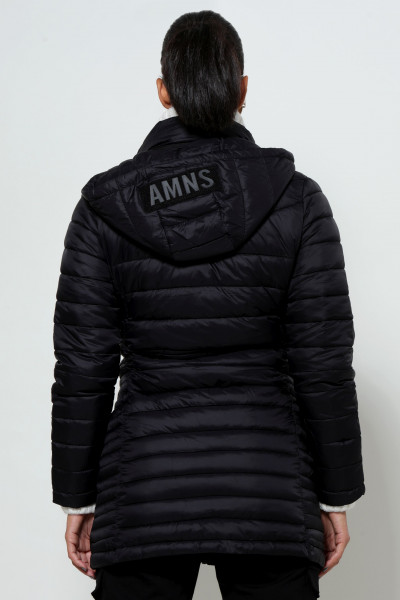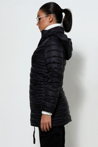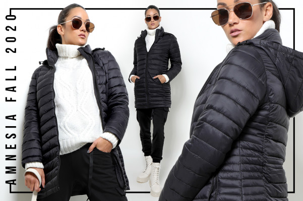 Amnesia Fashion - Eva Prokai őszi hosszú steppelt kabát, fekete színben, karcsúsított fazonban, eleje és oldalzsebei cipzárosak, márkajelzett kapucnija összehúzható és lecipzárolható az őszi Amnesia kollekcióból.