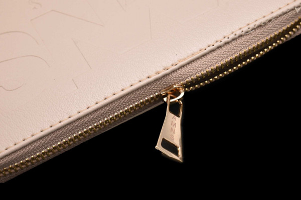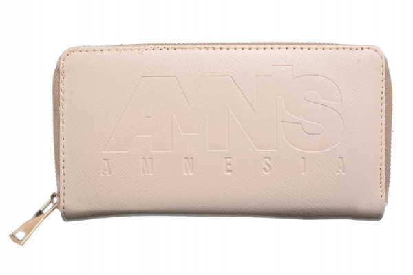Amnesia női pénztárca bőrhatású anyagból krém színben, cipzáros záródással, háromterű belsőrésszel, kártyatartóval, egy kisebb cipzáros rekesszel, elején nyomott márkajelzéssel a tavaszi Amnesia kollekcióból.